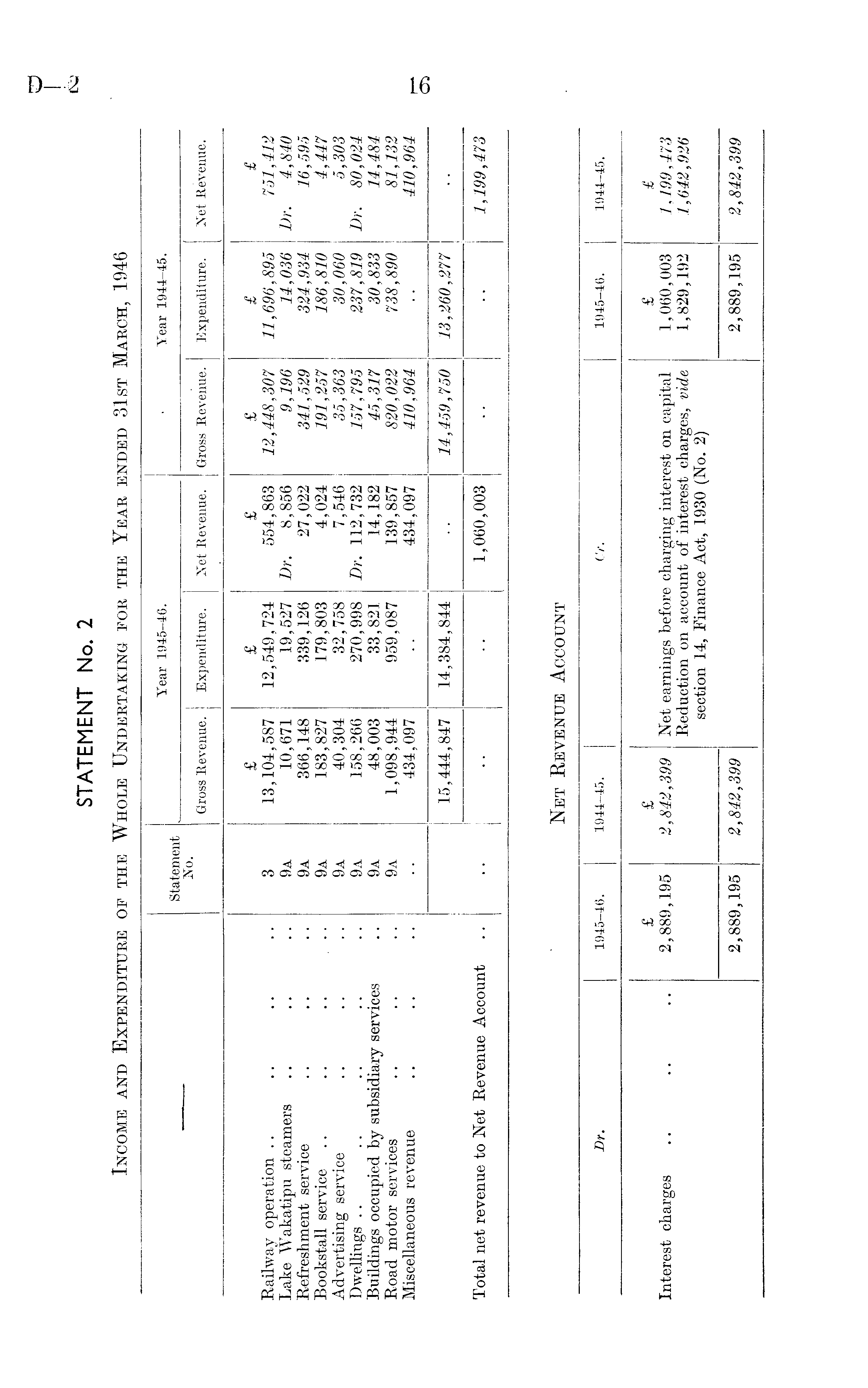 Statement Year 1045-46. Year 1944-45. No. Gross Revenue. Expenditure. Net Revenue. Gross Revenue. Expenditure. Net Revenue. Railway operation Lake Wakatipu steamers Refreshment service Bookstall service .. .. .. ... Advertising service Dwellings Buildings occupied by subsidiary services Road motor services Miscellaneous revenue 3 9a 9a 9a 9a 9a 9a 9a £ 13,104,587 10,671 366,148 183,827 40,304 158,266 48,003 1,098,944 434,097 £ 12,549,724 19,527 339,126 179,803 32,758 270,998 33,821 959,087 £ 554,863 Dr. 8,856 27,022 4,024 7,546 Dr. 112,732 14,182 139,857 434,097 £ 12,448,307 9,196 341,529 191,257 35,363 157,795 45,317 820,022 410,964 £ 11,696,895 14,036 324,934 186,810 30,060 237,819 30,833 738,890 £ 751,412 Dr. 4,840 16,595 4,447 5,303 Dr. 80,024 14,484 81,132 410,964 15,444,847 14,384,844 14,459,750 13,260,277 Total net revenue to Net Revenue Account 1,060,003 1,199,473
