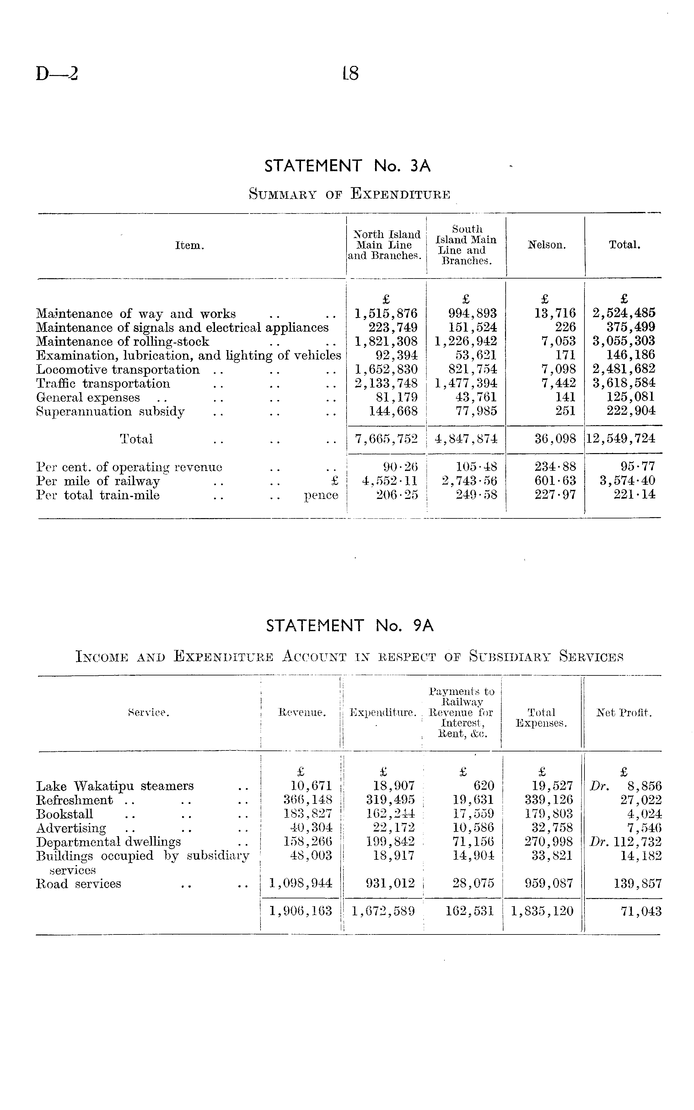 Item. North Island Main Line and Branches. South Island Main Line and Branches. Nelson. Total. Maintenance of way and works Maintenance of signals and electrical appliances Maintenance of rolling-stock Examination, lubrication, and lighting of vehicles Locomotive transportation Traffic transportation General expenses Superannuation subsidy £ 1,515,876 223,749 1,821,308 92,394 1,652,830 2,133,748 81,179 144,668 £ 994,893 151,524 1,226,942 53,621 821,754 1,477,394 43,761 77,985 £ 13,716 226 7,053 171 7,098 7,442 141 251 £ 2,524,485 375,499 3,055,303 146,186 2,481,682 3,618,584 125,081 222,904 Total 7,665,752 4,847,874 36,098 12,549,724 Per cent, of operating revenue Per mile of railway Per total train-mile !! £ pence 90-26 4,552-11 206-25 105-48 2,743-56 249-58 234-88 601-63 227-97 95-77 3,574-40 221-14