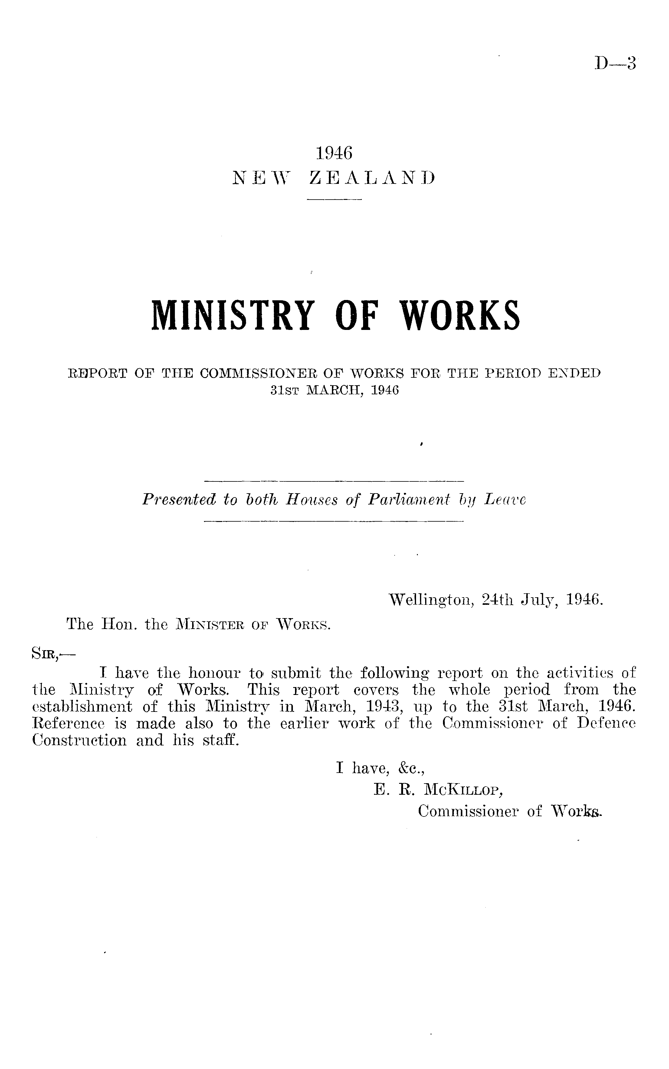 Wellington, 24th July, 1946. The Hon. the Minister of Works. Sir, — I have the honour to submit the following report on the activities of the Ministry of Works. This report covers the whole period from the establishment of this Ministry in March, 1943, up to the 31st March, 1946. Reference is made also to the earlier work of the Commissioner of Defence Construction and his staff. I have, &c., E. R. McKillop, Commissioner of Works.