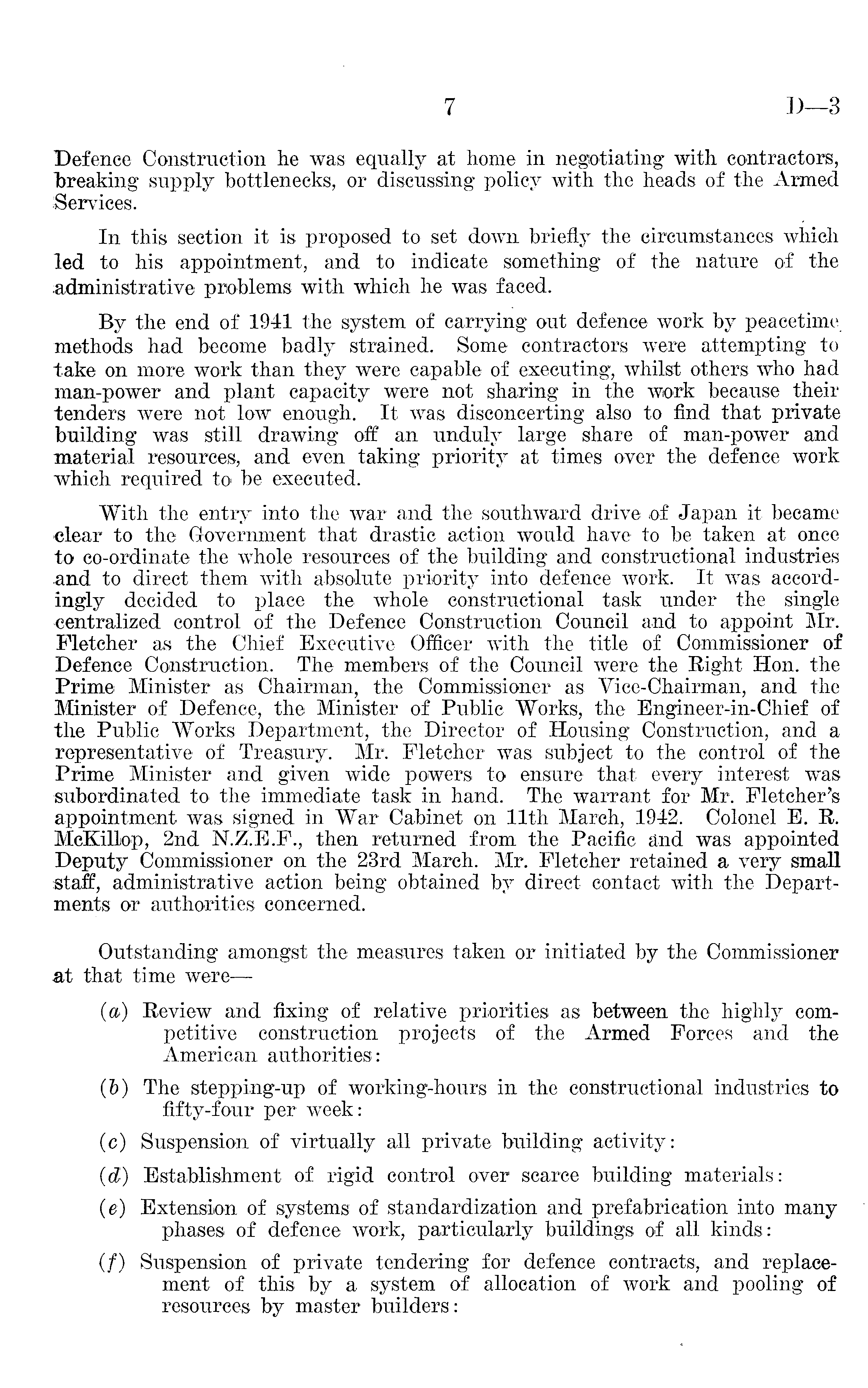 Defence Construction he was equally at home in negotiating with contractors, "breaking supply bottlenecks, or discussing policy with the heads of the Armed Services. In this section it is proposed to set down briefly the circumstances which led to his appointment, and to indicate something of the nature of the administrative problems with which he was faced. By the end of 1941 the system of carrying out defence work by peacetime methods had become badly strained. Some contractors were attempting to take on more work than they were capable of executing, whilst others who had man-power and plant capacity were not sharing in the work because their tenders were not low enough. It was disconcerting also to find that private building was still drawing off an unduly large share of man-power and material resources, and even taking priority at times over the defence work which required to be executed. "With the entry into the war and the southward drive of Japan it became •clear to the Government that drastic action would have to be taken at once to co-ordinate the whole resources of the building and constructional industries and to direct them with absolute priority into defence work. It was accordingly decided to place the whole constructional task under the single centralized control of the Defence Construction Council and to appoint Mr. Fletcher as the Chief Executive Officer with the title of Commissioner of Defence Construction. The members of the Council were the Right Hon. the Prime Minister as Chairman, the Commissioner as Vice-Chairman, and the Minister of Defence, the Minister of Public Works, the Engineer-in-Chief of the Public Works Department, the Director of Housing Construction, and a representative of Treasury. Mr. Fletcher was subject to the control of the Prime Minister and given " wide powers to ensure that every interest was subordinated to the immediate task in hand. The warrant for Mr. Fletcher's appointment was signed in War Cabinet on 11th March, 1942. Colonel E. R. McKillop, 2nd N.Z.E.F., then returned from the Pacific and was appointed Deputy Commissioner on the 23rd March. Mr. Fletcher retained a very small staff, administrative action being obtained by direct contact with -the Departments or authorities concerned. Outstanding amongst the measures taken or initiated by the Commissioner at that time were—(a) Review and fixing of relative priorities as between the highly competitive construction projects of the Armed Forces and the American authorities: (b) The stepping-up of working-hours in the constructional industries to fifty-four per week: (c) Suspension of virtually all private building activity: (d) Establishment of rigid control over scarce building materials : (e) Extension of systems of standardization and prefabrication into many phases of defence work, particularly buildings of all kinds: (/) Suspension of private tendering for defence contracts, and replacement of this by a system of allocation of work and pooling of resources by master builders: