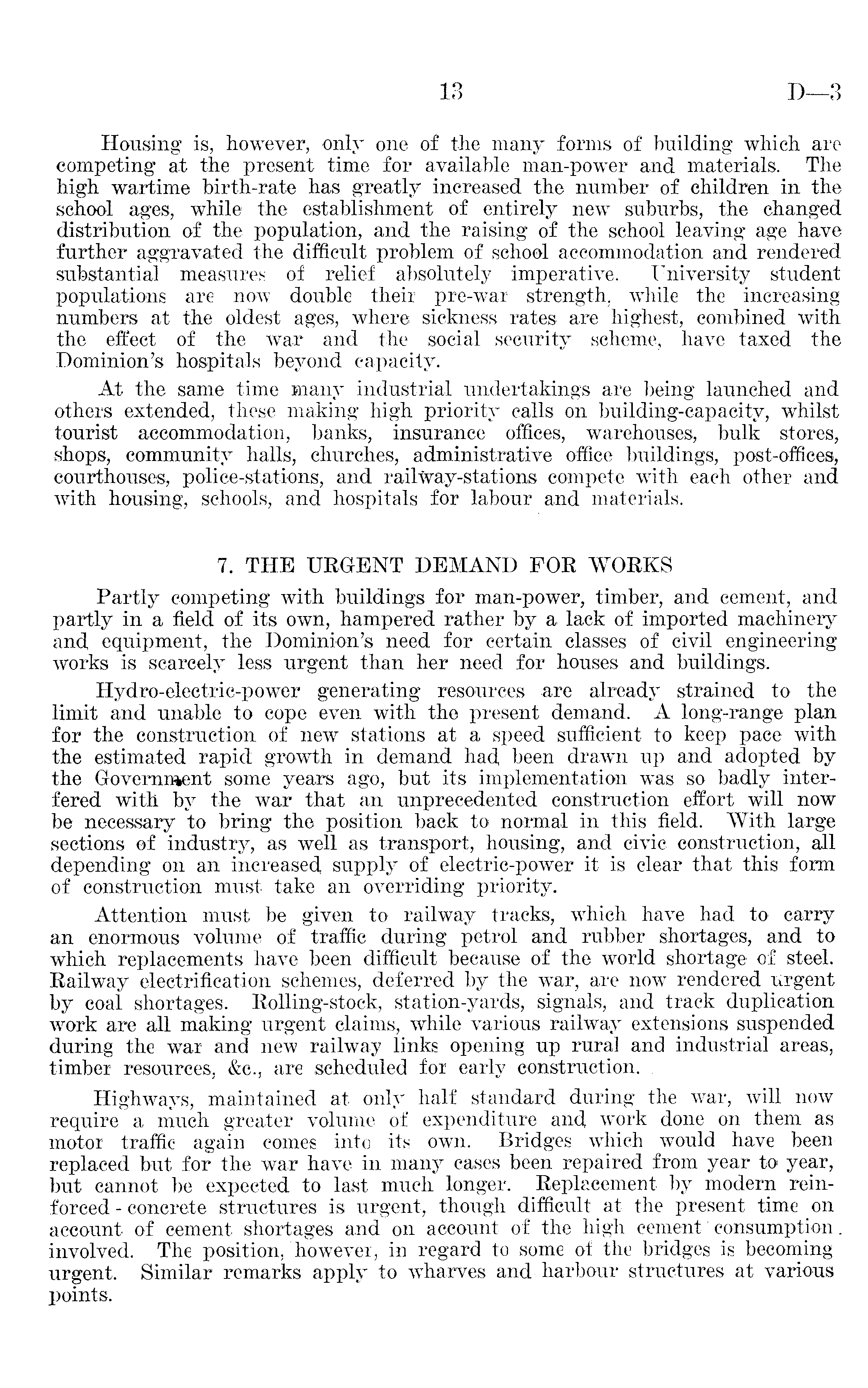 Housing is, however, only one of the many forms of building which are competing at the present time for available man-power and materials. The high wartime birth-rate has greatly increased the number of children in the school ages, while the establishment of entirely new suburbs, the changed distribution of the population, and the raising of the school leaving age have further aggravated the difficult problem of school accommodation and rendered substantial measures of relief absolutely imperative. University student populations are now double their pre-war strength, while the increasing numbers at the oldest ages, where sickness rates are highest, combined with the effect of the war and the social security scheme, have taxed the Dominion's hospitals beyond capacity. At the same time many industrial undertakings are being launched and others extended, these making high priority calls on building-capacity, whilst tourist accommodation, banks, insurance offices, warehouses, bulk stores, shops, community halls, churches, administrative office buildings, post-offices, courthouses, police-stations, and railway-stations compete with each other and with housing, schools, and hospitals for labour and materials. 7. THE URGENT DEMAND FOR WORKS Partly competing with buildings for man-power, timber, and cement, and partly in a field of its own, hampered rather by a lack of imported machinery and equipment, the Dominion's need for certain classes of civil engineering works is scarcely less urgent than her need for houses and buildings. Hydro-electric-power generating resources are already strained to the limit and unable to cope even with the present demand. A long-range plan for the construction of new stations at a speed sufficient to keep pace with the estimated rapid growth in demand had, been drawn up and adopted by the Government some years ago, but its implementation was so badly interfered with by the war that an unprecedented construction effort will now be necessary to bring the position back to normal in this field. "With large sections of industry, as well as transport, housing, and civic construction, all depending on an increased, supply of electric-power it is clear that this form of construction must take an overriding priority. Attention must be given to railway tracks, which have had to carry an enormous volume of traffic during petrol and rubber shortages, and to which replacements have been difficult because of the world shortage of steel. Railway electrification schemes, deferred by the war, are now rendered urgent by coal shortages. Rolling-stock, station-yards, signals, and track duplication work are all making urgent claims, while various railway extensions suspended during the war and new railway links opening up rural and industrial areas, timber resources, &c., are scheduled for early construction. . Highways, maintained at only half standard during the war, will now require a much greater volume of expenditure and, work done on them as motor traffic again comes into its own. Bridges which would have been replaced but for the war have in many cases been repaired from year to year, but cannot be expected to last much longer. Replacement by modern reinforced - concrete structures is urgent, though difficult at the present time on account of cement shortages and on account of the high cement consumption. involved. The position, however, in regard to some of the bridges is becoming urgent. Similar remarks apply to wharves and harbour structures at various points.