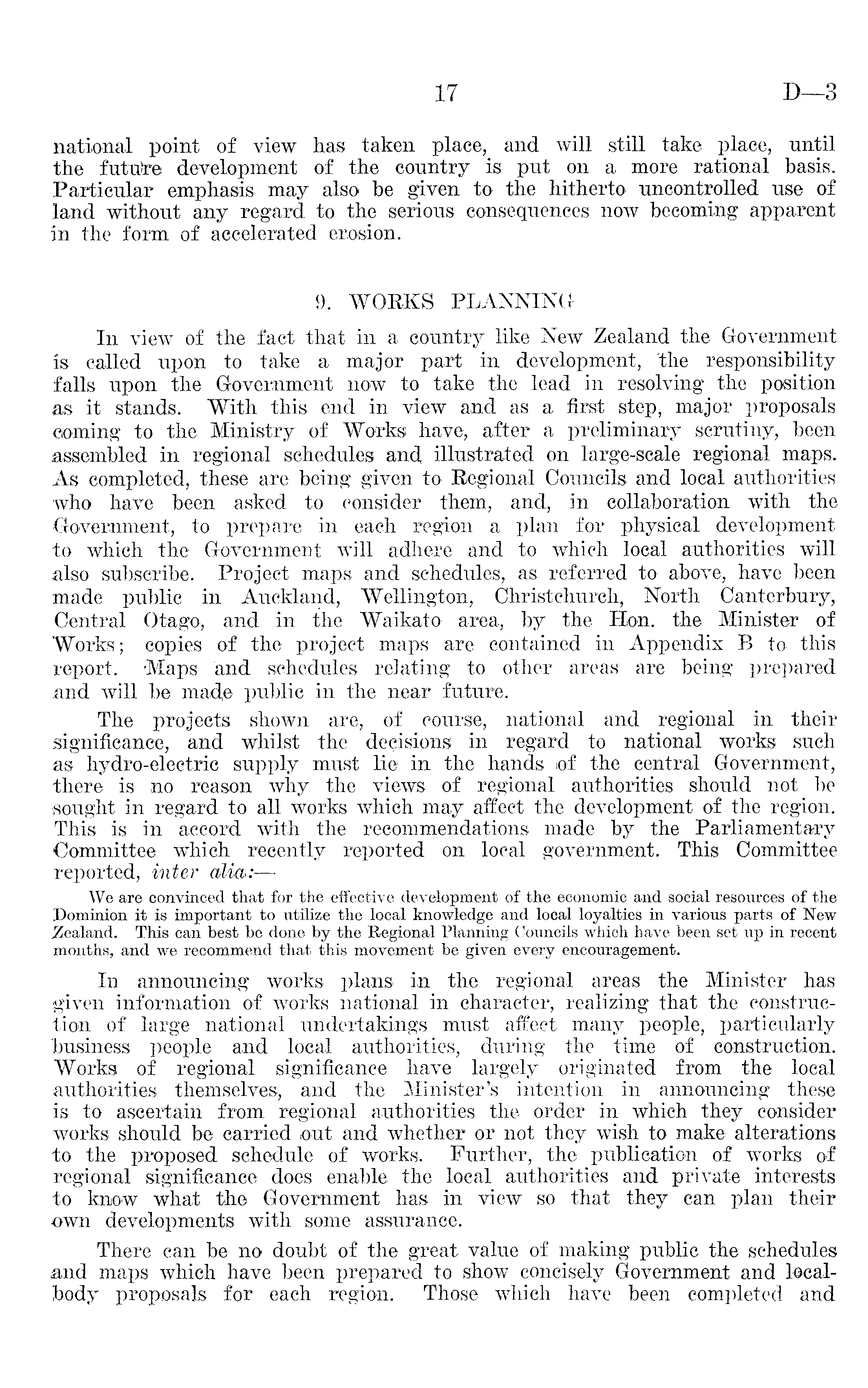 national point of view has taken place, and will still take place, until the futulre development of the country is put on a more rational basis. Particular emphasis may also be given to the hitherto uncontrolled use of land without any regard to the serious consequences now becoming apparent in the form of accelerated erosion. 9. WORKS PLANNING In view of the fact that in a country like New Zealand the Government is called upon to take a major part in development, 'the responsibility falls upon the Government now to take the lead in resolving the position as it stands. With this end in view and as a first step, major proposals coming to the Ministry of Works have, after a preliminary scrutiny, been assembled in regional schedules and illustrated on large-scale regional maps. As completed, these are being given to Regional Councils and local authorities who have been asked to consider them, and, in collaboration with the Government, to prepare in each region a plan for physical development to which the Government will adhere and to which local authorities will also subscribe. Project maps and schedules, as referred to above, have been made public in Auckland, Wellington, Christchurch, North Canterbury, Central Otago, and in the Waikato area, by the Hon. the Minister of Works; copies of the project maps are contained in Appendix B to this report. -Maps and schedules relating to other areas are being prepared and will be made public in the near future. The projects shown are, of course, national and regional in their significance, and whilst the decisions in regard to national works such as hydro-electric supply must lie in the hands of the central Government, there is no reason why the views of regional authorities should not be sought in regard to all works which may affect the development of the region. This is in accord with the recommendations made by the Parliamentary Committee which recently reported on local government. This Committee reported, inter alia:— We are convinced that for the effective development of the economic and social resources of the JDominion it is important to utilize the local knowledge and local loyalties in various parts of New .Zealand. This can best be done by the Regional Planning Councils which have been set up in recent months, and we recommend that this movement be given every encouragement. In announcing works plans in the regional areas the Minister has given information of works national in character, realizing that the construction of large national undertakings must affect many people, particularly business people and local authorities, during the time of construction. Works of regional significance have largely originated from the local authorities themselves, and the Minister's intention in announcing these is to ascertain from regional authorities the order in which they consider works should be carried out and whether or not they wish to make alterations to the proposed schedule of works. Further, the publication of works of regional significance does enable the local authorities and private interests to know what the Government has in view so that they can plan their own developments with some assurance. There can be no doubt of the great value of making public-the schedules and maps which have been prepared to show concisely Government and localbody proposals for each region. Those which have been completed and