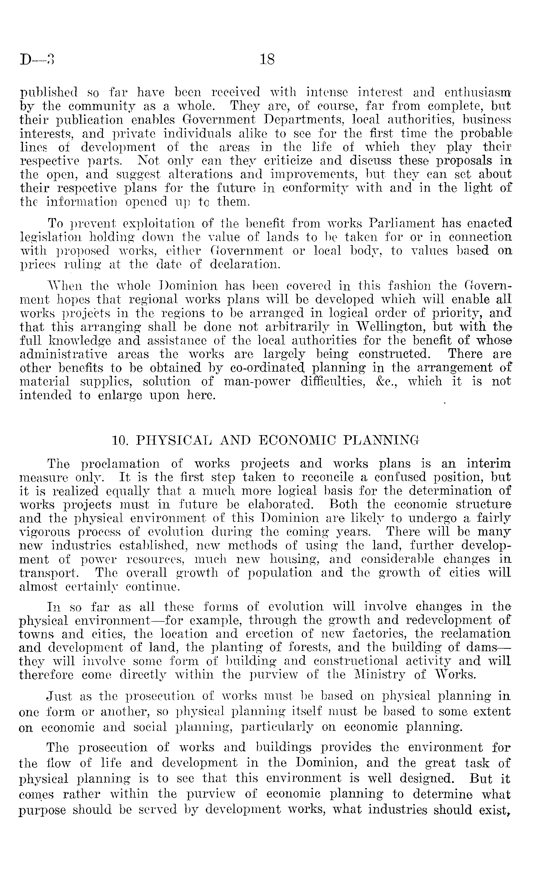published so far have been received with intense interest and enthusiasm by the community as a whole. They are, of course, far from complete, but their publication enables Government Departments, local authorities, business interests, and private individuals alike to see for the first time the probable lines of development of the areas in the life of which they play their respective parts. Not only can they criticize and discuss these proposals in the open, and suggest alterations and improvements, but they can set about their respective plans for the future in conformity with and in the light of the information opened up to them. To prevent exploitation of the benefit from works Parliament has enacted legislation holding down the value of lands to be taken for or in connection with proposed works, either Government or local body, to values based on prices ruling at the date of declaration. "When the whole Dominion has been covered in this fashion the Government hopes that regional works plans will be developed which will enable all works projects in the regions to be arranged in logical order of priority, and that this arranging shall be done not arbitrarily in Wellington, but with the full knowledge and assistance of the local authorities for the benefit of whose administrative areas the works are largely being constructed. There are other benefits to be obtained by co-ordinated, planning in the arrangement of material supplies, solution of man-power difficulties, &c., which it is not intended to enlarge upon here. 10. PHYSICAL AND ECONOMIC PLANNING The proclamation of works projects and works plans is an interim measure only. It is the first step taken to reconcile a confused position, but it is realized equally that a much more logical basis for the determination of works projects must in future be elaborated. Both the economic structure and the physical environment of this Dominion are likely to undergo a fairly vigorous process of evolution during the coming years. There will be many new industries established, new methods of using the land, further development of power resources, much new housing, and considerable changes in transport. The overall growth of population and the growth of cities will almost certainly continue. In so far as all these forms of evolution will involve changes in the physical environment —for example, through the growth and redevelopment of towns and cities, the location and erection of new factories, the reclamation and development of land, the planting of forests, and the building of dams—they will involve some form of building and constructional activity and will therefore come directly within the purview of the Ministry of Works. Just as the prosecution of works must be based on physical planning in one form or another, so physical planning itself must be based to some extent on economic and social planning, particularly on economic planning. The prosecution of works and buildings provides the environment for the flow of life and development in the Dominion, and the great task of physical planning is to see that this environment is well designed. But it comes rather within the purview of economic planning to determine what purpose should be served by development works, what industries should exist,