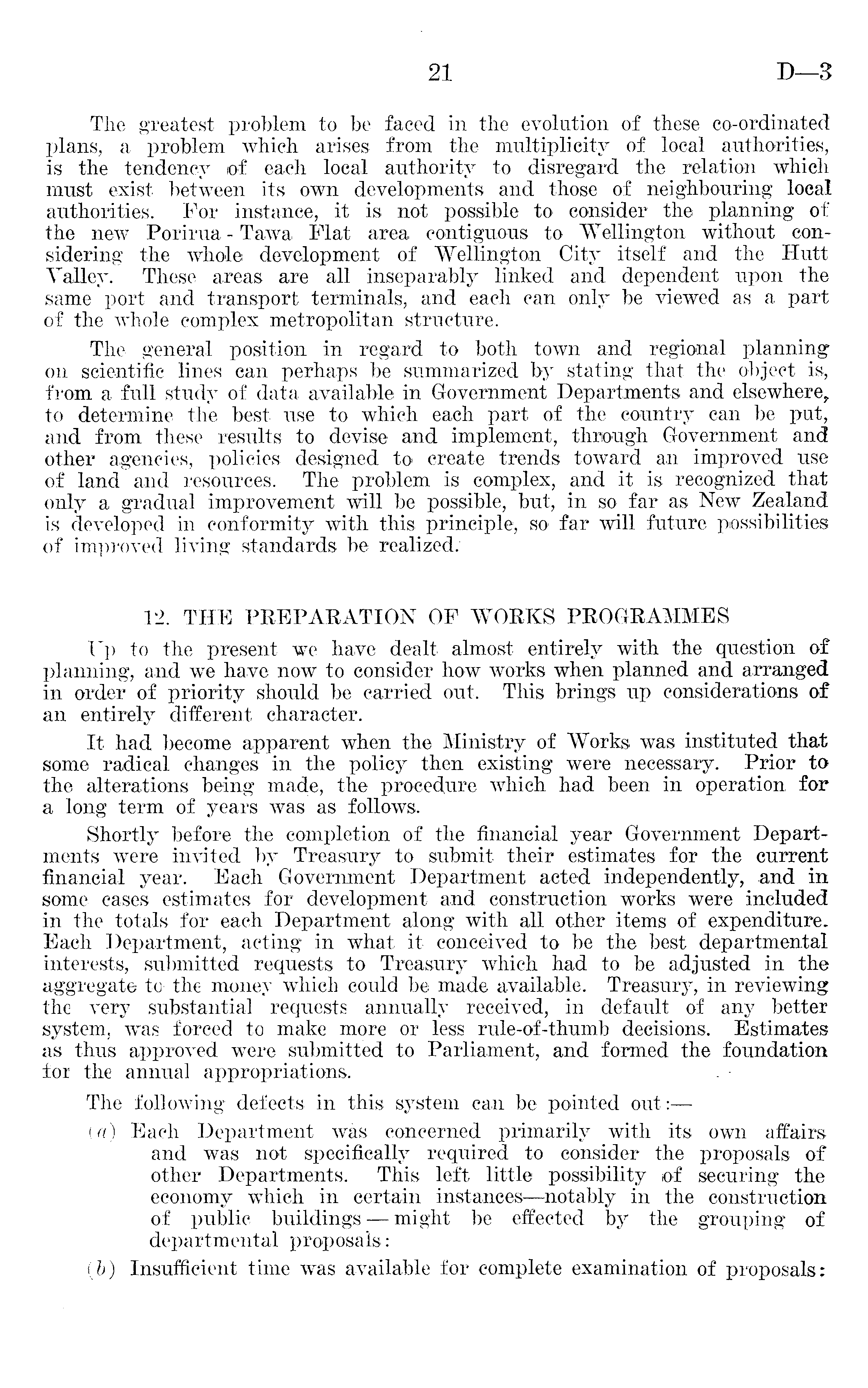 The greatest problem to be faced in the evolution of these co-ordinated; plans, a problem which arises from the multiplicity of local authorities, is the tendency of each local authority to disregard the relation which must exist between its own developments and those of neighbouring local authorities. For instance, it is not possible to consider the planning of the new Porirua-Tawa Flat area contiguous to "Wellington without considering the whole development of Wellington City itself and the Hutt Valley. These areas are all inseparably linked and dependent upon the same port and transport terminals, and each can only be viewed as a part of the whole complex metropolitan structure. The general position in regard to both town and regional planning on scientific lines can perhaps be summarized by stating that the object is, from a full study of data available in Government Departments and elsewhere, to determine the best use to which each part of the country can be put, and from these results to devise and implement, through Government and other agencies, policies designed to create trends toward an improved use of land and resources. The problem is complex, and it is recognized that only a gradual improvement will be possible, but, in so far as New Zealand is developed in conformity with this principle, so far will future possibilities of improved living standards be realized. 12. THE PREPARATION OF WORKS PROGRAMMES Up to the present we have dealt almost entirely with the question of planning, and we have now to consider how works when planned and arranged in order of priority should be carried out. This brings up considerations of an entirely different character. It had become apparent when the Ministry of Works was instituted that some radical changes in the policy then existing were necessary. Prior to the alterations being made, the procedure which had been in operation, for a long term of years was as follows. Shortly before the completion of the financial year Government Departments were invited by Treasury to submit their estimates for the current financial year. Each Government Department acted independently, and in some cases estimates for development and construction works were included in the totals for each Department along with all other items of expenditure. Each Department, acting in what it conceived to be the best departmental interests, submitted requests to Treasury which had to be adjusted in the aggregate to the money which could be made available. Treasury, in reviewing the very substantial requests annually received, in default of any better system, was forced to make more or less rule-of-thumb decisions. Estimates as thus approved were submitted to Parliament, and formed the foundation foi the annual appropriations. The following defects in this system can be pointed out: — (a) Each Department was concerned primarily with its own affairs and was not specifically required to consider the proposals of other Departments. This left little possibility of securing the economy which in certain instances—notably in the construction of public buildings *— might be effected by the grouping of departmental proposals: (b) Insufficient time was available for complete examination of proposals;