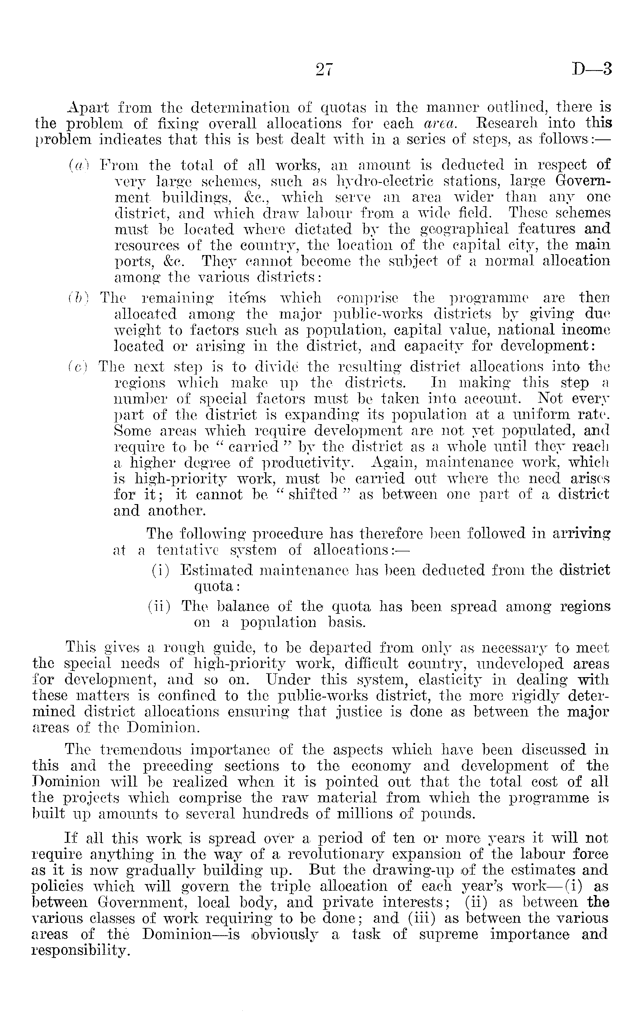 Apart from the determination of quotas in the manner outlined, there is the problem of fixing overall allocations for each area. Research into this problem indicates that this is best dealt with in a series of steps, as follows: — (a) From the total of all works, an amount is deducted in respect of very large schemes, such as hydro-electric stations, large Government buildings, &c., which serve an area wider than any one district, and which draw labour from a wide field. These schemes must be located where dictated by the geographical features and resources of the country, the location of the capital city, the main ports, &c. They cannot become the subject of a normal allocation among the various districts: (b) The remaining items which comprise the programme are then allocated among the major public-works districts by giving due weight to factors such as population, capital value, national income located or arising in the district, and capacity for development: (c) The next step is to divide the resulting district allocations into the regions which make up the districts. In making this step a number of special factors must be taken into account. Not every part of the district is expanding its population at a uniform rate. Some areas which require development are not yet populated, and require to be " carried " by the district as a whole until they reach a higher degree of productivity. Again, maintenance work, which is high-priority work, must be carried out where the need arises for it; it cannot be " shifted "as between one part of a district and another. The following procedure has therefore been followed in arriving at a tentative system of allocations : (i) Estimated maintenance has been deducted from the district quota: (ii) The balance of the quota has been spread among regions on a population basis. This gives a rough guide, to be departed from only as necessary to meet the special needs of high-priority work, difficult country, undeveloped areas for development, and so on. Under this system, elasticity in dealing with these matters is confined to the public-works district, the more rigidly determined district allocations ensuring that justice is done as between the major areas of the Dominion. The tremendous importance of the aspects which have been discussed in this and the preceding sections to the economy, and development of the Dominion will be realized when it is pointed out that the total cost of all the projects which comprise the raw material from which the programme is built up amounts to several hundreds of millions of pounds. If all this work; is spread over a period of ten or more years it will not require anything in the way of a revolutionary expansion of the labour force as it is now gradually building up. But the dr a wing-up of the estimates and policies which will govern the triple allocation of each year's work—(i) as between Government, local body, and private interests; (ii) as between the various classes of work requiring to be done; and (iii) as between the various areas of the Dominion—is obviously a task of supreme importance and responsibility.
