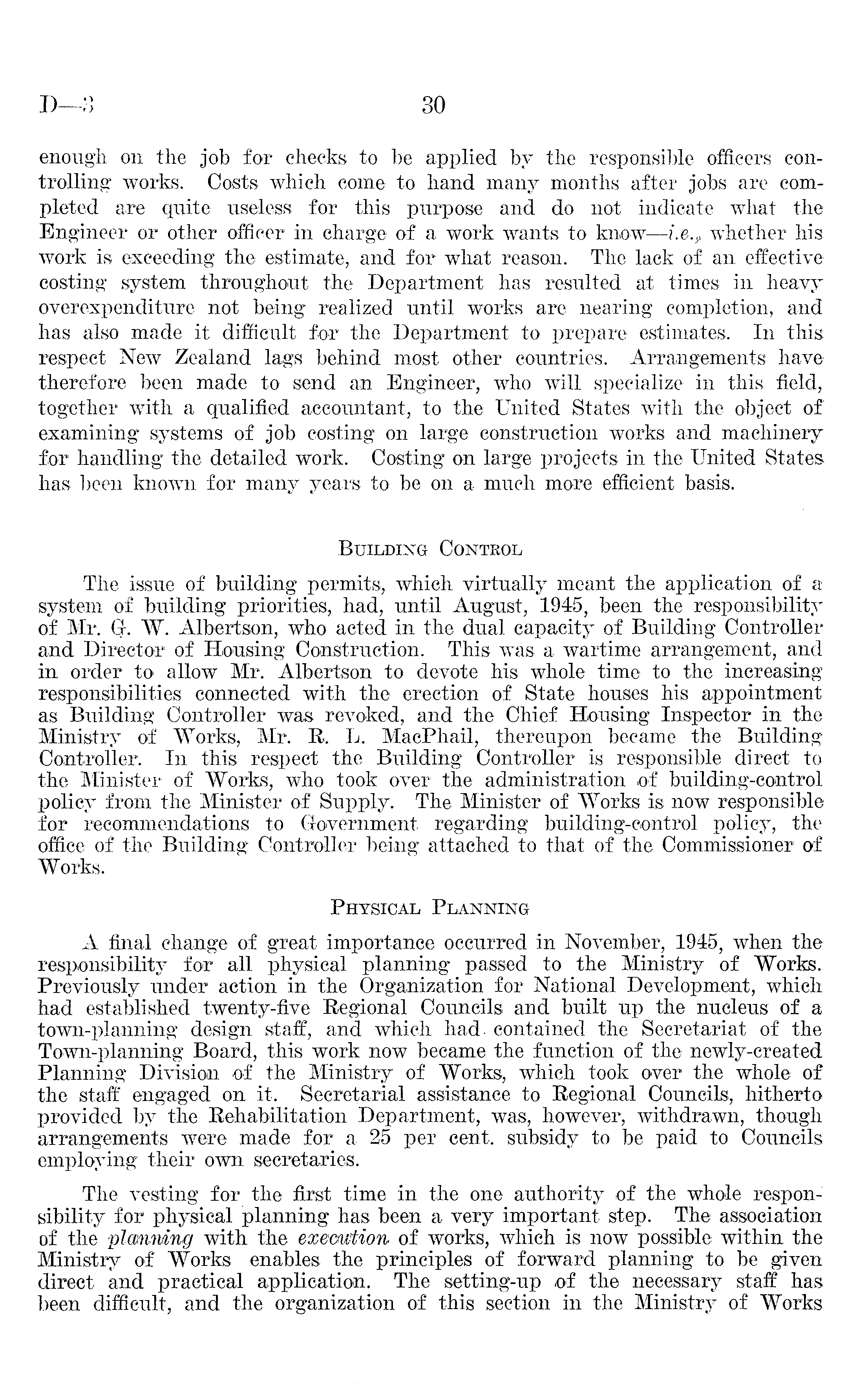 enough on the job for checks to be applied by the responsible officers eontrolling works. Costs which come to hand many months after jobs are completed are quite useless for this purpose and do not indicate what the Engineer or other officer in charge of a work wants to know—i.e.,; whether his. work is exceeding the estimate, and for what reason. The lack of an effective costing system throughout the Department has resulted at times in heavy overexpenditure not being realized until works are nearing completion, and has also made it difficult for the Department to prepare estimates, In this respect New Zealand lags behind most other countries. Arrangements have therefore been made to send an Engineer, who will specialize in this field, together with a qualified accountant, to the United States with the object of examining systems of job costing on large construction works and machinery for handling the detailed work. Costing on large projects in the United States, has been known for many years to be on a much more efficient basis, Building Control The issue of building permits, which virtually meant the application of a system of building priorities, had, until August, 1945, been the responsibility of Mr. Gr. W. Albertson, who acted in the dual capacity of Building Controller and Director of Housing Construction. This was a wartime arrangement, and in order to allow Mr. Albertson to devote his whole time to the increasing responsibilities connected with the erection of State houses his appointment as Building Controller was revoked, and the Chief Housing Inspector in the Ministry of Works, Mr. R. L. MacPhail, thereupon became the Building Controller. In this respect the Building Controller is responsible direct to the Minister of Works, who took over the administration of building-control policy from the Minister of Supply. The Minister of Works is now responsible for recommendations to Government regarding building-control policy, the office of the Building Controller being attached to that of the Commissioner of Works. Physical Planning A final change of great importance occurred in November, 1945, when the responsibility for all physical planning passed to the Ministry of Works. Previously under action in the Organization for National Development, which had established twenty-five Regional Councils and built up the nucleus of a town-planning design staff, and which had. contained the Secretariat of the Town-planning Board, this work now became the function of the newly-created Planning Division of the Ministry of Works, which took over the whole of the staff engaged on it. Secretarial assistance to Regional Councils, hitherto provided by the Rehabilitation Department, was, however, withdrawn, though arrangements were made for a 25 per cent, subsidy to be paid to Councils employing their own secretaries. The vesting for the first time in the one authority of the whole responsibility for physical planning has been a very important step. The association of the planning with the execution of works, which is now possible within the Ministry of Works enables the principles of forward planning to be given direct and practical application. The setting-up of the necessary staff has been difficult, and the organization of this section in the Ministry of Works