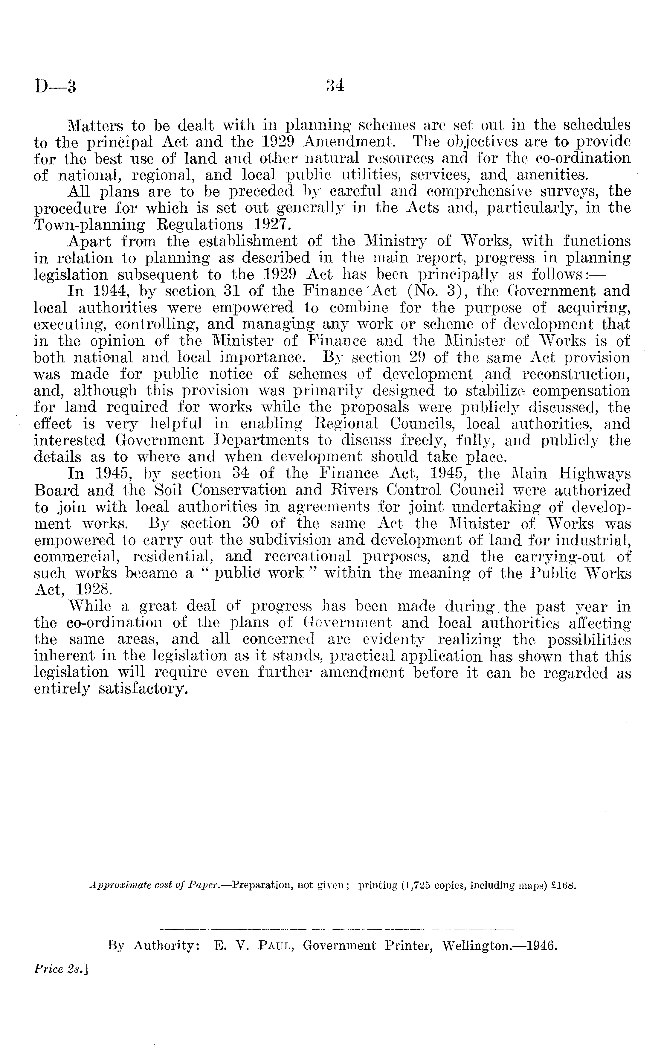 Matters to be dealt with in planning schemes are set out in the schedules to the principal Act and the 1929 Amendment. The objectives are to provide for the best use of land and other natural resources and for the co-ordination of national, regional, and local public utilities, services, and amenities. All plans are to be preceded by careful and comprehensive surveys, the procedure for which is set out generally in the Acts and, particularly, in the Town-planning Regulations 1927. Apart from the establishment of the Ministry of Works, with functions in relation to planning as described in the main report, progress in planning legislation subsequent to the 1929 Act has been principally as follows: In .1944, by section 31 of the Finance' Act (No. 3), the Government and local authorities were empowered to combine for the purpose of acquiring, executing, controlling, and managing any work or scheme of development that in the opinion of the Minister of Finance and the Minister of Works is of both national and local importance. By section 29 of the same Act provision was 'made for public notice of schemes of development and reconstruction, and, although this provision was primarily designed to stabilize compensation for land required for works while the proposals were publicly discussed, the effect is very helpful in enabling Regional Councils, local authorities, and interested Government Departments to discuss freely, fully, and publicly the details as to where and when development should take place. In 1945, by section 34 of the Finance Act, 1945, the Main Highways Board and the Soil Conservation and Rivers Control Council were authorized to join with local authorities in agreements for joint undertaking of development works. By section 30 of the same Act the Minister of Works was empowered to carry out the subdivision and development of land for industrial, commercial, residential, and recreational purposes, and the carrying-out of such works became a " public! work " within the meaning of the Public Works Act, 1928. While a great deal of progress has been made during. the past year in the co-ordination of the plans of Government and local authorities affecting the same areas, and all concerned are evidenty realizing the possibilities inherent in the legislation as it stands, practical application has shown that this legislation will require even further amendment before it can be regarded as entirely satisfactory.