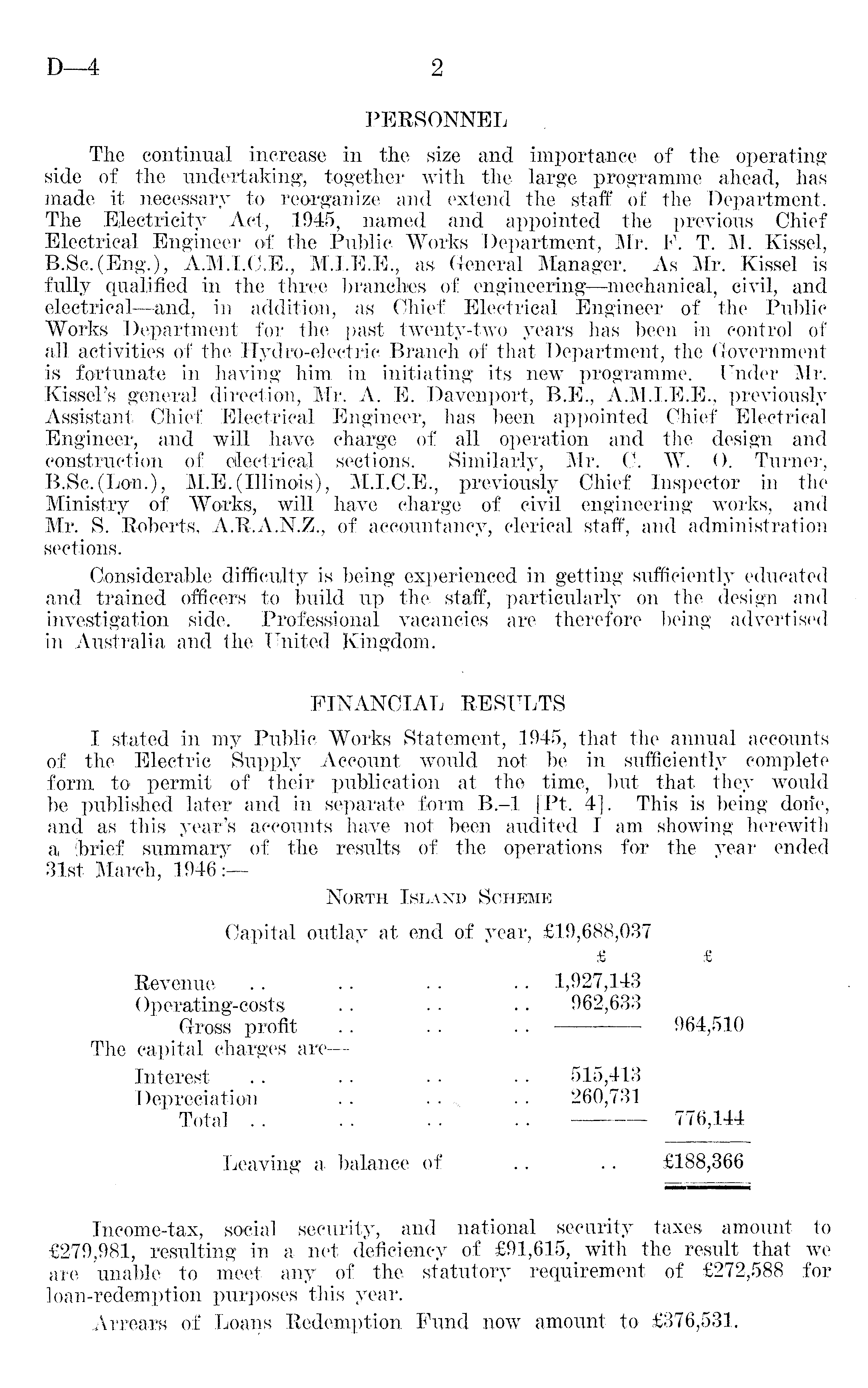 PERSONNEL The continual increase in the size and importance of the operating side of the undertaking;, together with the large programme ahead, has made it necessary to reorganize and extend the staff of the Department, The Electricity Act, 1945, named and appointed the previous Chief Electrical Engineer of the Public. Works Department, Mr. P. T. M. Kissel, B.Sc(Eng.), A.M.1.C.E., M.1.E.E., as General Manager. As Mr. Kissel is fully qualified in the three branches of engineering—mechanical, civil, and electrical —and, in addition, as Chief Electrical Engineer of the Public Works Department for the past twenty-two years has been in control of all activities of the Hydro-electric Branch of that Department, the Government is fortunate in having him in initiating its new programme. Under Mr. Kissel's general direction, Mr. A. E. Davenport, 8.E., A.M.1.E.E., previously Assistant Chief Electrical Engineer, has been appointed Chief Electrical Engineer, and will have charge of all operation and the design and construction of electrical sections. Similarly, Mr. C. W. 0. Turner, B.Sc.(Lon.), M.E. (Illinois), M.1.C.E., previously Chief Inspector in the Ministry of Works, will have charge of civil engineering works, and Mr. S. Roberts, A.R.A.N.Z., of accountancy, clerical staff, and administration sections. Considerable difficulty is being experienced in getting sufficiently educated and trained officers to build up the staff, particularly on the design and investigation side. Professional vacancies are therefore being advertised in Australia and the United Kingdom. FINANCIAL RESULTS I stated in my Public Works Statement, 1945, that the annual accounts of the Electric Supply Account would not be in sufficiently complete form to permit of their publication at the time, but that they would be published later and in separate form 8.-l [Pt. 4]. This is being done, and as this year's accounts have not been audited I am showing herewith a (brief summary of the results of the operations for the vear ended 31st March, 1946: North Island Scheme Capital outlay at end of year, £19,688,037 £ £ Revenue .. ... . . .. 1,927,143 Operating-costs . . . . .. 962,633 Gross profit .. . . . . ■ 964,510 The capital charges are— Interest .. .. . . .. 515,413 Depreciation . . . . v . . 260,731 Total .. .. .. •• 776,144 Leaving a balance of .. .. £188,366 Income-tax, social security, and national security taxes amount to £279,981, resulting in a net deficiency of £91,615, with the result that we are unable to meet any of the statutory requirement of £272,588 for loan-redemption purposes this year. Arrears of Loans Redemption Fund now amount to £376,531.