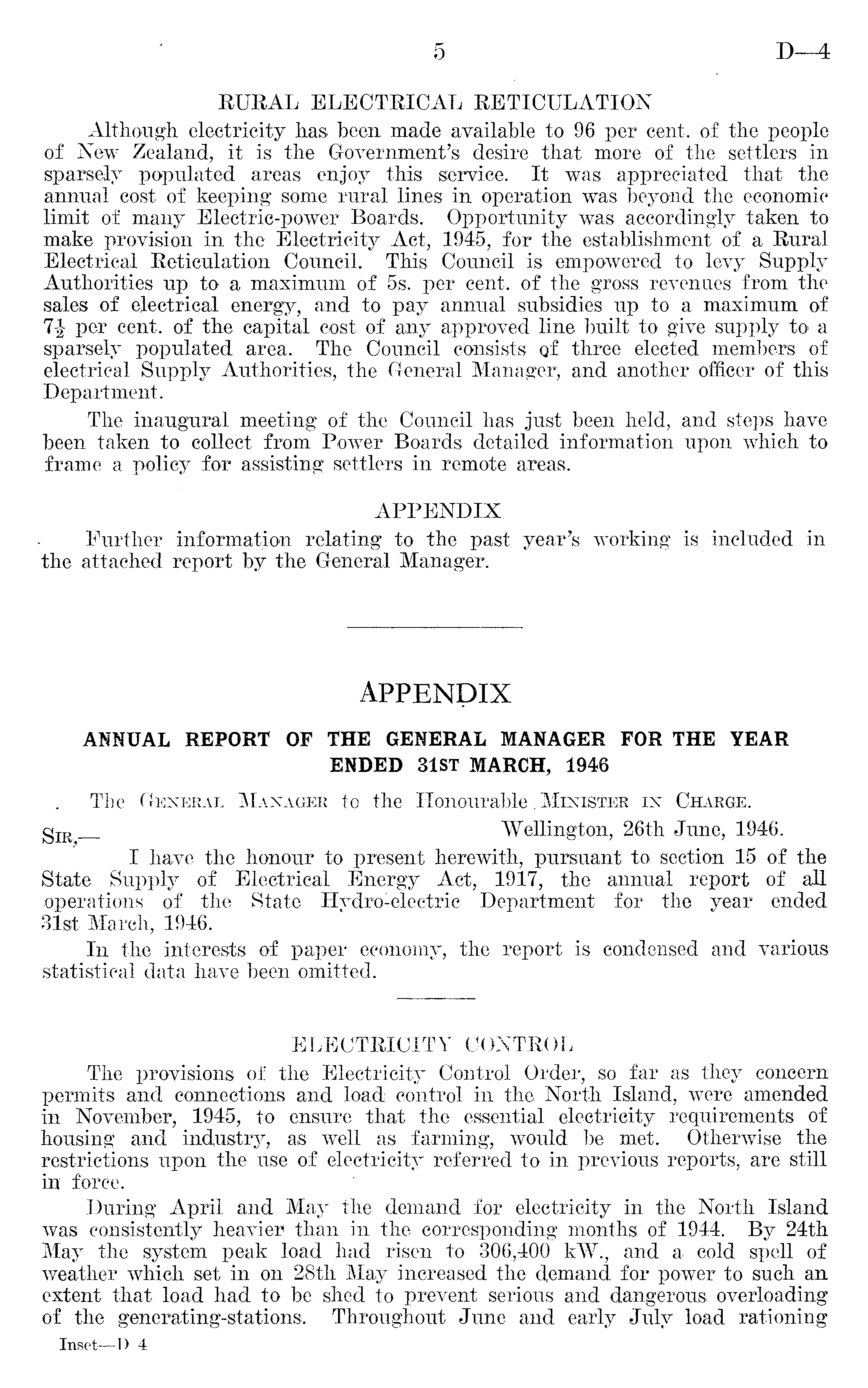 ELECTRICITY CONTROL The provisions of the Electricity Control Order, so far as they concern permits and connections and load control in the North Island, were amended in November, 1945, to ensure that the essential electricity requirements of housing and industry, as well as farming, would be met. Otherwise the restrictions upon the use of electricity referred to in previous reports, are still in force. During April and May the demand for electricity in the North Island was consistently heavier than in the corresponding months of 1944. By 24th May the system peak load had risen to 306,400 kW., and a cold spell of weather which set in on 28th May increased the demand for power to such an extent that load had to be shed to prevent serious and dangerous overloading of the generating-stations, Throughout June and early July load rationing Inset—D 4