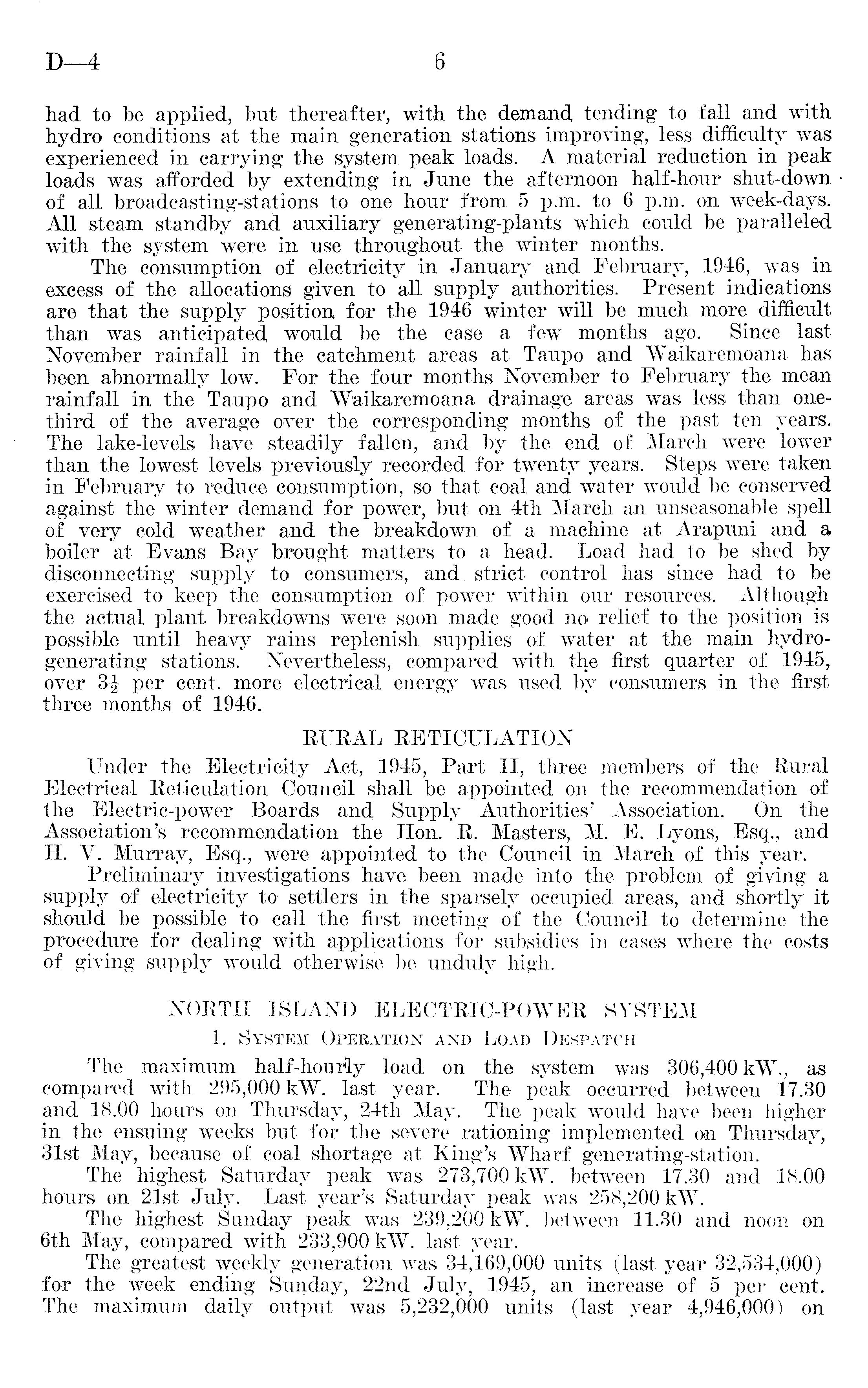 had to be applied, but thereafter, with the demand tending to fall and with hydro conditions at the main generation stations improving, less difficulty was experienced in carrying the system peak loads. A material reduction in peak loads was afforded by extending in June the afternoon half-hour shut-down of all broadcasting-stations to one hour from 5 p.m. to 6 p.m. on week-days. All steam standby and auxiliary generating-plants which could be paralleled with the system were in use throughout the winter months. The consumption of electricity in January and February, 1946, was in excess of the allocations given to all supply authorities. Present indications are that the supply position for the 1946 winter will be much more difficult than was anticipated would be the case a few months ago. Since last November rainfall in the catchment areas at Taupo and Waikaremoana has been abnormally low. For the four months November to February the mean rainfall in the Taupo and "Waikaremoana drainage areas was less than onethird of the average over the corresponding months of the past ten years. The lake-levels have steadily fallen, and by the end of March were lower than the lowest levels previously recorded for twenty years. Steps were taken in February to reduce consumption, so that coal and water would be conserved against the winter demand for power, but on 4th March an unseasonable spell of very cold weather and the breakdown of a machine at Arapuni and a boiler at Evans Bay brought matters to a head. Load had to be shed by disconnecting supply to consumers, and. strict control has since had to be exercised to keep the consumption of power within our resources. Although the actual plant breakdowns were soon made good no relief to the position is possible until heavy rains replenish supplies of water at the main hydrogenerating stations. Nevertheless, compared with the first quarter of 1945, over 3| per cent, more electrical energy was used by consumers in the first three months of 1946. RURAL RETICULATION Under the Electricity Act, 1945, Part 11, three members of the Rural Electrical Reticulation Council shall be appointed on the recommendation of the Electric-power Boards and Supply Authorities' Association. On the Association's recommendation the Hon. R. Masters, M. E. Lyons, Esq., and H. V. Murray, Esq., were appointed to the Council in March of this year. Preliminary investigations have been made into the problem of giving a supply of electricity to settlers in the sparsely occupied areas, and shortly it should be possible to call the first meeting of the Council to determine the procedure for dealing with applications for subsidies in cases where the costs of giving supply would otherwise be unduly high. NORTH ISLAND ELECTRIC-POWER SYSTEM 1. System Operation and Load Despatch The maximum half-hourly load on the system was 306,400 kW., as compared with 295,000 kW. last year. The peak occurred between 17.30 and 18.00 hours on Thursday, 24th May. The peak would have been higher in the ensuing weeks but for the severe rationing implemented on Thursday, 31st May, because of coal shortage at King's Wharf generating-station. The highest Saturday peak was 273,700 kW. between 17.30 and 18.00 hours on 21st July. Last year's Saturday peak was 258,200 kW. The highest Sunday peak was 239,200 kW. between 11.30 and noon on 6th May, compared with 233,900 kW. last year. The greatest weekly generation was 34,169,000 units (last year 32,534,000) for the week ending Sunday, 22nd July, 1945, an increase of 5 per cent. The maximum daily output was 5,232,000 units (last year 4,946,000) on