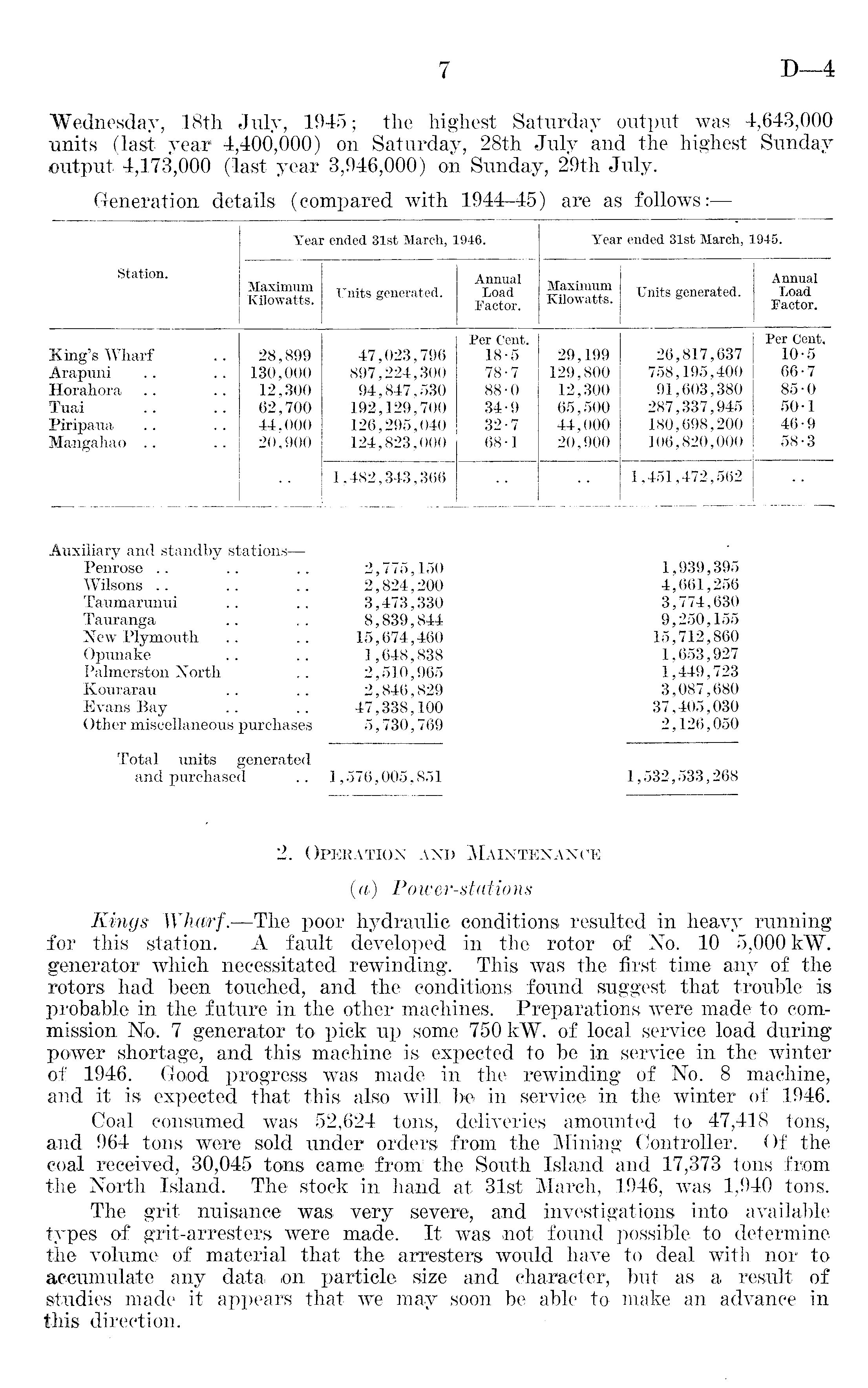 Year ended 31st March, 1946. Year ended 31st March, 1945. Station. Maximum Kilowatts. Units generated. Annual Load Factor. Maximum Kilowatts. Units generated. Annual Load Factor. King's Wharf Arapuni Horahora Tuai Piripaua Mangahao 28.899 130,000 12,300 62,700 44,000 20.900 47,023,796 897,224,300 94,847,530 192,129,700 126,295,040 124,823,000 Per Cent. 18-5 78-7 88-0 34-9 32-7 68-1 29,199 129,800 12,300 65,500 44,000 20,900 26,817,637 758,195,400 91,603,380 287,337,945 180,698,200 106,820,000 Per Cent. 10-5 66-7 85-0 50-1 46-9 58-3 1,482,343,366 1,451,472,562