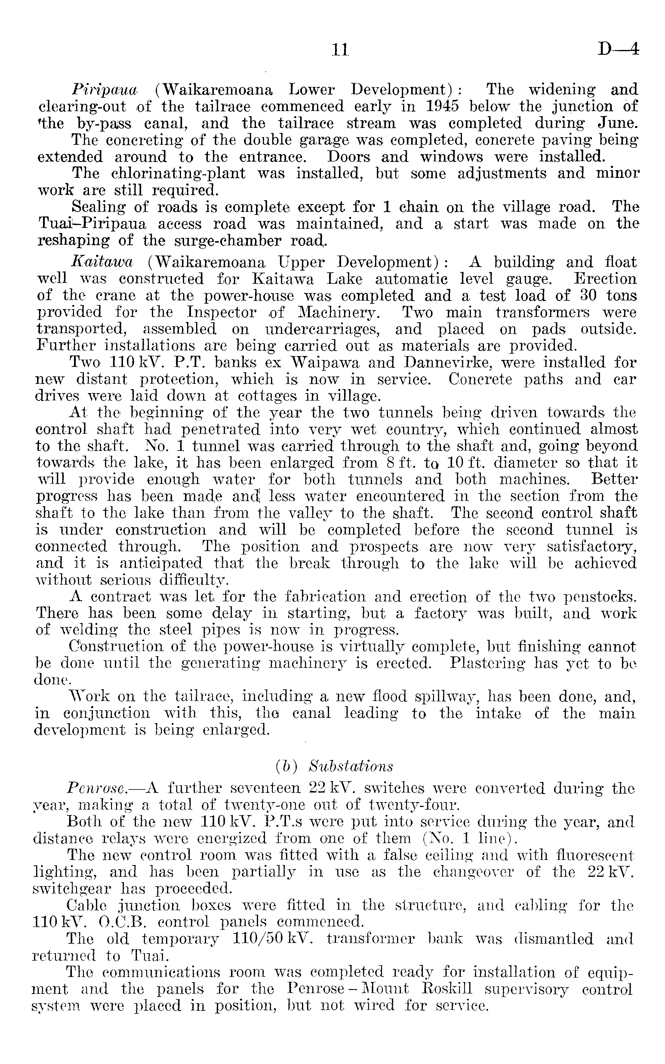 Piripama (Waikaremoana Lower Development) : The widening' and clearing-out of the tailrace commenced early in 1945 below the junction of f the by-pass canal, and the tailrace stream was completed during June. The concreting of the double garage was completed, concrete paving being extended around to the entrance. Doors and windows were installed. The chlorinating-plant was installed, but some adjustments and minor work are still required. Sealing of roads is complete except for 1 chain on the village road. The Tuai-Piripaua access road was maintained, and a start was made on the reshaping of the surge-chamber road,. Ratoawa- (Waikaremoana Upper Development) : A building and float well was constructed for Kaitawa Lake automatic level gauge. Erection of the crane at the power-house was completed and a test load of 30 tons provided for the Inspector of Machinery. Two main transformers were transported, assembled on undercarriages, and placed on pads outside. Further installations are being carried out as materials are provided. Two 110 kV. P.T. banks ex Waipawa and Dannevirke, were installed for new distant protection, which is now in service. Concrete paths and car drives were laid down at cottages in village. At the beginning of the year the two tunnels being driven towards the control shaft had penetrated into very wet country, which continued almost to the shaft. No. 1 tunnel was carried through to the shaft and, going beyond towards the lake, it has been enlarged from 8 ft. to, 10 ft. diameter so that it will provide enough water for both tunnels and both machines. Better progress has been made and! less water encountered in the section from the shaft to the lake than from the valley to the shaft. The second control shaft is under construction and will be completed before the second tunnel is connected through. The position and prospects are now very satisfactory, and it is anticipated that the break through to the lake will be achieved without serious difficulty. A contract was let for the fabrication and erection of the two penstocks. There has been some delay in starting, but a factory was built, and work of welding the steel pipes is now in progress. Construction of the power-house is virtually complete, but finishing cannot be done until the generating machinery is erected. Plastering has yet to be done. Work on the tailrace, including a new flood spillway, has been done, and, in conjunction with this, the canal leading to the intake of the main development is being enlarged. (b) Substations Penrose. —A further seventeen 22 kV. switches were converted during the year, making a total of twenty-one out of twenty-four. Both of the new 110 kV. P.T.s were put into service during the year, and distance relays were energized from one of them (No. 1 line). The new control room was fitted with a false ceiling and with fluorescent lighting, and has been partially in use as the changeover of the 22 kV. switchgear has proceeded. Cable junction boxes were fitted in the structure, and cabling for the 110 kV. 0.C.8. control panels commenced. The old temporary 110/50 kV. transformer bank was dismantled and returned to Tuai. The communications room was completed ready for installation of equipment and the panels for the Penrose - Mount Roskill supervisory control system were placed in position, but not wired for service.