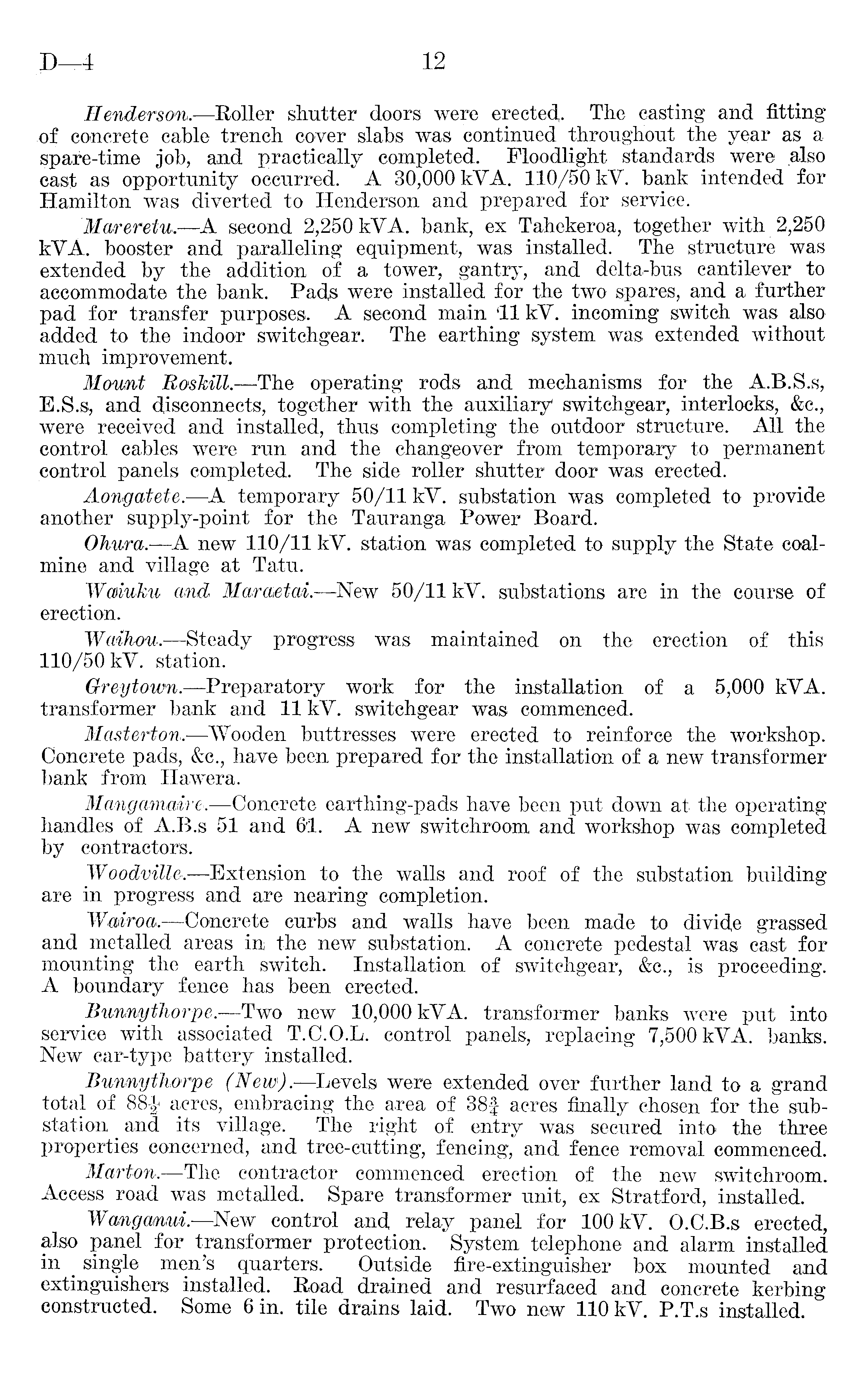Henderson. —Roller shutter doors were erected,. The casting and fitting of concrete cable trench cover slabs was continued throughout the year as a spare-time job, and practically completed. Floodlight standards were also cast as opportunity occurred. A 30,000 kVA. 110/50 kV. bank intended for Hamilton was diverted to Henderson and prepared for service. Mareretu. —A second 2,250 kVA. bank, ex Tahekeroa, together with 2,250 kVA. booster and paralleling equipment, was installed. The structure was extended by the addition of a tower, gantry, and delta-bus cantilever to accommodate the bank. Pads were installed for the two spares, and a further pad for transfer purposes. A second main 'll kV. incoming switch was also added to the indoor switchgear. The earthing system was extended without much improvement. Mount Roskill. —The operating rods and mechanisms for the A.B.S.s, E.S.s, and disconnects, together with the auxiliary switchgear, interlocks, &c, were received and installed, thus completing the outdoor structure. All the control cables were run and the changeover from temporary to permanent control panels completed. The side roller shutter door was erected. Aongatete.- —A temporary 50/11 kV. substation was completed to provide another supply-point for the Tauranga Power Board. Ohura. —A new 110/11 kV. station was completed to supply the State coalmine and village at Tatu. Wcaiuku and Maroietai. —New 50/11 kV. substations are in the course of erection. Waihou. —Steady progress was maintained on the erection of this 110/50 kV. station. Greytoum. —Preparatory work for the installation of a 5,000 kVA. transformer bank and 11 kV. switchgear was commenced. Masterton. —Wooden buttresses were erected to reinforce the workshop. Concrete pads, &c, have been prepared for the installation of a new transformer bank from Hawera. Mangamaire. —Concrete earthing-pads have been put down at the operating handles of A.B.s 51 and 61. A new switchroom and workshop was completed by contractors. Woodville. —Extension to the walls and roof of the substation building are in progress and are nearing completion. Wairoa. —Concrete curbs and walls have been made to divide grassed and metalled areas in the new substation. A concrete pedestal was cast for mounting the earth switch. Installation of switchgear, &c, is proceeding. A boundary fence has been erected. Bunnythorpe. —Two new 10,000 kVA. transformer banks were put into service with associated T.C.O.L. control panels, replacing 7,500 kVA. banks. New car-type battery installed. Bunnythorpe (New). —Levels were extended over further land to a grand total of 88|> acres, embracing the area of 38f acres finally chosen for the substation and its village. The right of entry was secured into the three properties concerned, and tree-cutting, fencing, and fence removal commenced. Marion. —The contractor commenced erection of the new switchroom. Access road was metalled. Spare transformer unit, ex Stratford, installed. Wangamm.— New control and relay panel for 100 kV. 0.C.8.s erected, also panel for transformer protection. System telephone and alarm installed in _ single men's quarters. Outside fire-extinguisher box mounted and extinguishers installed. Road drained and resurfaced and concrete kerbing constructed. Some 6 in. tile drains laid. Two new 110 kV. P.T.s installed.