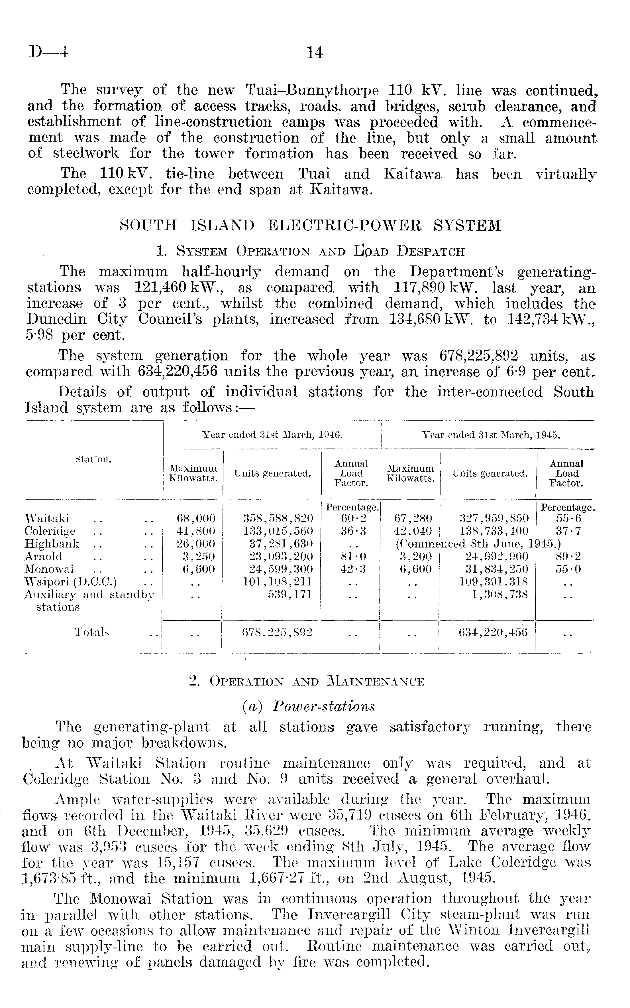 Station. Year ended 31st March, 1946. Year ended 31st March, 1945. Maximum Kilowatts. Units generated. Annual Load Factor. Maximum Kilowatts. 1 Units generated. Annual Load Factor. Waitaki Coleridge Highbank Arnold Monowai Waipori (D.C.C.) Auxiliary and standby stations Totals j 68,000 41,800 26,000 3,250 6,600 358,588,820 133,015,560 37,281,630 23,093,200 24,599,300 101,108,211 539,171 Percentage. 60-2 36-3 81-0 42-3 67,280 42,040 (Comme 3,200 6,600 327,959,850 138,733,400 snced 8th June, 1! 24,992,900 31,834,250 109,391,318 1,308,738 Percentage. 55-6 37-7 945.) 89-2 55-0 678,225,892 634,220,456