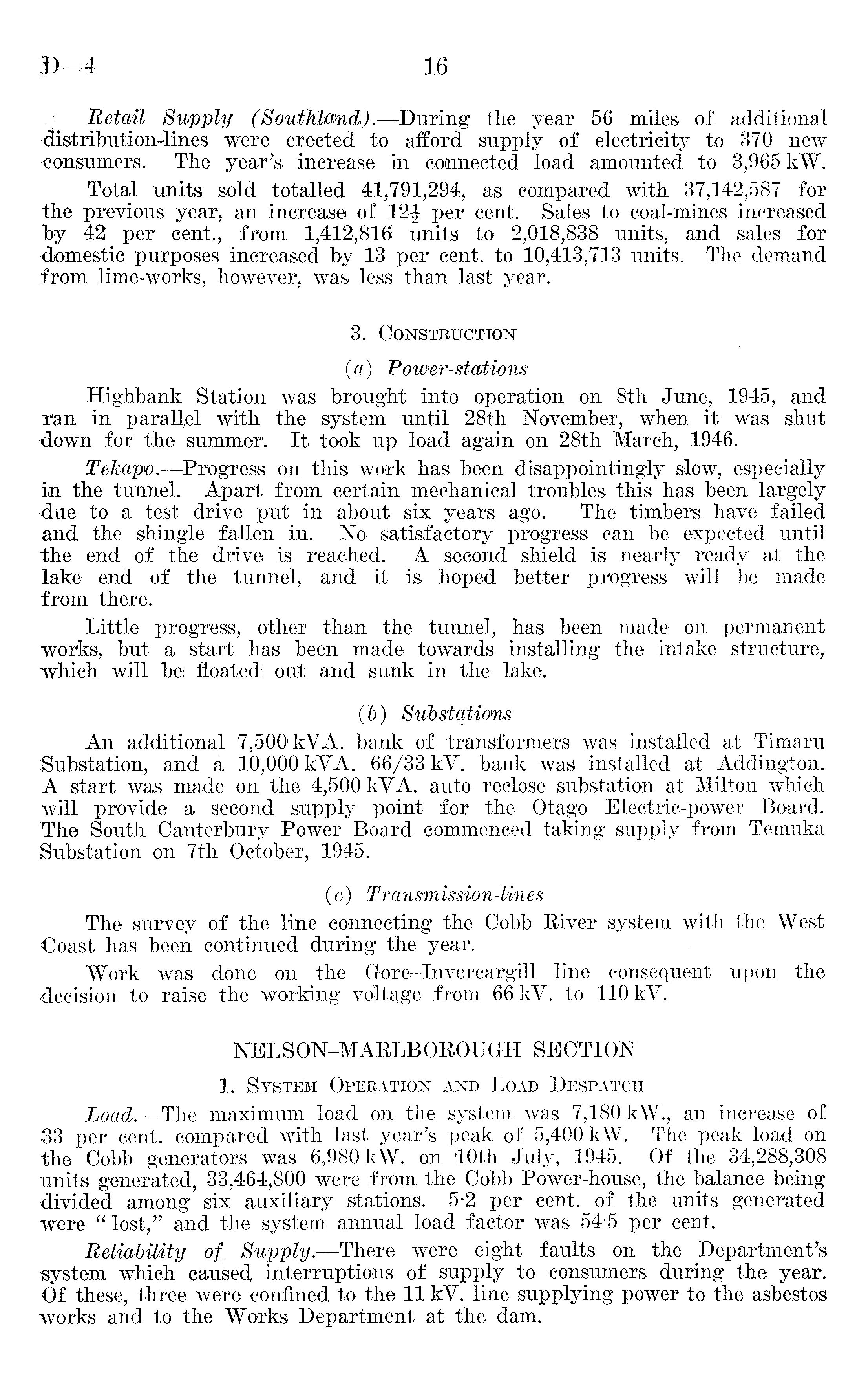 Retail Supply (Southland). —During the year 56 miles of additional distribution4ines were erected to afford supply of electricity to 370 new •consumers. The year's increase in connected load amounted to 3,965 kW. Total units sold totalled 41,791,294, as compared with 37,142,587 for the previous year, an increase of 12|- per cent. Sales to coal-mines increased by 42 per cent., from 1,412,816 units to 2,018,838 units, and sales for ■domestic purposes increased by 13 per cent, to 10,413,713 units. The demand from lime-works, however, was less than last year. 3. Construction (a) Power-stations Highbank Station was brought into operation on Bth June, 1945, and ran in parallel with the system until 28th November, when it was shut down for the summer. It took up load again on 28th March, 1946. Tekapw. —Progress, on this work has been disappointingly slow, especially in the tunnel. Apart from certain mechanical troubles this has been largely •due to a test drive put in about six years ago. The timbers have failed and the shingle fallen in. No satisfactory progress can be expected until the end of the drive is reached. A second shield is nearly ready at the lake end of the tunnel, and it is hoped better progress will be made from there. Little progress., other than the tunnel, has been made on permanent works, but a start has been made towards installing the intake structure, which will be floated out and sunk in the lake. (5) Substations An additional 7,500 kVA. bank of transformers was installed at Timaru Substation, and a 10,000 kVA. 66/33 kV. bank was installed at Addington. A start was made on the 4,500 kVA. auto reclose substation at Milton which will provide a second supply point for the Otago Electric-power Board. The South Canterbury Power Board commenced taking supply from Temuka Substation on 7th October, 1945. (c) Trainsmission-lin es The survey of the line connecting the Cobb River system with the West Coast has been continued during the year. Work was done on the Gore-Invereargill line consequent upon the decision to raise the working voltage from 66 kV. to 110 kV. NELSON-MARLBOROUGH SECTION 1. System Operation and Load Despatch Load. —The maximum load on the system was 7,180 kW., an increase of 33 per cent, compared with last year's peak of 5,400 kW. The peak load on the Cobb generators was 6,980 kW. on 10th July, 1945. Of the 34,288,308 units generated, 33,464,800 were from the Cobb Power-house, the balance being divided among six auxiliary stations, 5-2 per cent, of the units generated were " lost," and the system annual load factor was 54-5 per cent. Reliability of, Supply. —There were eight faults on the Department's system which caused interruptions of supply to consumers during the year. Of these, three were confined to the 11 kV. line supplying power to the asbestos works and to the Works Department at the dam.