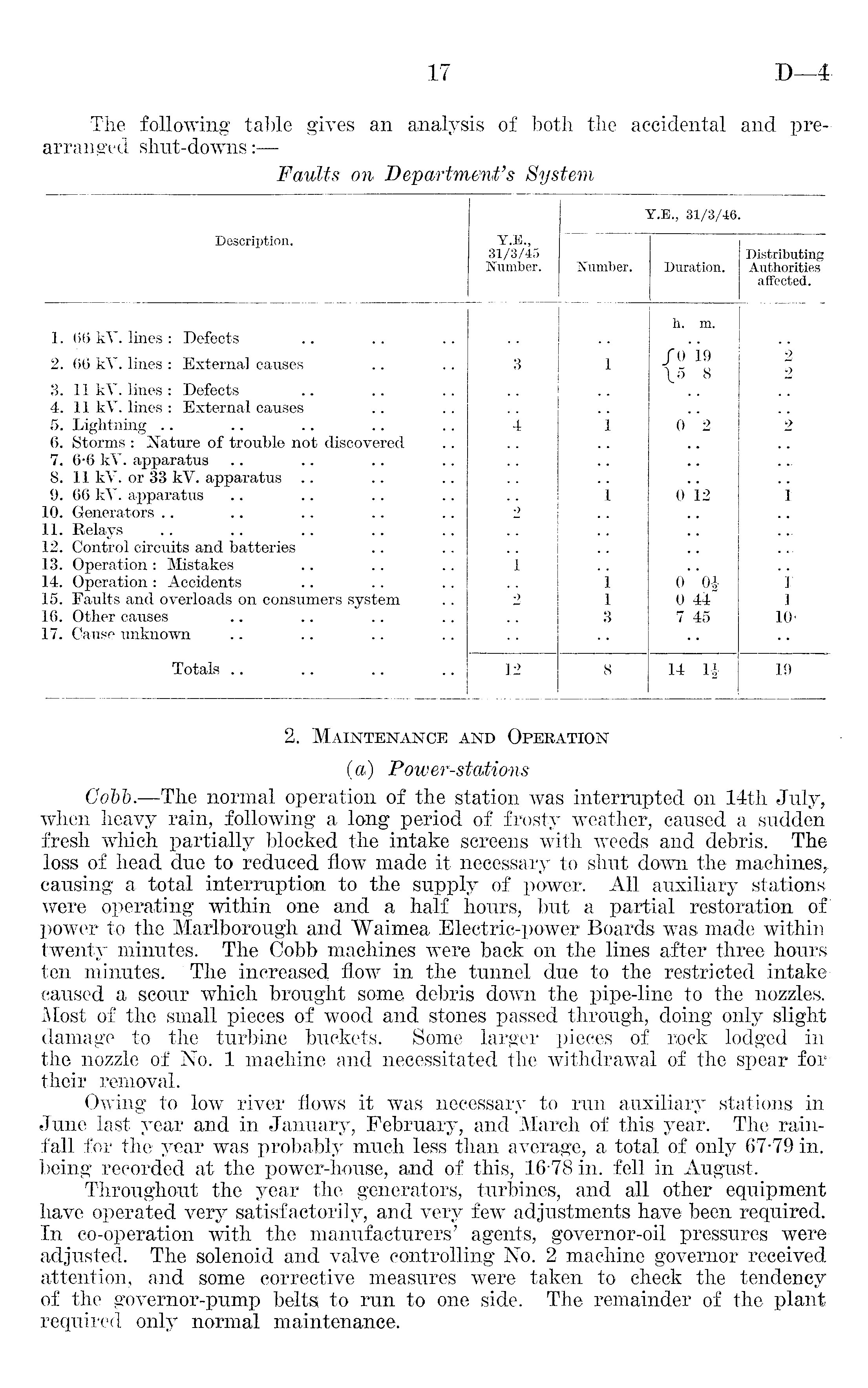 Y.E., 31/3/46. Description. Y.E., 31/3/45 Number. Number. Duration. Distributing Authorities affected. 1. 66 kV. lines : Defects h. m. 2. 66 kV. lines : External causes 3 1 / 0 19 \5 8 0* *2 o'i2 o"o£ 0 44 7 45 2 2 3. 11 kV. lines : Defects 4. 11 kV. lines : External causes 5. Lightning 6. Storms : Nature of trouble not discovered 7. 6*6 kV. apparatus 8. 11 kV. or 33 kV. apparatus 9. 66 kV. apparatus 10. Generators 11. Relays 12. Control circuits and batteries 13. Operation : Mistakes 14. Operation : Accidents 15. Faults and overloads on consumers system 16. Other causes 17. Cause unknown i I 3 2 i i I lO Totals .. 12 8 14 1£ 19