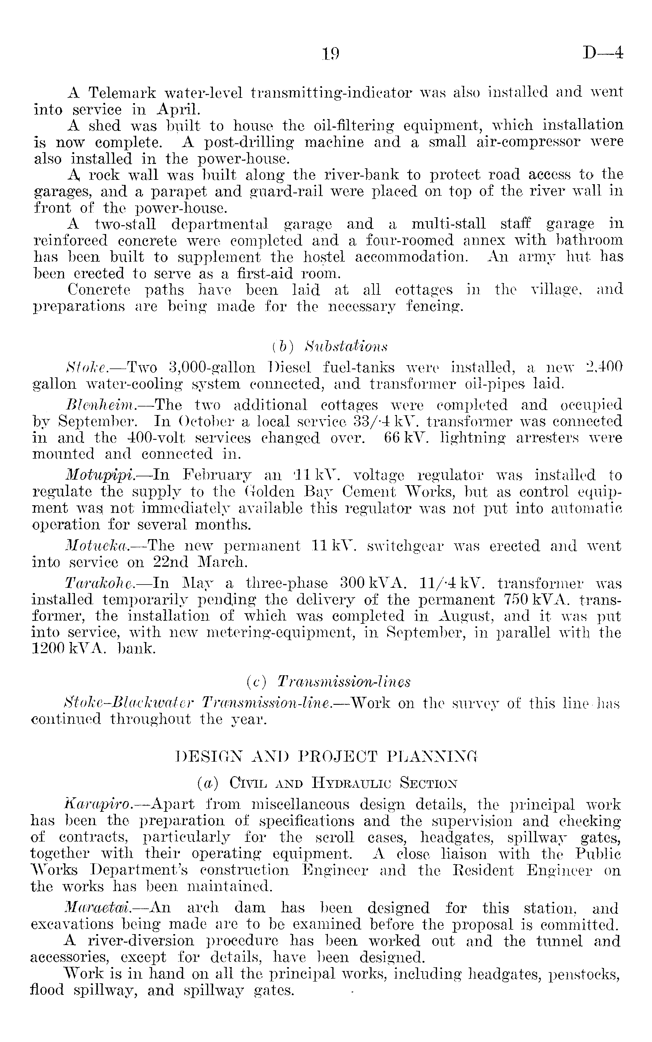 A Telemark water-level transmitting-indicator was also installed and went Into service in April. A shed was built to house the oil-filtering equipment, which installation is now complete. A post-drilling machine and a small air-compressor were also installed in the power-house. A rock wall was built along the river-bank to protect road access to the garages, and a parapet and guard-rail were placed on top of the river wall in front of the power-house. A two-stall departmental garage and a multi-stall staff garage in reinforced concrete were completed and a four-roomed annex with bathroom has been built to supplement the hostel accommodation. An army hut has been erected to serve as a first-aid room. Concrete paths have been laid at all cottages in the village, and preparations are being made for the necessary fencing. (b) Substations Stoke. —Two 3,000-gallon Diesel fuel-tanks were installed, a new 2,400 gallon water-cooling system connected, and transformer oil-pipes laid. Blenheim. —The two additional cottages were completed and occupied by September. In October a local service 33/4 kV. transformer was connected in and the 400-volt services changed over. 66 kV. lightning arresters were mounted and connected in. Motupipi. —ln February an 11 kV. voltage regulator was installed to regulate the supply to the Golden Bay Cement Works, but as control equipment was; not immediately available this regulator was not put into automatic operation for several months. Motneka. —The new permanent 11 kV. switchgear was erected and went into service on 22nd March. Tarakohe.— -In May a three-phase 300 kVA. 11/-4 kV. transformer was installed temporarily pending the delivery of the permanent 750 kVA. transformer, the installation of which was completed in August, and it was put into service, with new metering-equipment, in September, in parallel with the 1200 kVA. bank. (c) Transmission-lines Stoke-Blackwater Tramsmission-line. —Work on the survey of this line has continued throughout the year. DESIGN AND PROJECT PLANNING (a) Civil and Hydraulic Section Karapiro. —Apart from miscellaneous design details, the principal work has been the preparation of specifications and the supervision and checking of contracts, particularly for the scroll cases, headgates, spillway gates, together with their operating equipment. A close liaison with the Public Works Department's construction Engineer and the Resident Engineer on the works has been maintained. Momcmkd. —An arch dam has been designed for this station, and excavations being made are to be examined before the proposal is committed. A river-diversion procedure has been worked out and the tunnel and accessories, except for details, have been designed. Work is in hand on all the principal works, including headgates, penstocks, flood spillway, and spillway gates.