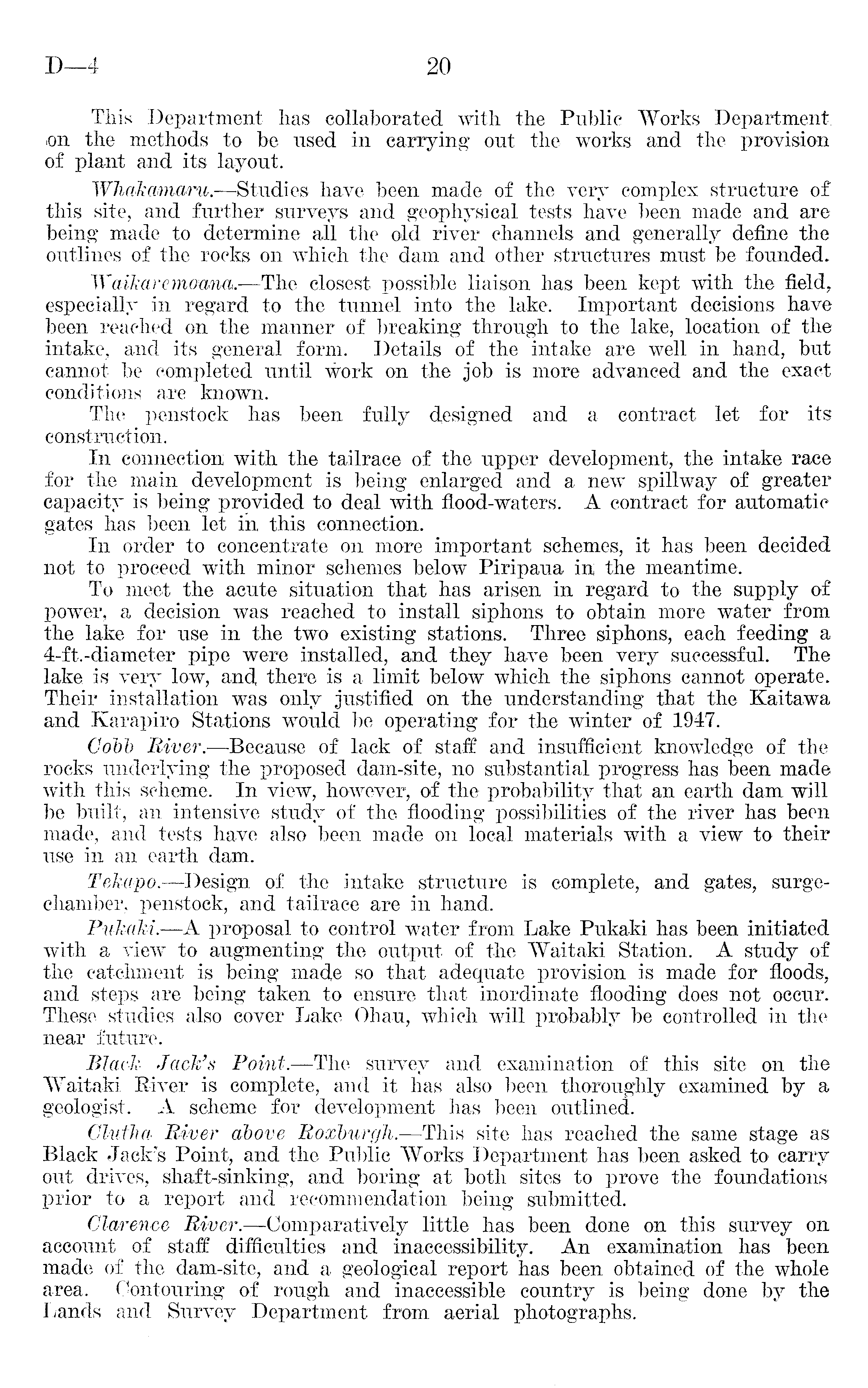 This Department has collaborated with the Public Works Department on the methods to be used in carrying- out the works and the provision of plant and its layout. Whakamaru. —Studies have been made of the very complex structure of this site, and further surveys and geophysical tests have been made and are being made to determine all the old river channels and generally define the outlines of the rocks on which the dam and other structures must be founded* Waikaremomia. —The closest possible liaison has been kept with the field, especially in regard to the tunnel into the lake. Important decisions have been reached on the manner of breaking through to the lake, location of the intake, and its general form. Details of the intake are well in hand, but cannot be completed until work on the job is more advanced and the exact conditions are known. The penstock has been fully designed and a contract let for its construction. In connection with the tailrace of the upper development, the intake race for the main development is being enlarged and a new spillway of greater capacity is being provided to deal with flood-waters. A contract for automatic gates has been let in this connection. In order to concentrate on more important schemes, it has been decided not to proceed with minor schemes below Piripaua in the meantime. To meet the acute situation that has arisen in regard to the supply of power, a decision was reached to install siphons to obtain more water from the lake for use in the two existing stations. Three siphons, each feeding a 4-ft.-diameter pipe were installed, and they have been very successful. The lake is very low, and, there is a limit below which the siphons cannot operate. Their installation was only justified on the understanding that the Kaitawa and Karapiro Stations would be operating for the winter of 1947. Cobb River. —Because of lack of staff and insufficient knowledge of the rocks underlying the proposed dam-site, no substantial progress has been made with this scheme. In view, however, of the probability that an earth dam will be built, an intensive study of the flooding possibilities of the river has been made, and tests have also been made on local materials with a view to their use in an earth dam. Tekapo. —Design of the intake structure is complete, and gates, surgechamber, penstock, and tailrace are in hand. Pukaki. —A proposal to control water from Lake Pukaki has been initiated with a view to augmenting the output of the Waitaki Station. A study of the catchment is being made so that adequate provision is made for floods, and steps are being taken to ensure that inordinate flooding does not occur. These studies also cover Lake Ohau, which will probably be controlled in the near future. Black Jack's Point. —The survey and examination of this site on the Waitaki River is complete, and it has also been thoroughly examined by a geologist. A scheme for development has been outlined. Clutha River above Roxburgh. —This site has reached the same stage as Black Jack's Point, and the Public Works Department has been asked to carry out drives, shaft-sinking, and boring at both sites to prove the foundations prior to a report and recommendation being submitted. Clarence River. —Comparatively little has been done on this survey on account of staff difficulties and inaccessibility. An examination has been made of the dam-site, and a geological report has been obtained of the whole area. Contouring of rough and inaccessible country is being done by the Lands and Survey Department from aerial photographs.