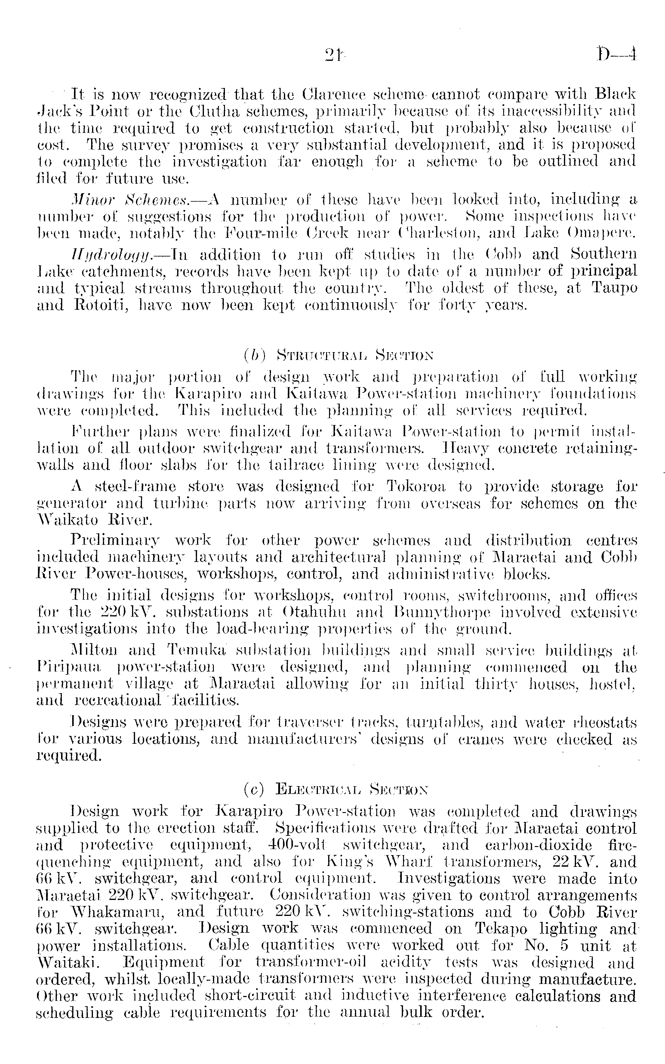 ' It is now recognized that the Clarence scheme cannot compare with Black Jack's Point or the Clutha schemes, primarily because of its inaccessibility and the time required to get construction started, but probably also because of cost. The survey promises a very substantial development, and it is proposed to complete the investigation far enough for a scheme to be outlined and filed for future use. Minor Schemes. —A number of these have been looked into, including a number of suggestions for the production of power. Some inspections have been made, notably the Four-mile Creek near Charleston, and Lake Omapere. Hydrology. —ln addition to run off studies in the .Cobb and Southern Lake catchments, records have been kept up to date of a number of principal and typical streams throughout the country. The oldest of these, at Taupo and Rotoiti, have now been kept continuously for forty years. (0) Structural Section The major portion of design work and preparation of full working drawings for the Karapiro and Kaitawa Power-station machinery foundations were completed. This included the planning of all services required. Further plans were finalized for Kaitawa Power-station to permit installation of all outdoor switchgear and transformers. Heavy concrete retainingwalls and floor slabs for the tailrace lining were designed. A steel-frame store was designed for Tokoroa to provide storage for generator and turbine parts now arriving from overseas for schemes on the AVaikato River. Preliminary work for other power schemes and distribution centres included machinery layouts and architectural planning of Maraetai and Cobb River Power-houses, workshops, control, and administrative blocks. The initial designs for workshops, control rooms, switehrooms, and offices for the 220 kV. substations at Otahuhu and Buimythorpe involved extensive investigations into the load-bearing properties of the ground. Milton and Temuka substation buildings and small service buildings at Piripaua power-station were designed, and planning commenced on the permanent village at Maraetai allowing for an initial thirty houses, hostel, and recreational facilities. Designs were prepared for traverser tracks, turntables, and water rheostats for various locations, and manufacturers' designs of cranes were checked as required. (c) Electrical Sectson Design work for Karapiro Power-station was completed and drawings supplied to the erection staff. Specifications were drafted for Maraetai control and protective equipment, 400-volt switchgear, and carbon-dioxide firequenching equipment, and also for King's Wharf transformers, 22 kV. and 66 kV. switchgear, and control equipment. Investigations were made into Maraetai 220 kV. switchgear. Consideration was given to control arrangements for Whakamaru, and future 220 kV. switching-stations and to Cobb River 66 kV. switchgear. Design work was commenced on Tekapo lighting and power installations. Cable quantities were worked out for No. 5 unit at Waitaki. Equipment for transformer-oil acidity tests was designed and ordered, whilst locally-made transformers were inspected during manufacture. Other work included short-circuit and inductive interference calculations and scheduling cabie requirements for the annual bulk order.