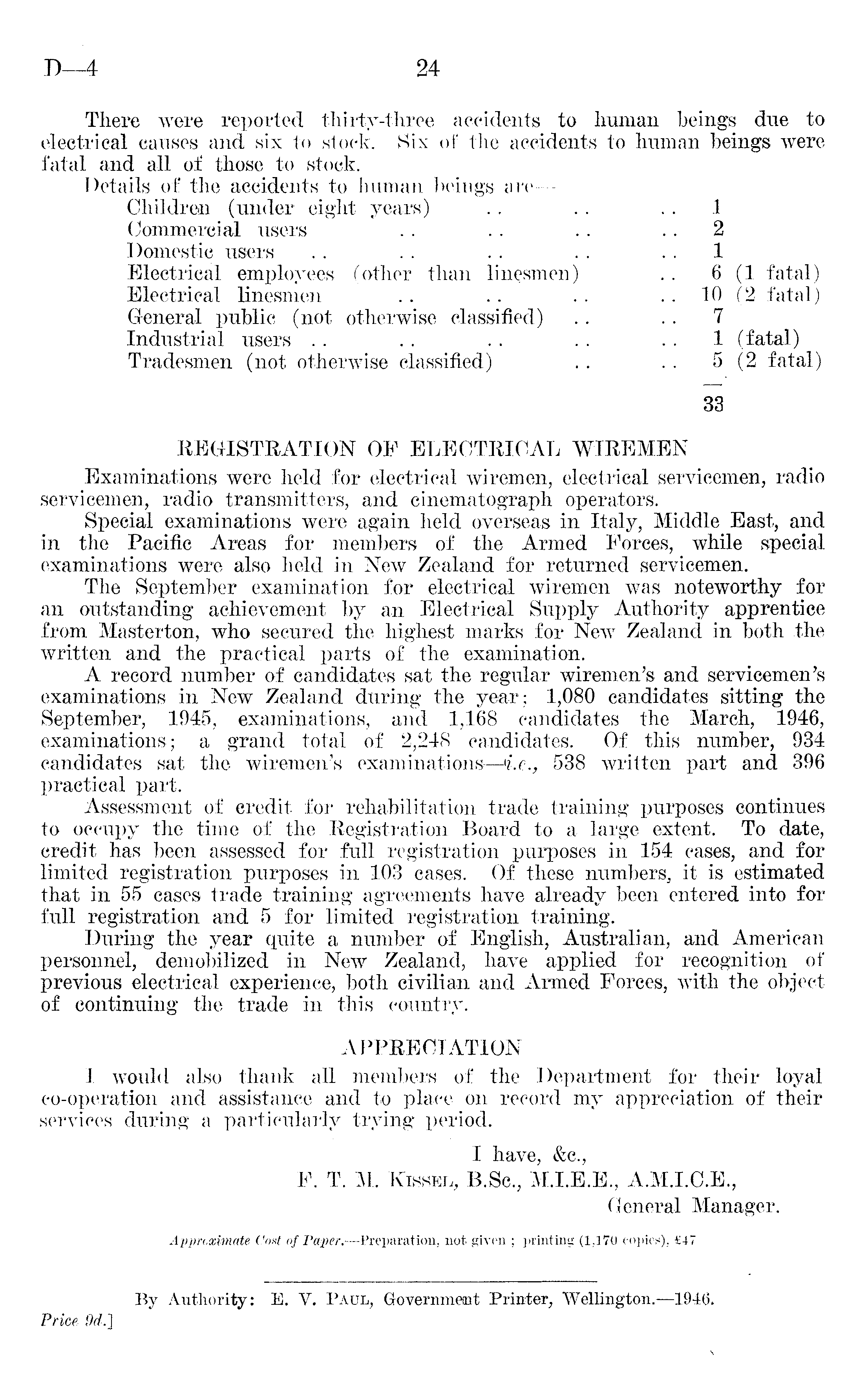 There were reported thirty-three accidents to human beings due to electrical causes and six to stock. Six of the accidents to human beings were fatal and all of those to stock. Details of the accidents to human beings are—■ Children (under eight years) . . .. .. 1 Commercial users . . . . . . . . 2 Domestic users . . . . . . . . . . 1 Electrical employees (other than linesmen) .. 6(1 fatal) Electrical linesmen .. .. .. ..10 (2 fatal) General public (not otherwise classified) . . . . 7 Industrial users . . . . . . . . . . 1 (fatal) Tradesmen (not otherwise classified) .. .. 5 (2 fatal) 33 REGISTRATION OF ELECTRICAL WIREMEN Examinations were held for electrical wiremen, electrical servicemen, radio servicemen, radio transmitters, and cinematograph operators. Special examinations were again held overseas in Italy, Middle East, and in the Pacific Areas for members of the Armed Forces, while special examinations were also held in New Zealand for returned servicemen. The September examination for electrical wiremen was noteworthy for an outstanding achievement by an Electrical Supply Authority apprentice from Masterton, who secured the highest marks for New Zealand in both the written and the practical parts of the examination. A record number of candidates sat the regular wiremen's and servicemen's examinations in New Zealand during the year; 1,080 candidates sitting the September, 1945, examinations, and 1,168 candidates the March, 1946, examinations; a grand total of 2,248 candidates. Of this number, 934 candidates sat the wiremen's examinations — i.e., 538 written part and 396 practical part. Assessment of credit for rehabilitation trade training purposes continues to occupy the time of the Registration Board to a large extent. To date, credit has been assessed for full registration purposes in 154 cases, and for limited registration purposes in 103 cases. Of these numbers, it is estimated that in 55 cases trade training agreements have already been entered into for full registration and 5 for limited registration training. During the year quite a number of English, Australian, and American personnel, demobilized in New Zealand, have applied for recognition of previous electrical experience, both civilian and Armed Forces, with the object of continuing the trade in this country. APPRECIATION I would also thank all members of the Department for their loyal co-operation and assistance and to place on record my appreciation of their services during a particularly trying period. I have, &c, F. T. M. Kissel, B.Sc, M.1.E.E., A.M.1.C.E., General Manager. Approximate Cost of Paper. —Preparation, not given ; printing (1,170 copies), £47