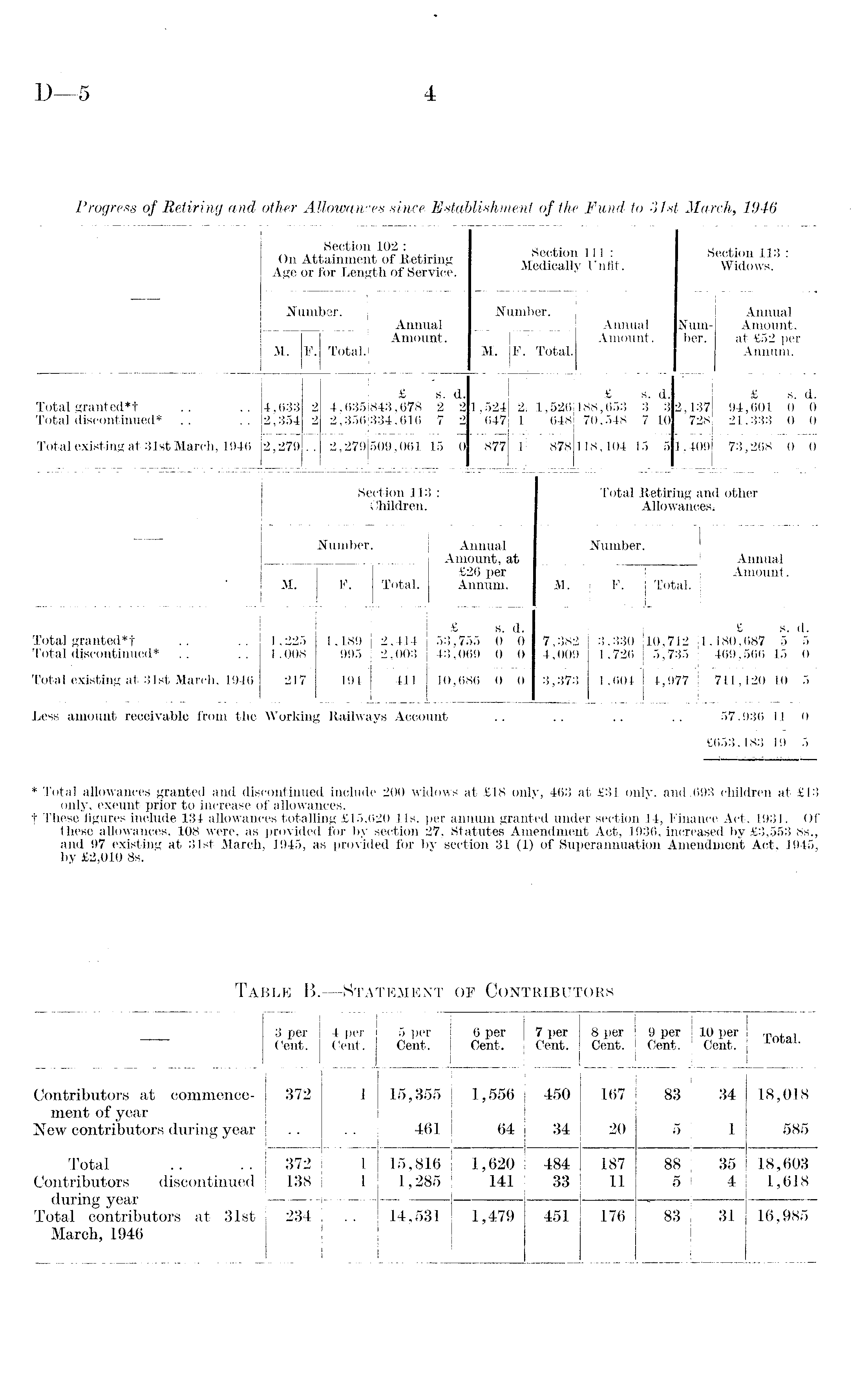 Section 102 : On Attainment of Retiring Age or for Length of Service. Section 111 : Medically Unfit. Section 113 : Widows. Number. Annual Number. Annual NumAnnual Amount, M. F. Total. Amount. M. F. Total. Amount. ber. at £52 per Annum. Total granted* t Total discontinued* 4,633 2,354 4,635 2,356 £ 843,678 334,616 s. d. 2 2 7 2 1,524 647 2 1 1,526 648 £ s. d. 188,653 3 3 70,548 7 10 2,137 728 £ s. d. 94,601 0 0 21,333 0 0 Total existing at 31st March, 1946 2,279 2,279 509,061 15 0 877 1 878 118,104 1! 5 5 1,409 73,268 0 0 Section 113 : Children. Total Retiring and other Allowances! — Number. Annual Amount, at Number. Annual M. F. Total. £26 per Annum. M. F. Total. Amount. Total granted*! Total discontinued* 1,225 1,008 1,189 995 2,414 2,003 £ s. 53,755 0 43,069 0 d. 0 0 7,382 4,009 3,330 1,726 10,712 5,735 £ s. d. 1,180,68? 5 5 469,566 15 0 Total existing at 31st March, 1940 217 194 411 10,686 0 0 3,373 1,604 4,977 711,120 10 5 Less amount receivable from the Working Railways Account 57,936 11 0 £653,183 19 :> * Total allowances granted and discontinued include 200 widows at £18 only, 463 at £31 only, and .693 children at £13 only, exeunt prior to increase of allowances, f These figures include 134 allowances totalling £15,620 lis. per annum granted under section 14, Finance Act, 1931. Of these allowances, 108 were, as provided for by section 27, Statutes Amendment Act, 1936, increased by £3,553 8s., and 97 existing at 31st March, 1945, as provided for by section 31 (1) of Superannuation Amendment Act, 1945, by £2,010 8s.