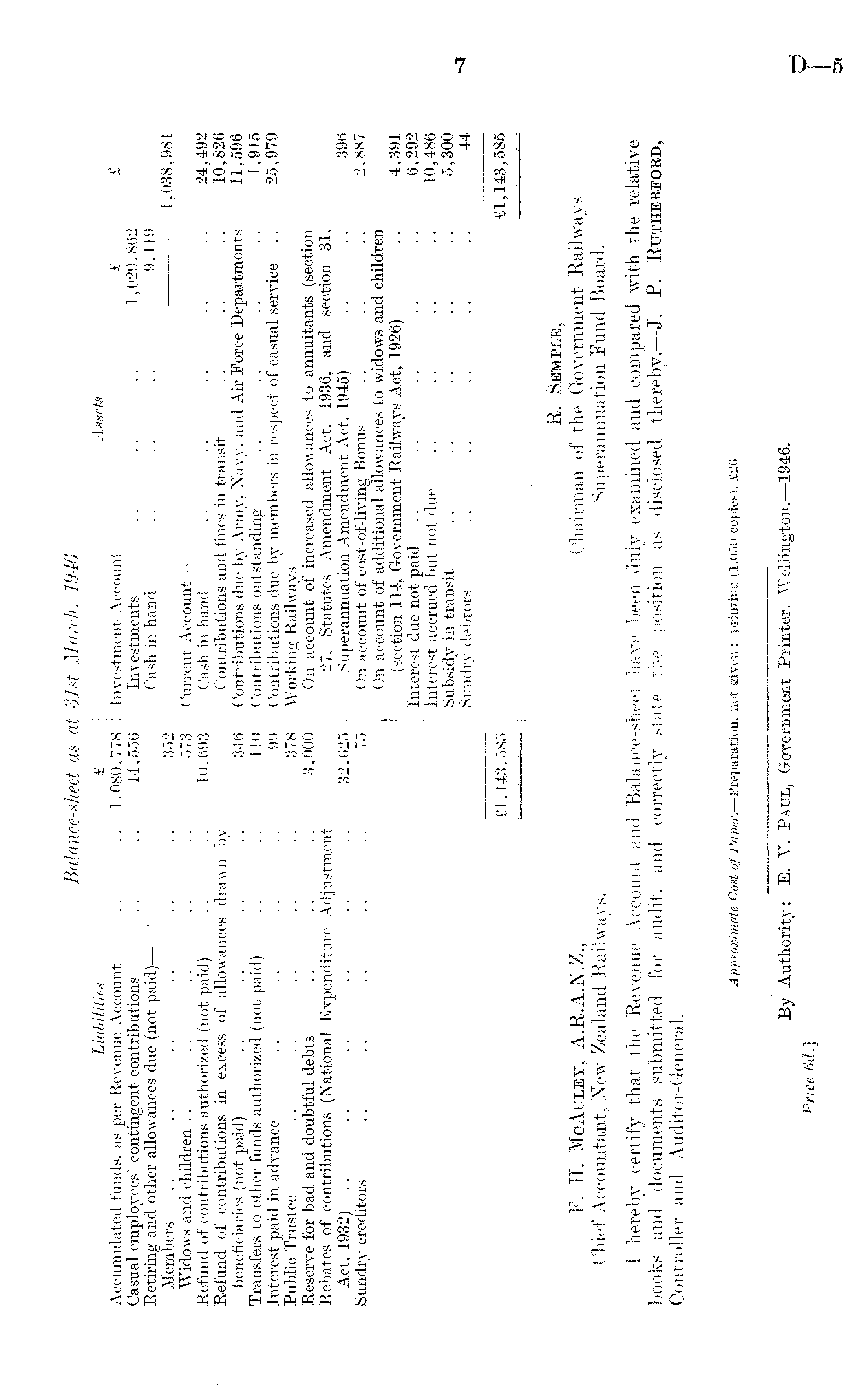 Balance- sheet as at 31st March, 19A6 Liabilities £ j Assets Accumulated funds, as per Revenue Account .. .. 1,080,778 Investment Account— £ £ Casual employees' contingent contributions .. .. 14,556 i Investments .. .. .. 1,029,862 Retiring and other allowances due (not paid)— ' ! Cash in hand . . . . . . 9,119 Members .. .. .. .. .. .. 352 1,038,981 Widows and children .. .. . . .. . . 573 j Current Account— Refund of contributions authorized (not paid) .. .. 10,693 ! Cash in hand .. .. .. .. .. 24,492 Refund of contributions in excess of allowances drawn by ! Contributions and fines in transit .. .. .. 10,826 beneficiaries (not paid) .. .. .. .. 346 Contributions due by Army, Navy, and Air Force Departments 11,596 Transfers to other funds authorized (not paid) .. .. 110 ' Contributions outstanding .. .. .. .. 1,915 Interest paid in advance .. .. .. .. 99 Contributions due by members in respect of casual service .. 25,979 Public Trustee .. .. . . . . .. 378 : Working Railways— Reserve for bad and doubtful debts . . . . . . 3,000 i On account of increased allowances to annuitants (section . Rebates of contributions (National Expenditure Adjustment I 27, Statutes Amendment Act, 1936, and section 31, Act, 1932) .. .. .. .. .. .. 32,625 I Superannuation Amendment, Act, 1945) .. .. 396 Sundry creditors .. .. .. .. .. 75 On account of cost-of-living Bonus .. .. .. 2,887 On account of additional allowances to widows and children (section 114, Government Railways Act, 1926) . . 4,391 Interest due not paid . . . . .. .. .. 6,292 Interest accrued but not due .. .. .. .. 10,486 Subsidy in transit .. .. .. .. .. 5,300 Sundry debtors .. .. .. .. . . 44 £1,143,585 £1,143,585 R. Semple, F. H. McAuley, A.R.A.N.Z., Chairman of the Government Railways Chief Accountant, New Zealand Railways. Superannuation Fund Board. I hereby certify that the Revenue Account and Balance-sheet have been duly examined and compared with the relative books and documents submitted for audit, and correctly state the position as disclosed thereby.— J. P. Rutherford, Controller and Auditor-General.