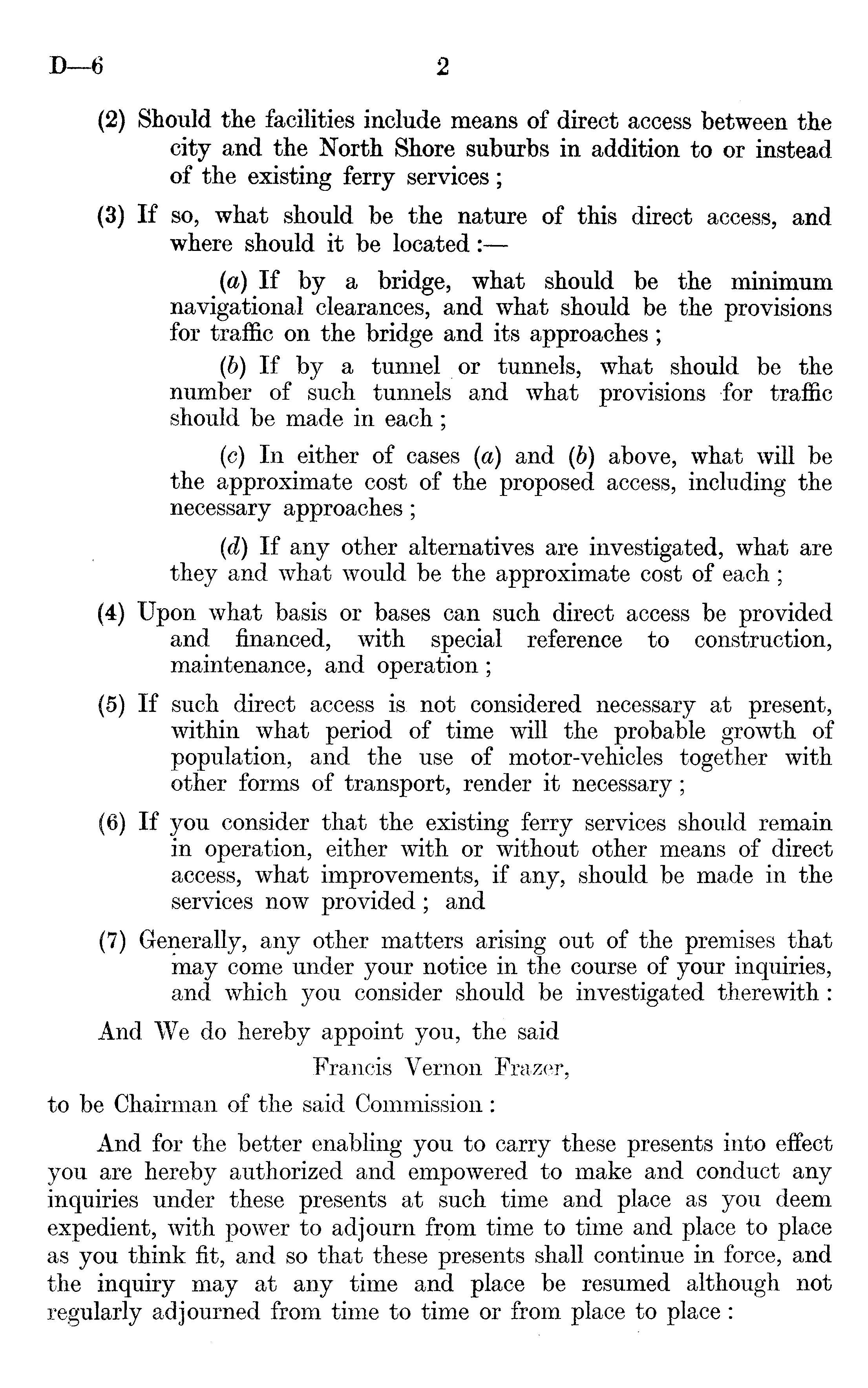(2) Should the facilities include means of direct access between the city and the North Shore suburbs in addition to or instead of the existing ferry services; (3) If so, what should be the nature of this direct access, and where should it be located:— (a) If by a bridge, what should be the minimum navigational clearances, and what should be the provisions for traffic on the bridge and its approaches ; (b) If by a tunnel or tunnels, what should be the number of such tunnels and what provisions for traffic should be made in each; (c) In either of cases (a) and (b) above, what will be the approximate cost of the proposed access, including the necessary approaches; (d) If any other alternatives are investigated, what are they and what would be the approximate cost of each; (4) Upon what basis or bases can such direct access be provided and financed, with special reference to construction, maintenance, and operation; (5) If such direct access is not considered necessary at present, within what period of time will the probable growth of population, and the use of motor-vehicles together with other forms of transport, render it necessary; (6) If you consider that the existing ferry services should remain in operation, either with or without other means of direct access, what improvements, if any, should be made in the services now provided ; and (7) Generally, any other matters arising out of the premises that may come under your notice in the course of your inquiries, and which you consider should be investigated therewith: And We do hereby appoint you, the said Francis Vernon Frazer, to be Chairman of the said Commission: And for the better enabling you to carry these presents into effect you are hereby authorized and empowered to make and conduct any inquiries under these presents at such time and place as you deem expedient, with power to adjourn from time to time and place to place as you think fit, and so that these presents shall continue in force, and the inquiry may at any time and place be resumed although not regularly adjourned from time to time or from place to place: