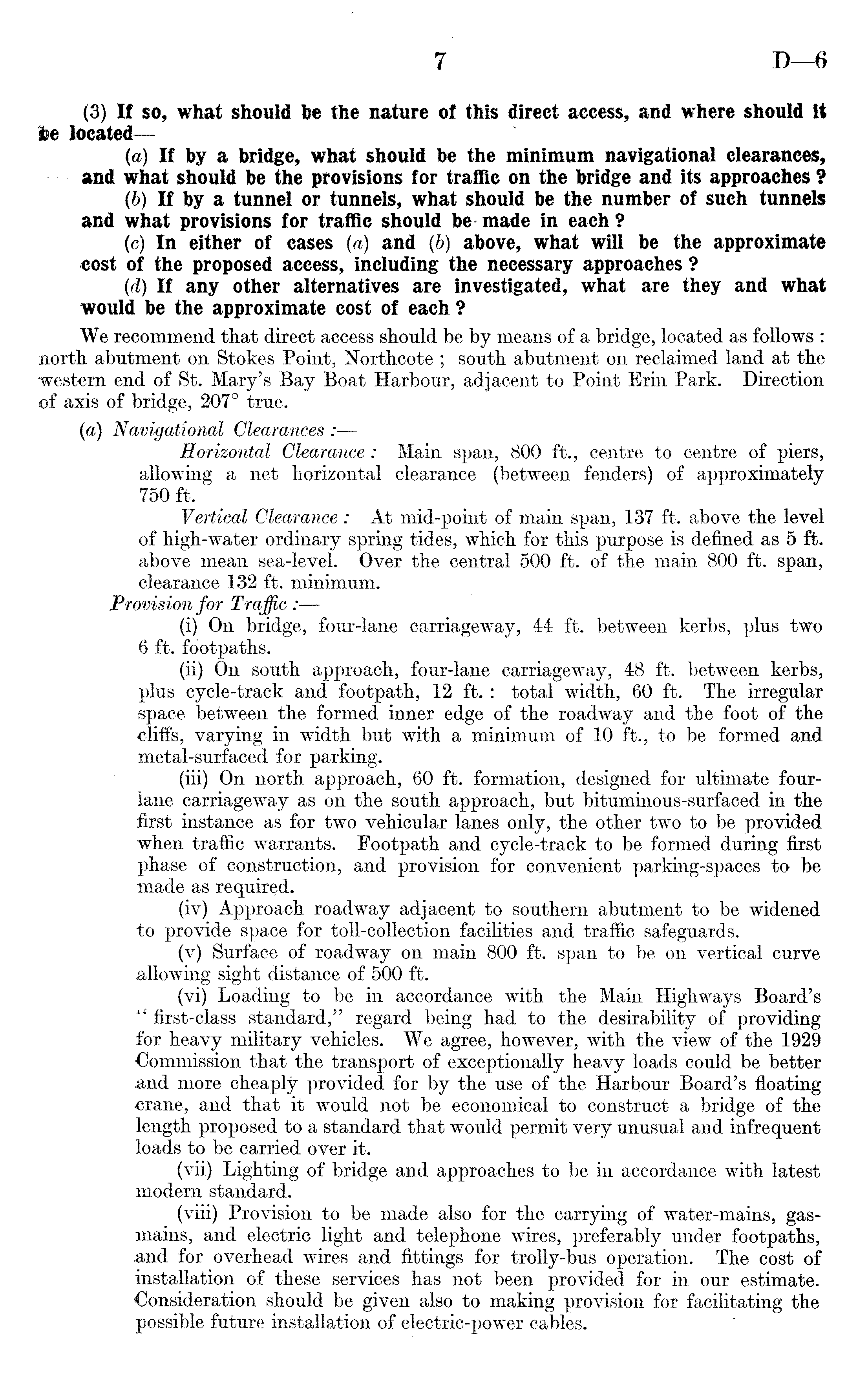 (3) If so, what should be the nature of this direet access, and where should It he located—(a) If by a bridge, what should be the minimum navigational clearances, and what should be the provisions for traffie on the bridge and its approaches ? (6) If by a tunnel or tunnels, what should be the number of such tunnels and what provisions for traffic should be made in each ? (c) In either of cases (a) and (b) above, what will be the approximate cost of the proposed access, including the necessary approaches ? (d) If any other alternatives are investigated, what are they and what would be the approximate cost of each ? We recommend that direct access should be by means of a bridge, located as follows : north abutment on Stokes Point, Northcote ; south abutment on reclaimed land at the western end of St. Mary's Bay Boat Harbour, adjacent to Point Erin Park. Direction of axis of bridge, 207° true. (a) Navigational Clearances : Horizontal Clearance : Main span, 800 ft., centre to centre of piers, allowing a net horizontal clearance (between fenders) of approximately 750 ft. * Vertical Clearance: At mid-point of main span, 137 ft. above the level of high-water ordinary spring tides, which for this purpose is defined as 5 ft. above mean sea-level. Over the central 500 ft. of the main 800 ft. span, clearance 132 ft. minimum. Provision for Traffic : (i) On bridge, four-lane carriageway, 44 ft. between kerbs, plus two 6 ft. footpaths. (ii) On south approach, four-lane carriageway, 48 ft. between kerbs, plus cycle-track and footpath, 12 ft. : total width, 60 ft. The irregular space between the formed inner edge of the roadway and the foot of the cliffs, varying in width but with a minimum of 10 ft., to be formed and metal-surfaced for parking. (hi) On north approach, 60 ft. formation, designed for ultimate fourlane carriageway as on the south approach, but bituminous-surfaced in the first instance as for two vehicular lanes only, the other two to be provided when traffic warrants. Footpath and cycle-track to be formed during first phase of construction, and provision for convenient parking-spaces to be made as required. (iv) Approach roadway adjacent to southern abutment to be widened to provide space for toll-collection facilities and traffic safeguards. (v) Surface of roadway on main 800 ft. span to be on vertical curve allowing sight distance of 500 ft. (vi) Loading to be in accordance with the Main Highways Board's " first-class standard," regard being had to the desirability of providing for heavy military vehicles. We agree, however, with the view of the 1929 Commission that the transport of exceptionally heavy loads could be better and more cheaply provided for by the use of the Harbour Board's floating crane, and that it would not be economical to construct a bridge of the length proposed to a standard that would permit very unusual and infrequent loads to be carried over it. (vii) Lighting of bridge and approaches to be in accordance with latest modern standard. (viii) Provision to be made also for the carrying of water-mains, gasmains, and electric light and telephone wires, preferably under footpaths, and for overhead wires and fittings for trolly-bus operation. The cost of installation of these services has not been provided for in our estimate. Consideration should be given also to making provision for facilitating the possible future installation of electric-power cables.