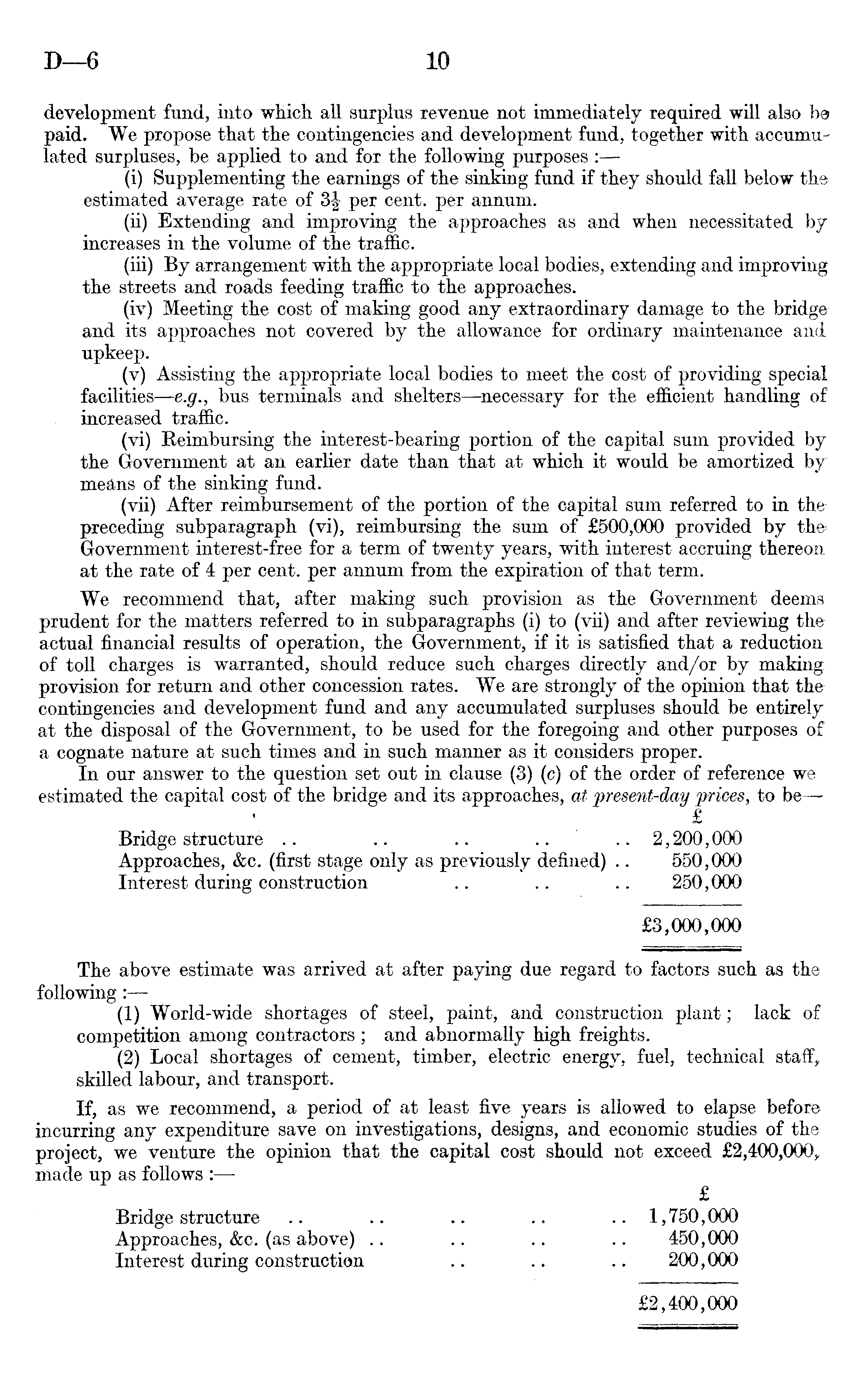 development fund, into which all surplus revenue not immediately required will also be paid. We propose that the contingencies and development fund, together with accumulated surpluses, be applied to and for the following purposes : (i) Supplementing the earnings of the sinking fund if they should fall below the estimated average rate of 3| per cent, per annum. (ii) Extending and improving the approaches as and when necessitated by increases in the volume of the traffic. (iii) By arrangement with the appropriate local bodies, extending and improving the streets and roads feeding traffic to the approaches. (iv) Meeting the cost of making good any extraordinary damage to the bridge and its approaches not covered by the allowance for ordinary maintenance and upkeep. (v) Assisting the appropriate local bodies to meet the cost of providing special facilities— e.g., bus terminals and shelters —necessary for the efficient handling of increased traffic. (vi) Keimbursing the interest-bearing portion of the capital sum provided by the Government at an earlier date than that at which it would be amortized by means of the sinking fund. (vii) After reimbursement of the portion of the capital sum referred to in the preceding subparagraph (vi), reimbursing the sum of £500,000 provided by the Government interest-free for a term of twenty years, with interest accruing thereon at the rate of 4 per cent, per annum from the expiration of that term. We recommend that, after making such provision as the Government deems prudent for the matters referred to in subparagraphs (i) to (vii) and after reviewing the actual financial results of operation, the Government, if it is satisfied that a reduction of toll charges is warranted, should reduce such charges directly and/or by making provision for return and other concession rates. We are strongly of the opinion that the contingencies and development fund and any accumulated surpluses should be entirely at the disposal of the Government, to be used for the foregoing and other purposes of a cognate nature at such times and in such manner as it considers proper. In our answer to the question set out in clause (3) (c) of the order of reference we estimated the capital cost of the bridge and its approaches, at present-day prices, to be—- £ Bridge structure .. .. .. .. .. 2,200,000 Approaches, &c. (first stage only as previously defined) .. 550,000 Interest during construction .. .. .. 250,000 £3,000,000 The above estimate was arrived at after paying due regard to factors such as the following: — (1) World-wide shortages of steel, paint, and construction plant; lack of competition among contractors ; and abnormally high freights. (2) Local shortages of cement, timber, electric energy, fuel, technical staff, skilled labour, and transport. If, as we recommend, a period of at least five years is allowed to elapse before incurring any expenditure save on investigations, designs, and economic studies of the project, we venture the opinion that the capital cost should not exceed £2,400,000, made up as follows : £ Bridge structure .. .. .. .. .. 1,750,000 Approaches, &c. (as above) .. .. .. .. 450,000 Interest during construction .. .. .. 200,000 £2,400,000