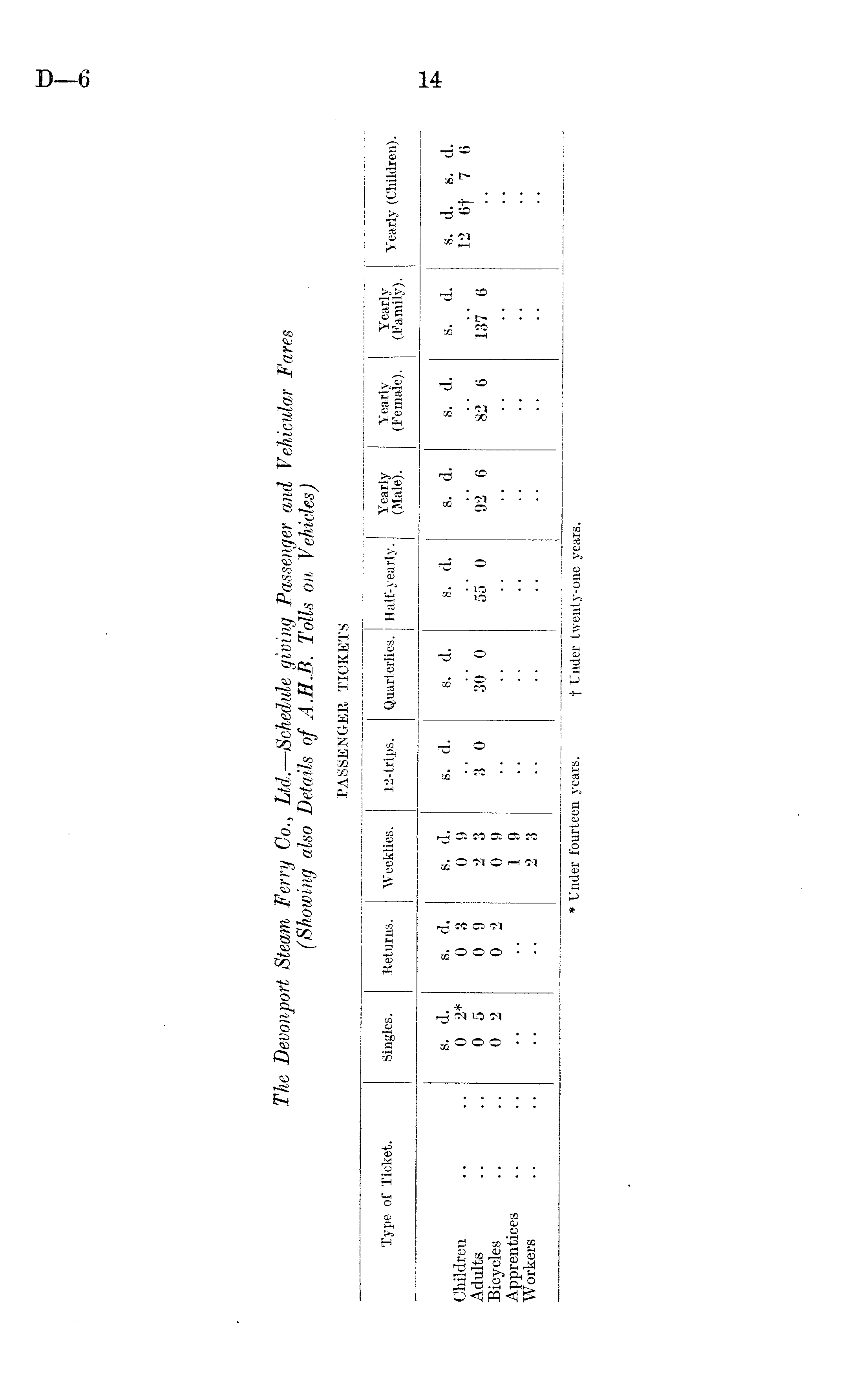 Type of Ticket. Singles. Returns. Weeklies. 12-trips. Quarterlies. Half-yearly. Yearly (Male). Yearly (Female). Yearly (Family). Yearly (Children). Children Adults Bicycles Apprentices Workers s. d. 0 2* 0 5 0 2 S. d. 0 3 0 9 0 2 s. d. 0 9 2 3 0 9 1 9 2 3 8. d. 3~ 0 s. d. 30 0 s. d. 55 0 s. d. 92* 6 s. d. 82 G S. d. 137 6 S. d. 8. d. 12 6f 7 6 * Under fourteen years. t Under twenty-one years.