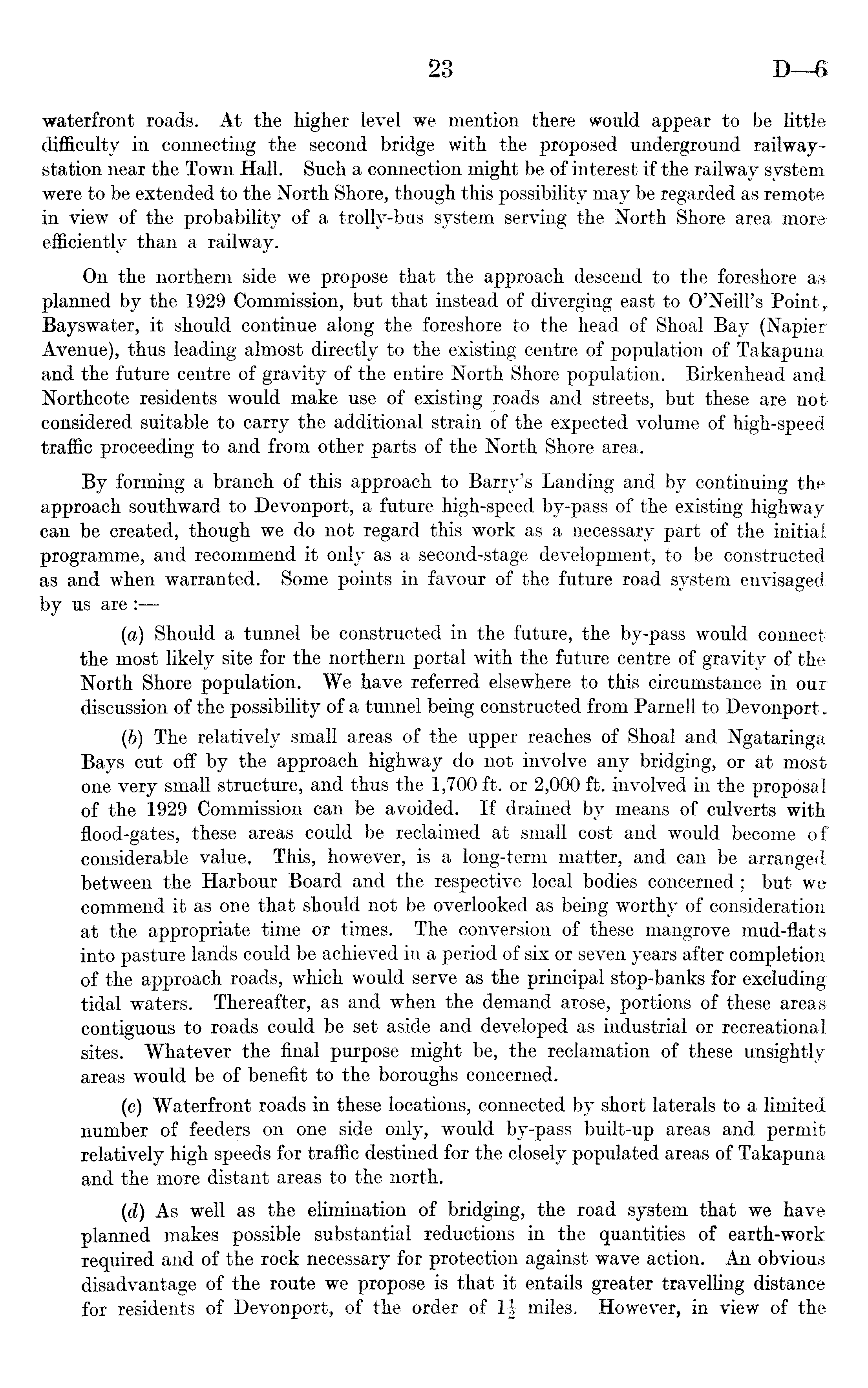 waterfront roads. At the higher level we mention there would appear to be little difficulty in connecting the second bridge with the proposed underground railwaystation near the Town Hall. Such a connection might be of interest if the railway system were to be extended to the North Shore, though this possibility may be regarded as remote in view of the probability of a trolly-bus system serving the North Shore area more efficiently than a railway. On the northern side we propose that the approach descend to the foreshore as planned by the 1929 Commission, but that instead of diverging east to O'Neill's Point,. Bayswater, it should continue along the foreshore to the head of Shoal Bay (Napier Avenue), thus leading almost directly to the existing centre of population of Takapuna and the future centre of gravity of the entire North Shore population. Birkenhead and Northcote residents would make use of existing roads and streets, but these are not considered suitable to carry the additional strain of the expected volume of high-speed traffic proceeding to and from other parts of the North Shore area. By forming a branch of this approach to Barry's Landing and by continuing the approach southward to Devonport, a future high-speed by-pass of the existing highway can be created, though we do not regard this work as a necessary part of the initial programme, and recommend it only as a second-stage development, to be constructed as and when warranted. Some points in favour of the future road system envisaged by us are : (a) Should a tunnel be constructed in the future, the by-pass would connect the most likely site for the northern portal with the future centre of gravity of the North Shore population. We have referred elsewhere to this circumstance in our discussion of the possibility of a tunnel being constructed from Parnell to Devonport. (b) The relatively small areas of the upper reaches of Shoal and Ngataringa Bays cut off by the approach highway do not involve any bridging, or at most one very small structure, and thus the 1,700 ft. or 2,000 ft. involved in the proposal of the 1929 Commission can be avoided. If drained by means of culverts with flood-gates, these areas could be reclaimed at small cost and would become of considerable value. This, however, is a long-term matter, and can be arranged between the Harbour Board and the respective local bodies concerned; but we commend it as one that should not be overlooked as being worthy of consideration at the appropriate time or times. The conversion of these mangrove mud-flats into pasture lands could be achieved in a period of six or seven years after completion of the approach roads, which would serve as the principal stop-banks for excluding tidal waters. Thereafter, as and when the demand arose, portions of these areas contiguous to roads could be set aside and developed as industrial or recreational sites. Whatever the final purpose might be, the reclamation of these unsightly areas would be of benefit to the boroughs concerned. (c) Waterfront roads in these locations, connected by short laterals to a limited number of feeders on one side only, would by-pass built-up areas and permit relatively high speeds for traffic destined for the closely populated areas of Takapuna and the more distant areas to the north. (d) As well as the elimination of bridging, the road system that we have planned makes possible substantial reductions in the quantities of earth-work required and of the rock necessary for protection against wave action. An obvious disadvantage of the route we propose is that it entails greater travelling distance for residents of Devonport, of the order of 1J miles. However, in view of the