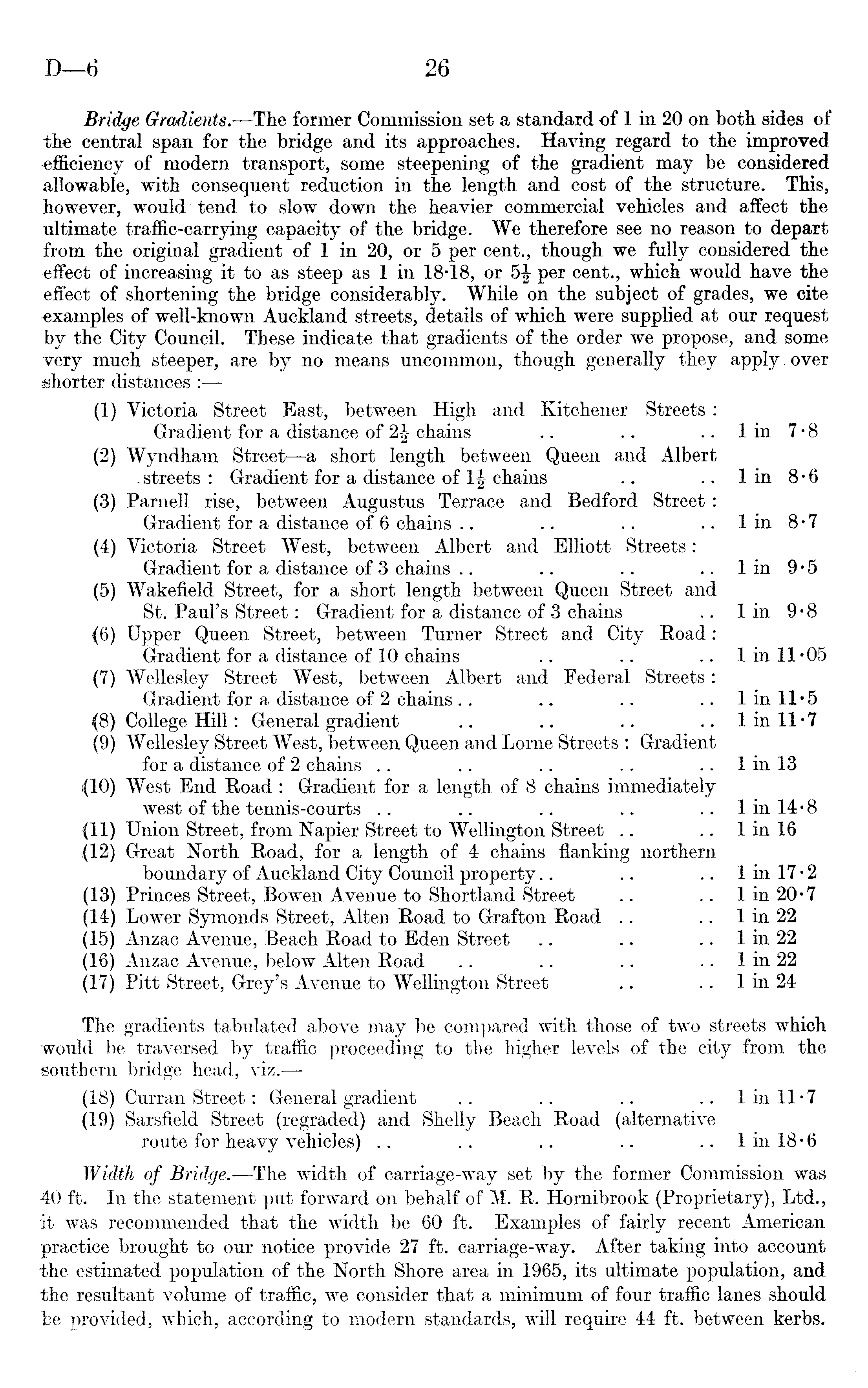 Bridge Gradients, —The former Commission set a standard of 1 in 20 on both sides of the central span for the bridge and its approaches. Having regard to the improved efficiency of modern transport, some steepening of the gradient may be considered allowable, with consequent reduction in the length and cost of the structure. This, however, would tend to slow down the heavier commercial vehicles and affect the ultimate traffic-carrying capacity of the bridge. "We therefore see no reason to depart from the original gradient of 1 in 20, or 5 per cent., though we fully considered the effect of increasing it to as steep as 1 in 18-18, or 5| per cent., which would have the effect of shortening the bridge considerably. While on the subject of grades, we cite examples of well-known Auckland streets, details of which were supplied at our request by the City Council. These indicate that gradients of the order we propose, and some very much steeper, are by no means uncommon, though generally they apply.over shorter distances : (1) Victoria Street Bast, between High and Kitchener Streets: Gradient for a distance of 1\ chains .. .. .. lin 7*B (2) Wyndham Street —a short length between Queen and Albert .streets : Gradient for a distance of \\ chains .. .. lin B*6 (3) Parnell rise, between Augustus Terrace and Bedford Street : Gradient for a distance of 6 chains .. .. .. .. 1 in B*7 (4) Victoria Street West, between Albert and Elliott Streets: Gradient for a distance of 3 chains .. .. .. lin 9• 5 (5) Wakefield Street, for a short length between Queen Street and St. Paul's Street: Gradient for a distance of 3 chains .. lin 9*B (6) Upper Queen Street, between Turner Street and City Road: Gradient for a distance of 10 chains .. .. .. 1 in 11 •05 (7) Wellesley Street West, between Albert and Federal Streets: Gradient for a distance of 2 chains .. .. .. .. lin 11*5 (8) College Hill: General gradient .. .. .. ..linll-7 (9) Wellesley Street West, between Queen and Lome Streets : Gradient for a distance of 2 chains .. .. .. .. .. 1 in 13 (10) West End Eoad : Gradient for a length of 8 chains immediately west of the tennis-courts .. .. .. .. .. lin 14-8 (11) Union Street, from Napier Street to Wellington Street .. .. lin 16 (12) Great North Road, for a length of 4 chains flanking northern boundary of Auckland City Council property.. .. .. linl7 • 2 (13) Princes Street, Bowen Avenue to Shortland Street .. .. lin 20-7 (11) Lower Symonds Street, Alten Road to Grafton Road .. .. lin 22 (15) Anzac Avenue, Beach Road to Eden Street .. .. .. lin 22 (16) Anzac Avenue, below Alten Road .. .. .. lin 22 (17) Pitt Street, Grey's Avenue to Wellington Street .. .. lin 21 The gradients tabulated above may be compared with those of two streets which would be traversed by traffic proceeding to the higher levels of the city from the southern bridge head, viz.— (18) Curran Street: General gradient .. .. .. ..linll-7 (19) Sarsfield Street (regraded) and Shelly Beach Road (alternative route for heavy vehicles) .. .. .. .. .. lin 18-6 Width of Bridge. —The width of carriage-way set by the former Commission was 40 ft. In the statement put forward on behalf of M. R. Hornibrook (Proprietary), Ltd., it was recommended that the width be 60 ft. Examples of fairly recent American practice brought to our notice provide 27 ft. carriage-way. After taking into account the estimated population of the North Shore area in 1965, its ultimate population, and the resultant volume of traffic, we consider that a minimum of four traffic lanes should be provided, which, according to modern standards, will require 44 ft. between kerbs.