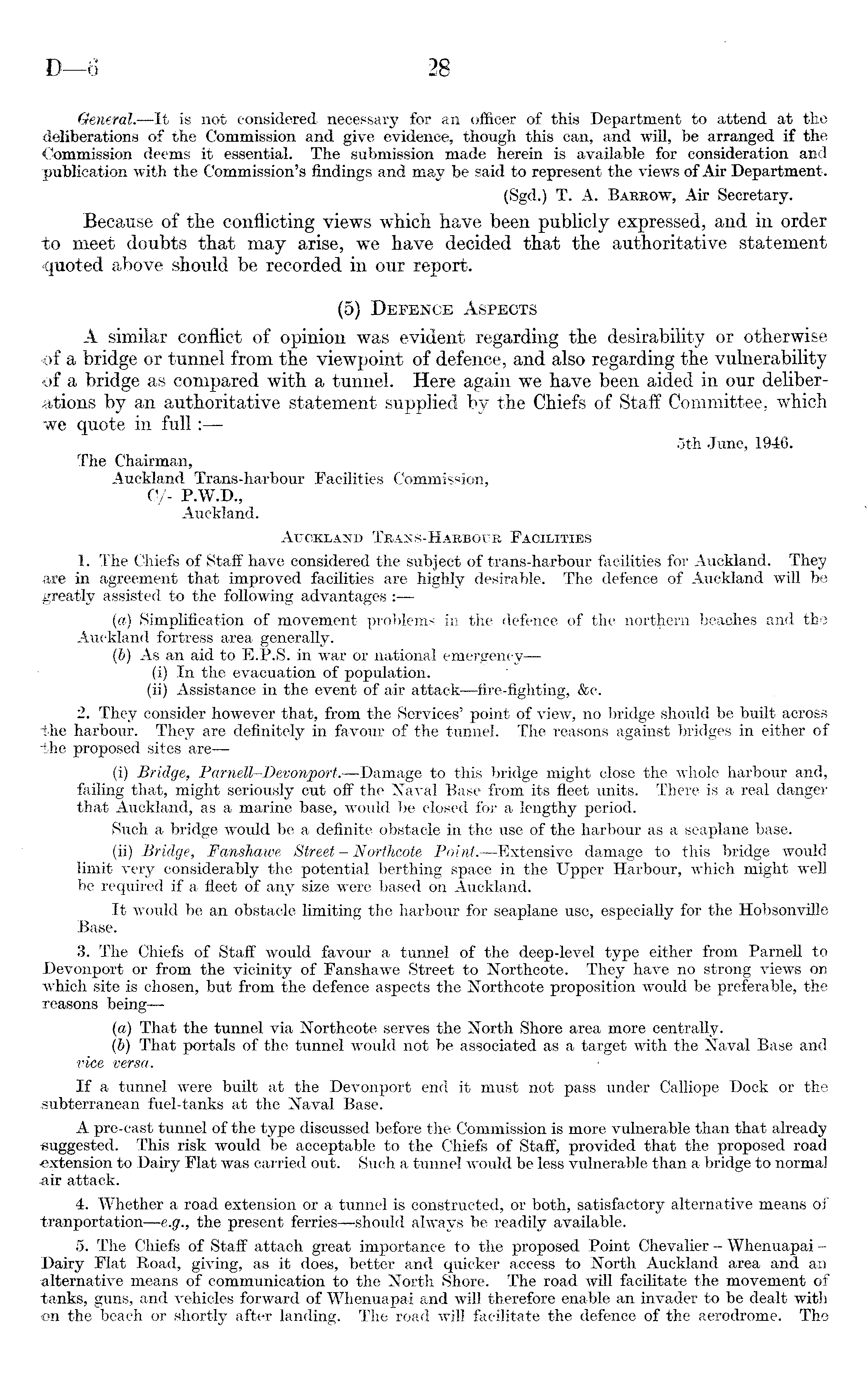 General. —lt is not considered necessary for an officer of this Department to attend at the deliberations of the Commission and give evidence, though this can, and will, be arranged if the Commission deems it essential. The submission made herein is available for consideration and publication with the Commission's findings and may be said to represent the views of Air Department. (Sgd.) T. A. Barrow, Air Secretary. Because of the conflicting views which have been publicly expressed, and in order to meet doubts that may arise, we have decided that the authoritative statement quoted above should be recorded in our report. (5) Defence Aspects A similar conflict of opinion was evident regarding the desirability or otherwise of a bridge or tunnel from the viewpoint of defence, and also regarding the vulnerability of a bridge as compared with a tunnel. Here again we have been aided in our deliberations by an authoritative statement supplied by the Chiefs of Staff Committee, which we quote in full:— sth June, 1946. The Chairman, Auckland Trans-harbour Facilities Commission, C/- P.W.D., Auckland. Auckland Trans-Harbour Facilities 1. The Chiefs of Staff have considered the subject of trans-harbour facilities for Auckland. They are in agreement that improved facilities are highly desirable. The defence of Auckland will be greatly assisted to the following advantages : (a) Simplification of movement problems in the defence of the northern beaches and the Auckland fortress area generally. (b) As an aid to E.P.S. in war or national emergency—(i) In the evacuation of population, (ii) Assistance in the event of air attack —fire-fighting, &c. 2. They consider however that, from the Services' point of view, no bridge should be built across the harbour. They are definitely in favour of the tunnel. The reasons against bridges in either of the proposed sites are—(i) Bridge, Pamell-Devonport. —Damage to this bridge might close the whole harbour and, failing that, might seriously cut off the Naval Base from its fleet units. There is a real danger that Auckland, as a marine base, would be closed for a lengthy period. Such a bridge would be a definite obstacle in the use of the harbour as a seaplane base. (ii) Bridge, Fanshawe Street - Northcote Point. —Extensive damage to this bridge would limit very considerably the potential berthing space in the Upper Harbour, which might well be required if a fleet of any size were based on Auckland. It would be an obstacle limiting the harbour for seaplane use, especially for the Hobsonville Base. 3. The Chiefs of Staff would favour a tunnel of the deep-level type either from Parnell to Devonport or from the vicinity of Fanshawe Street to Northcote. They have no strong views on which site is chosen, but from the defence aspects the Northcote proposition would be preferable, the reasons being—(a) That the tunnel via Northcote serves the North Shore area more centrally. (b) That portals of the tunnel would not be associated as a target with the Naval Base and vice versa. If a tunnel were built at the Devonport end it must not pass under Calliope Dock or the subterranean fuel-tanks at the Naval Base. A pre-cast tunnel of the type discussed before the Commission is more vulnerable than that already suggested. This risk would be acceptable to the Chiefs of Staff, provided that the proposed road ■extension to Dairy Flat was carried out. Such a tunnel would be less vulnerable than a bridge to normal air attack. 4. Whether a road extension or a tunnel is constructed, or both, satisfactory alternative means of tranportation— e.g., the present ferries —should always be readily available. 5. The Chiefs of Staff attach great importance to the proposed Point Chevalier - Whenuapai - Dairy Flat Road, giving, as it does, better and quicker access to North Auckland area and an alternative means of communication to the North Shore. The road will facilitate the movement of tanks, guns, and vehicles forward of Whenuapai and will therefore enable an invader to be dealt with on the beach or shortly after landing. The road will facilitate the defence of the aerodrome. The