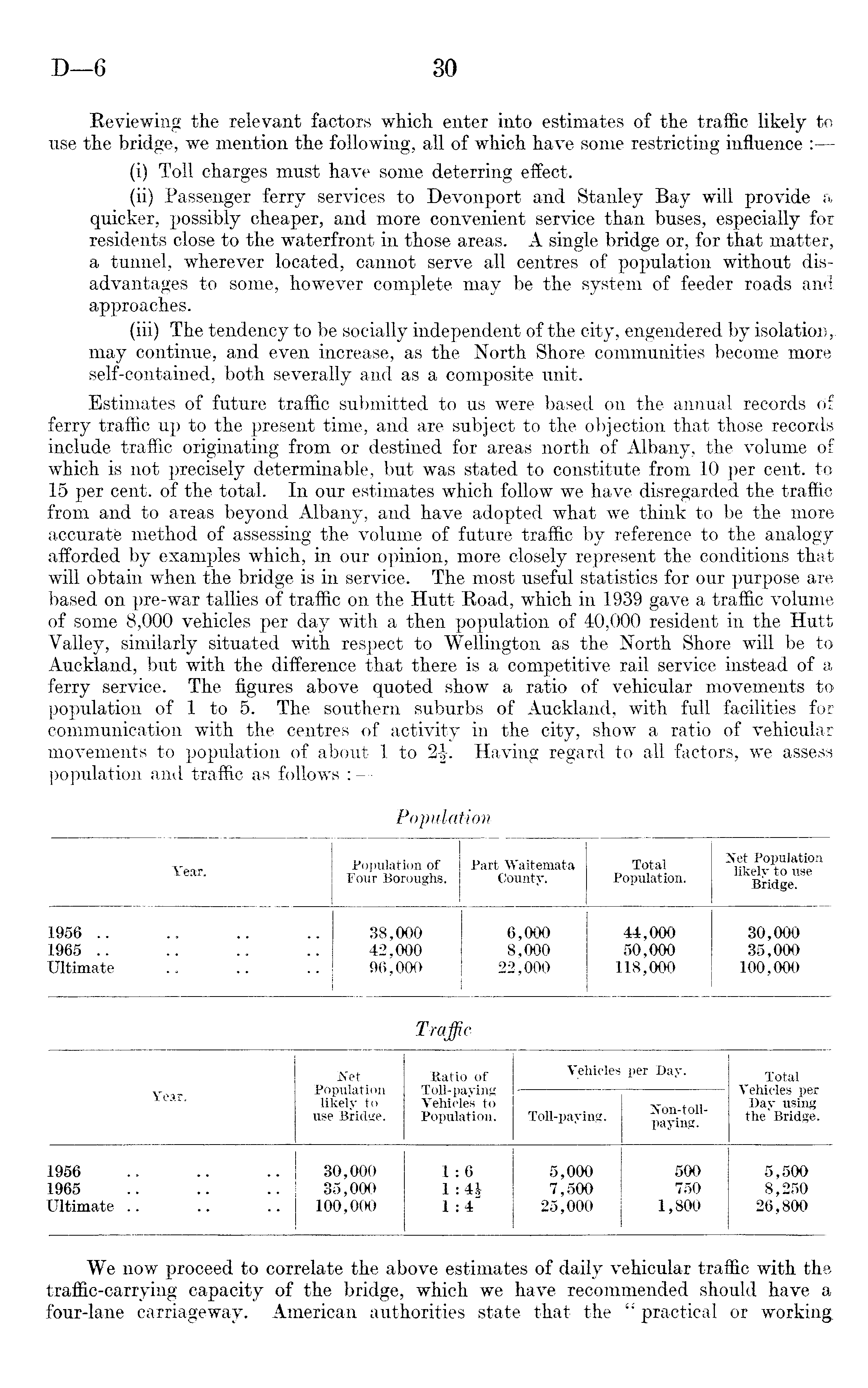 Reviewing the relevant factors which enter into estimates of the traffic likely to use the bridge, we mention the following, all of which have some restricting influence : (i) Toll charges must have some deterring effect. (ii) Passenger ferry services to Devonport and Stanley Bay will provide a quicker, possibly cheaper, and more convenient service than buses, especially for residents close to the waterfront in those areas. A single bridge or, for that matter, a tunnel, wherever located, cannot serve all centres of population without disadvantages to some, however complete may be the system of feeder roads and approaches. (iii) The tendency to be socially independent of the city, engendered by isolation,, may continue, and even increase, as the North Shore communities become more self-contained, both severally and as a composite unit. Estimates of future traffic submitted to us were based on the annual records of ferry traffic up to the present time, and are subject to the objection that those records include traffic originating from or destined for areas north of Albany, the volume of which is not precisely determinable, but was stated to constitute from 10 per cent, to 15 per cent, of the total. In our estimates which follow we have disregarded the traffic from and to areas beyond Albany, and have adopted what we think to be the more accurate method of assessing the volume of future traffic by reference to the analogy afforded by examples which, in our opinion, more closely represent the conditions that will obtain when the bridge is in service. The most useful statistics for our purpose are based on pre-war tallies of traffic on the Hutt Road, which in 1939 gave a traffic volume of some 8,000 vehicles per day with a then population of 40,000 resident in the Hutt Valley, similarly situated with respect to Wellington as the North Shore will be to Auckland, but with the difference that there is a competitive rail service instead of a ferry service. The figures above quoted show a ratio of vehicular movements to population of 1 to 5. The southern suburbs of Auckland, with full facilities for communication with the centres of activity in the city, show a ratio of vehicular movements to population of about 1 to Having regard to all factors, we assess population and traffic as follows :