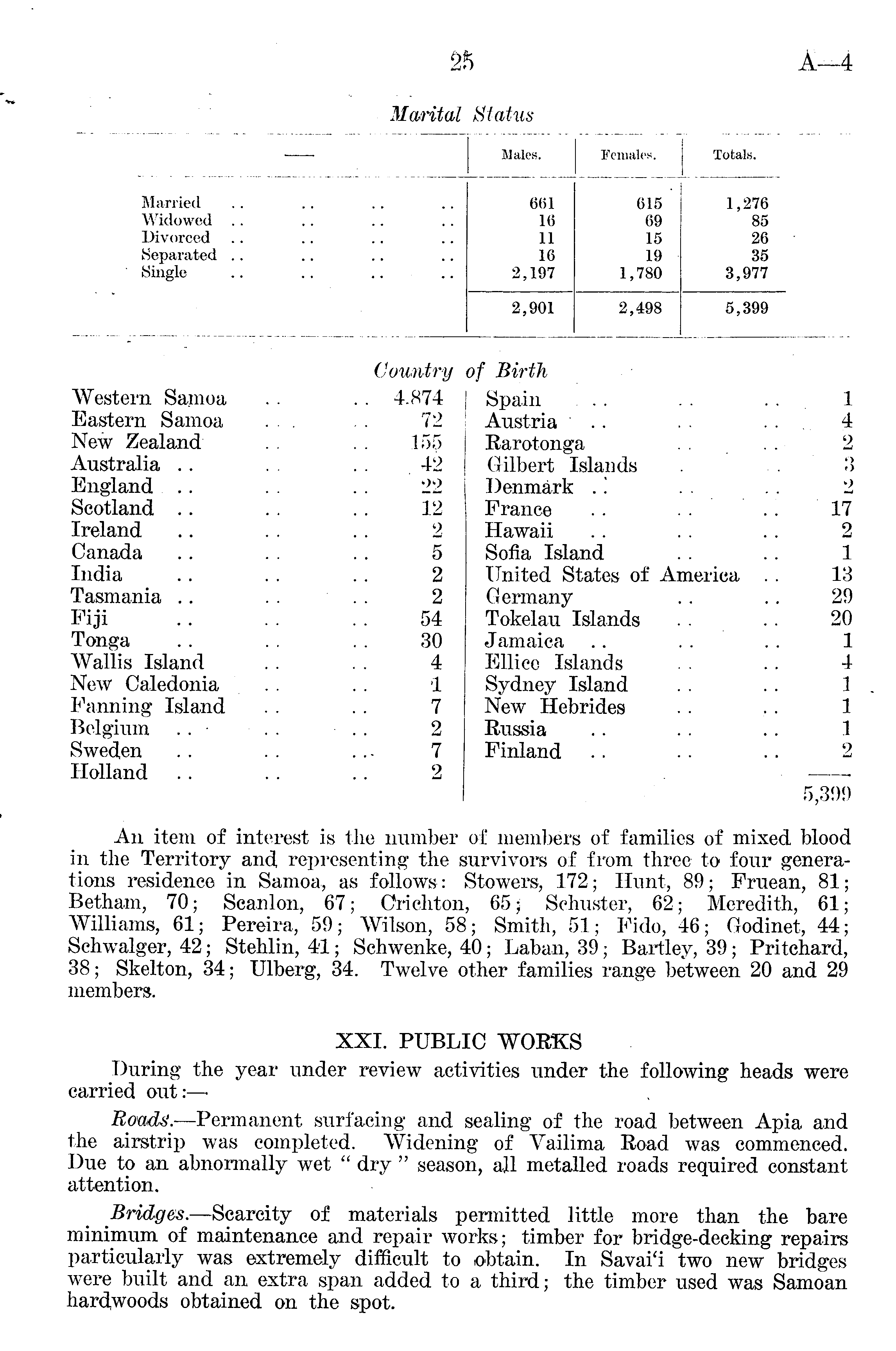 Country of Birth Western Samoa . . . . 4.874 | Spain . . . . . . 1 Eastern Samoa ... . . 72 Austria . . . . . . 4 New Zealand .. .. 155 Karotonga .. 2 Australia . . ... . . 42 Gilbert Islands .. .". 3 England . . . . . . 22 Denmark .'. . . . . 2 Scotland . . . . . . 12 France . . . . .". 17 Ireland .. . . . . 2 Hawaii . . . . . . 2 Canada . . • . . ■ . . 5 Sofia Island . . . . 1 India . . . . . . 2 United States of America . . 13 Tasmania . . . . . . 2 Germany . . . . 29 Fiji . . . . . . 54 Tokelau Islands . . . . 20 Tonga . . . . . . 30 Jamaica . . . . . . 1 Wallis Island . . . . 4 Ellice Islands . . . . 4 New Caledonia . . . . i Sydney Island . . . . 1 Fanning Island . . . . 7 New Hebrides .. . . 1 Belgium . . . . . . 2 Russia . . . . . . 1 Sweden . . . . ... 7 Finland . . . . . . 2 Holland .. .. .. ■ 2 5,31)9 An item of interest is the number of members of families of mixed blood in the Territory and representing the survivors of from three to four generations residence in Samoa, as follows: Stowers, 172; Hunt, 89; Fruean, 81; Betham, 70; Seanlon, 67; Orichton, 65; Schuster, 62; Meredith, 61; Williams, 61; Pereira, 59; Wilson, 58; Smith, 51; Fido, 46; Godinet, 44; Schwalger, 42; Stehlin, 41; Schwenke, 40; Laban, 39; Bartlev, 39 ; Pritchard, 38; Skelton, 34; Ulberg, 34. Twelve other families range between 20 and 29 members. XXI. PUBLIC WOBKS During the year under review activities under the following heads were carried out:— Rouds'. —Permanent surfacing and sealing of the road between Apia and the airstrip was completed. Widening of Vailima Eoad was commenced. Due to an abnormally wet " dry " season, all metalled roads required constant attention. Bridges. —Scarcity of materials permitted little more than the bare minimum of maintenance and repair works; timber for bridge-decking repairs particularly was extremely difficult to obtain. In Savai'i two new bridges were built and an extra span added to a third; the timber used was Samoan hardwoods obtained on the spot.
