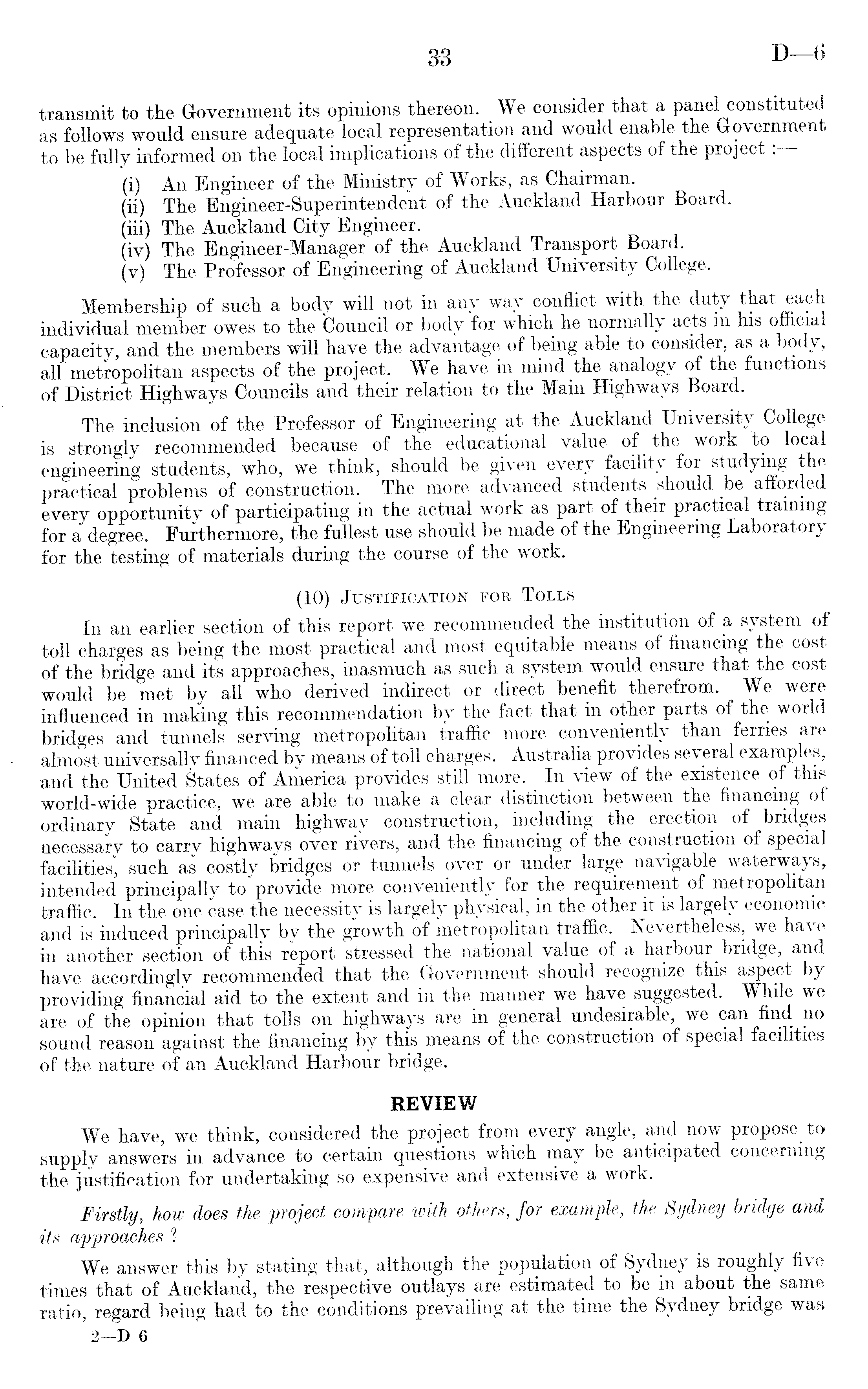 transmit to the Government its opinions thereon. We consider that a panel constituted as follows would ensure adequate local representation and would enable the Government to be fully informed on the local implications of the different aspects of the project : (i) An Engineer of the Ministry of Works, as Chairman. (ii) The Engineer-Superintendent of the Auckland Harbour Board. (iii) The Auckland City Engineer. (iv) The Engineer-Manager of the Auckland Transport Board. (v) The Professor of Engineering of Auckland University College. Membership of such a body will not in any way conflict with the duty that each individual member owes to the Council or bodv for which he normally acts m his official capacity, and the members will have the advantage of being able to consider, as a body, all metropolitan aspects of the project. We have in mind the analogy of the functions of District Highways Councils and their relation to the Main Highways Board. The inclusion of the Professor of Engineering at the Auckland University College is strongly recommended because of the educational value of the work to local engineering students, who, we think, should be given every facility for studying the practical problems of construction. The more advanced students should be afforded every opportunity of participating in the actual work as part of their practical training for a degree. Furthermore, the fullest use should be made of the Engineering Laboratory for the testing of materials during the course of the work. (10) Justification for Tolls In an earlier section of this report we recommended the institution of a system of toll charges as being the most practical and most equitable means of financing the cost of the bridge and its approaches, inasmuch as such a system would ensure that the cost would be met by all who derived indirect or direct benefit therefrom. We were influenced in making this recommendation by the fact that in other parts of the world bridges and tunnels serving metropolitan traffic more conveniently than ferries are almost universally financed by means of toll charges. Australia provides several examples., and the United States of America provides still more, In view of the existence of this world-wide practice, we are able to make a clear distinction between the financing of ordinary State and main highway construction, including the erection of bridges necessary to carry highways over rivers, and the financing of the construction of special facilities", such as costly bridges or tunnels over or under large navigable waterways, intended principally to provide more conveniently for the requirement of metropolitan traffic, In the one case the necessity is largely physical, in the other it is largely economic and is induced principally by the growth of metropolitan traffic. Nevertheless, we have in another section of this report stressed the national value of a harbour bridge, and have accordingly recommended that the Government should recognize this aspect by providing financial aid to the extent and in the manner we have suggested. While we are of the opinion that tolls on highways are in general undesirable, we can find no sound reason against the financing by this means of the construction of special facilities of the nature of an Auckland Harbour bridge. REVIEW We have, we think, considered the project from every angle, and now propose to supply answers in advance to certain questions which may be anticipated concerning the justification for undertaking so expensive and extensive a work. Firstly, how does the project compare with others, for example, the Sydney bridge and its approaches ? We answer this by stating that, although the population of Sydney is roughly five times that of Auckland, the respective outlays are estimated to be in about the same ratio, regard being had to the conditions prevailing at the time the Sydney bridge was 2-D 6
