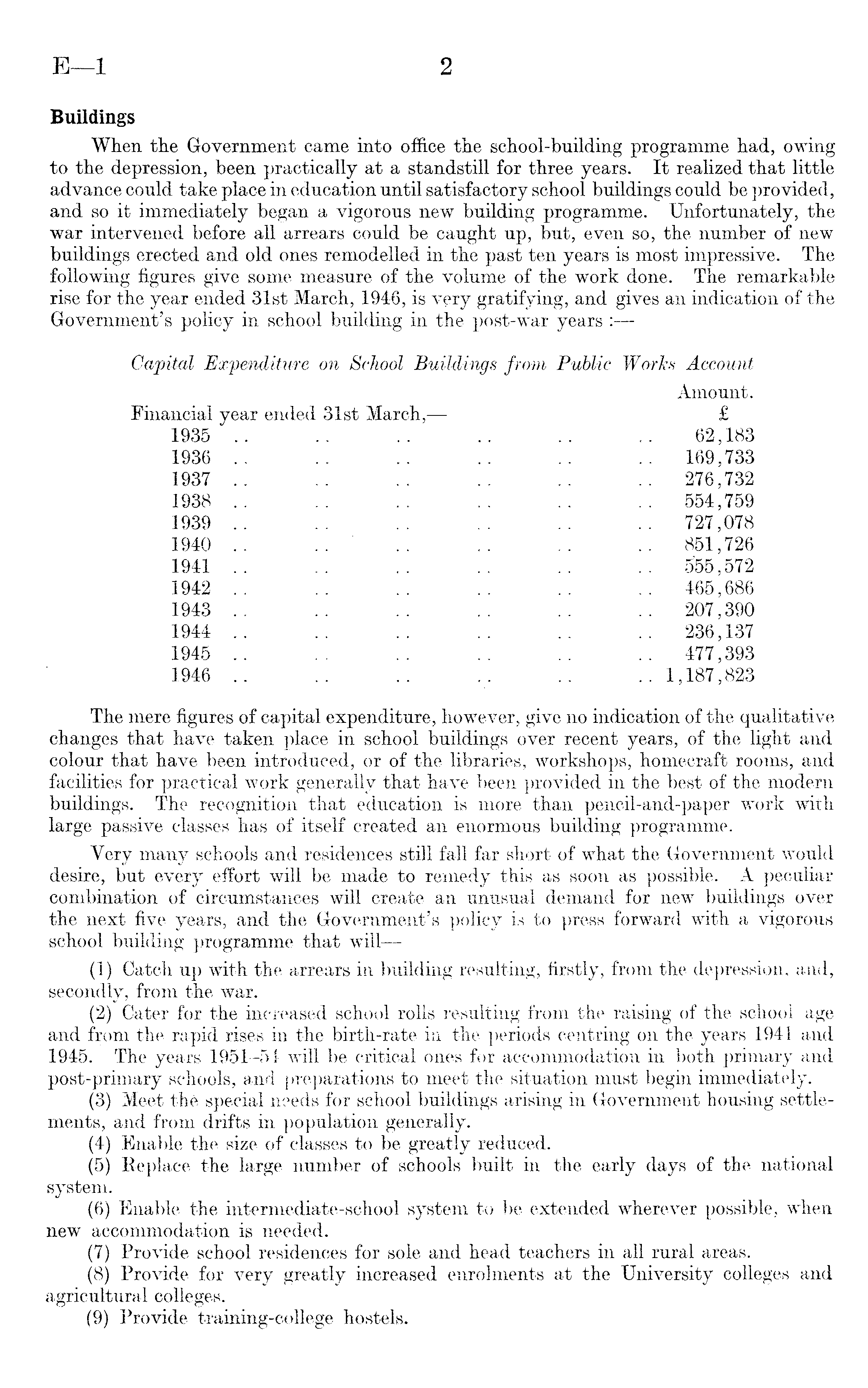 Buildings When the Government came into office the school-building programme had, owing to the depression, been practically at a standstill for three years. It realized that little advance could take place in education until satisfactory school buildings could be provided, and so it immediately began a vigorous new building programme. Unfortunately, the war intervened before all arrears could be caught up, but, even so, the number of new buildings erected and old ones remodelled in the past ten years is most impressive. The following figures give some measure of the volume of the work done. The remarkable rise for the year ended 31st March, 1946, is very gratifying, and gives an indication of the Government's policy in school building in the post-war years : Capital Expenditure on School Buildings from Public Works Account Amount. Financial year ended 31st March, — £ 1935 .. .. .. .. .. .. 62,183 1936 .. .. .. .. .. .. 169,733 1937 .. .. .. .. .. .. 276,732 1938 .. . . . . . . .. . . 554,759 1939 .. .. .. .. .. .. 727,078 1940 .. .. ' .. .. .. .. 851,726 1941 .. .. .. .. .. .. 555,572 1942 .. .. .. .. .. .. 465,686 1943 .. .. .. .. .. .. 207,390 1944 .. .. .. .. .. .. 236,137 1945 .. .. .. .. .. .. 477,393 1946 .. .. .. .. .. .. 1,187,823 The mere figures of capital expenditure, however, give no indication of the qualitative changes that have taken place in school buildings over recent years, of the light and colour that have been introduced, or of the libraries, workshops, homecraft rooms, and facilities for practical work generally that have been provided in the best of the modern buildings. The recognition that education is more than pencil-and-paper work with large passive classes has of itself created an enormous building programme. Very many schools and residences still fall far short of what the Government would desire, but every effort will be made to remedy this as soon as possible. A peculiar combination of circumstances will create an unusual demand for new buildings over the next five years, and the Government's policy is to press forward with a vigorous school building programme that will—(1) Catch up with the arrears in building resulting, firstly, from the depression, and, secondly, from the war. (2) Cater for the increased school rolls resulting from the raising of the school age and from the rapid rises in the birth-rate in the periods centring on the years 1941 and 1945. The years 1951-54 will be critical ones for accommodation in both primary and post-primary schools, and preparations to meet the situation must begin immediately. (3) Meet the special needs for school buildings arising in Government housing settlements, and from drifts in population generally. (4) Enable the size of classes to be greatly reduced. (5) Replace the large number of schools built in the early days of the national system. (6) Enable the intermediate-school system to be extended wherever possible, when new accommodation is needed. (7) Provide school residences for sole and head teachers in all rural areas. (8) Provide for very greatly increased enrolments at the University colleges and agricultural colleges. (9) Provide training-college hostels.