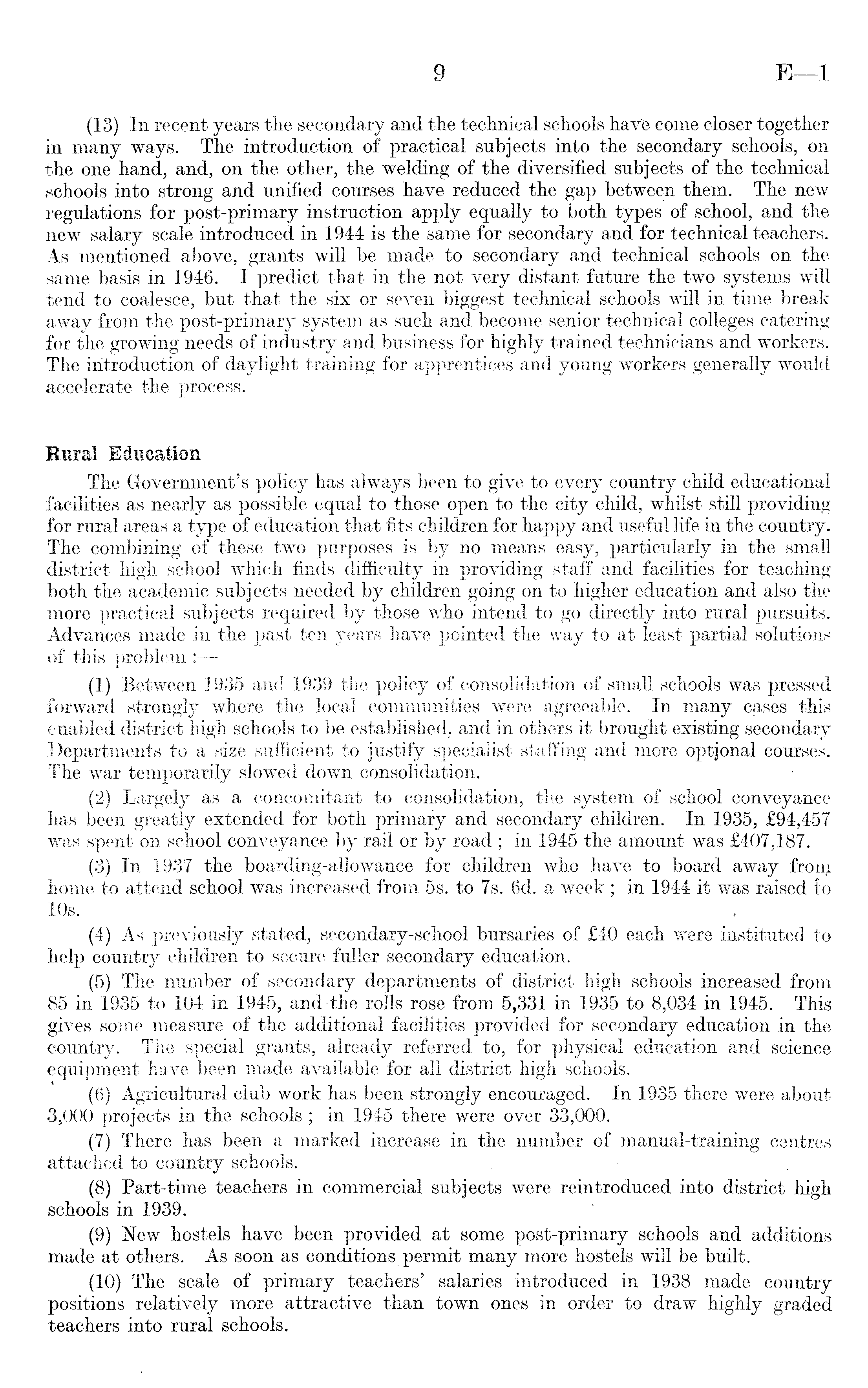 (13) In recent years the secondary and the technical schools have come closer together in many ways. The introduction of practical subjects into the secondary schools, on the one hand, and, on the other, the welding of the diversified subjects of the technical schools into strong and unified courses have reduced the gap between them. The new regulations for post-primary instruction apply equally to both types of school, and the new salary scale introduced in 1944 is the same for secondary and for technical teachers. As mentioned above, grants will be made to secondary and technical schools on the same basis in 1946. I predict that in the not very distant future the two systems will tend to coalesce, but that the six or seven biggest technical schools will in time break away from the post-primary system as such and become senior technical colleges catering for the growing needs of industry and business for highly trained technicians and workers. The introduction of daylight training for apprentices and young workers generally would accelerate the process. Rural Education The Government's policy has always been to give to every country child educational facilities as nearly as possible equal to those open to the city child, whilst still providing for rural areas a type of education that fits children for happy and useful life in the country. The combining of these two purposes is by no means easy, particularly in the small district high school which finds difficulty in providing staff and facilities for teaching both the academic subjects needed by children going on to higher education and also the more practical subjects required by those who intend to go directly into rural pursuits. Advances made in the past ten years have pointed the way to at least partial solutions of this problem : (1) Between 1935 and 1939 the policy of consolidation of small schools was pressed forward strongly where the local communities were agreeable. In many cases this enabled district high schools to be established, and in others it brought existing secondary Departments to a size sufficient to justify specialist staffing and more optjonal courses. The war temporarily slowed down consolidation. (2) Largely as a concomitant to consolidation, the system of school conveyance has been greatly extended for both primary and secondary children. In 1935, £94,457 was spent on school conveyance by rail or by road ; in 1945 the amount was £407,187. (3) In 1937 the boarding-allowance for children who have to board away from home to attend school was increased from ss. to 7s. 6d. a week ; in 1944 it was raised to 10s. (4) As previously stated, secondary-school bursaries of £4O each were instituted to help country children to secure fuller secondary education. (5) The number of secondary departments of district high schools increased from 85 in 1935 to 104 in 1945, and the rolls rose from 5,331 in 1935 to 8,034 in 1945. This gives some measure of the additional facilities provided for secondary education in the country. The special grants, already referred to, for physical education and science equipment have been made available for all district high schools. (6) Agricultural club work has been strongly encouraged. In 1935 there were about 3,000 projects in the schools ; in 1945 there were over 33,000. (7) There has been a marked increase in the number of manual-training centres attached to country schools. (8) Part-time teachers in commercial subjects were reintroduced into district high schools in 1939. (9) New hostels have been provided at some post-primary schools and additions made at others. As soon as conditions permit many more hostels will be built. (10) The scale of primary teachers' salaries introduced in 1938 made country positions relatively more attractive than town ones in order to draw highly graded teachers into rural schools.
