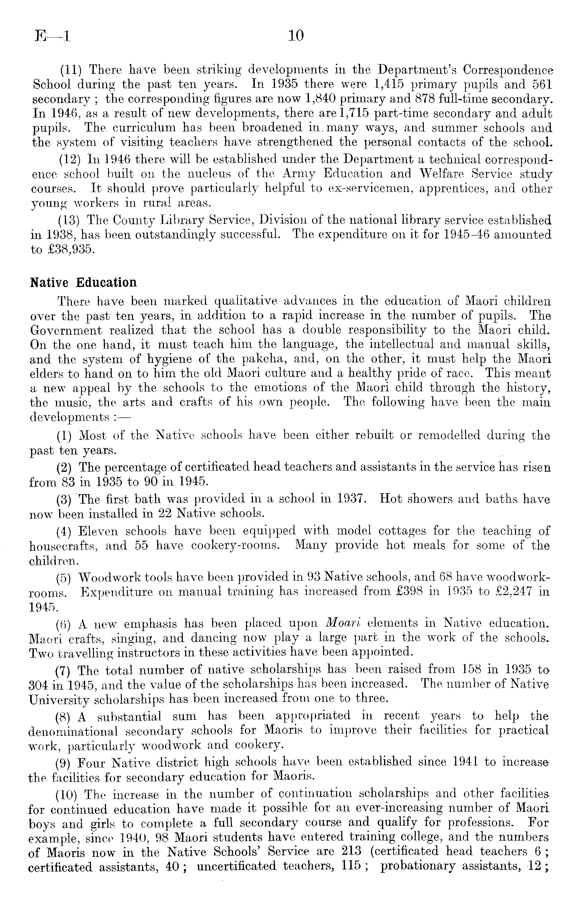 (11) There have been striking developments in the Department's Correspondence School during the past ten years. In 1935 there were 1,415 primary pupils and 561 secondary ; the corresponding figures are now 1,840 primary and 878 full-time secondary. In 1946, as a result of new developments, there are 1,715 part-time secondary and adult pupils. The curriculum has been broadened in.many ways, and summer schools and the system of visiting teachers have strengthened the personal contacts of the school. (12) In 1946 there will be established under the Department a technical correspondence school built on the nucleus of the Army Education and Welfare Service study courses. It should prove particularly helpful to ex-servicemen, apprentices, and other young workers in rural areas. (13) The County Library Service, Division of the national library service established in 1938, has been outstandingly successful. The expenditure on it for 1945-46 amounted to £38,935. Native Education There have been marked qualitative advances in the education of Maori children over the past ten years, in addition to a rapid increase in the number of pupils. The Government realized that the school has a double responsibility to the Maori child. On the one hand, it must teach him the language, the intellectual and manual skills, and the system of hygiene of the pakeha, and, on the other, it must help the Maori elders to hand on to him the old Maori culture and a healthy pride of race. This meant a new appeal by the schools to the emotions of the Maori child through the history, the music, the arts and crafts of his own people. The following have been the main developments : (1) Most of the Native schools have been either rebuilt or remodelled during the past ten years. (2) The percentage of certificated head teachers and assistants in the service has risen from 83 in 1935 to 90 in 1945. (3) The first bath was provided in a school in 1937. Hot showers and baths have now been installed in 22 Native schools. (4) Eleven schools have been equipped with model cottages for the teaching of housecrafts, and 55 have cookery-rooms. Many provide hot meals for some of the children. (5) Woodwork tools have been provided in 93 Native schools, and 68 have woodworkrooms. Expenditure on manual training has increased from £398 in 1935 to £2,247 in 1945. (6) A new emphasis has been placed upon Moari elements in Native education. Maori crafts, singing, and dancing now play a large part in the work of the schools. Two travelling instructors in these activities have been appointed. (7) The total number of native scholarships has been raised from 158 in 1935 to 304 in 1945, and the value of the scholarships has been increased. The number of Native University scholarships has been increased from one to three. (8) A substantial sum has been appropriated in recent years to help the denominational secondary schools for Maoris to improve their facilities for practical work, particularly woodwork and cookery. (9) Four Native district high schools have been established since 1941 to increase the facilities for secondary education for Maoris. (10) The increase in the number of continuation scholarships and other facilities. for continued education have made it possible for an ever-increasing number of Maori boys and girls to complete a full secondary course and qualify for professions. For example, since 1940, 98 Maori students have entered training college, and the numbers of Maoris now in the Native Schools' Service are 213 (certificated head teachers 6 ; certificated assistants, 40 ; uncertificated teachers, 115 ; probationary assistants, 12 ;