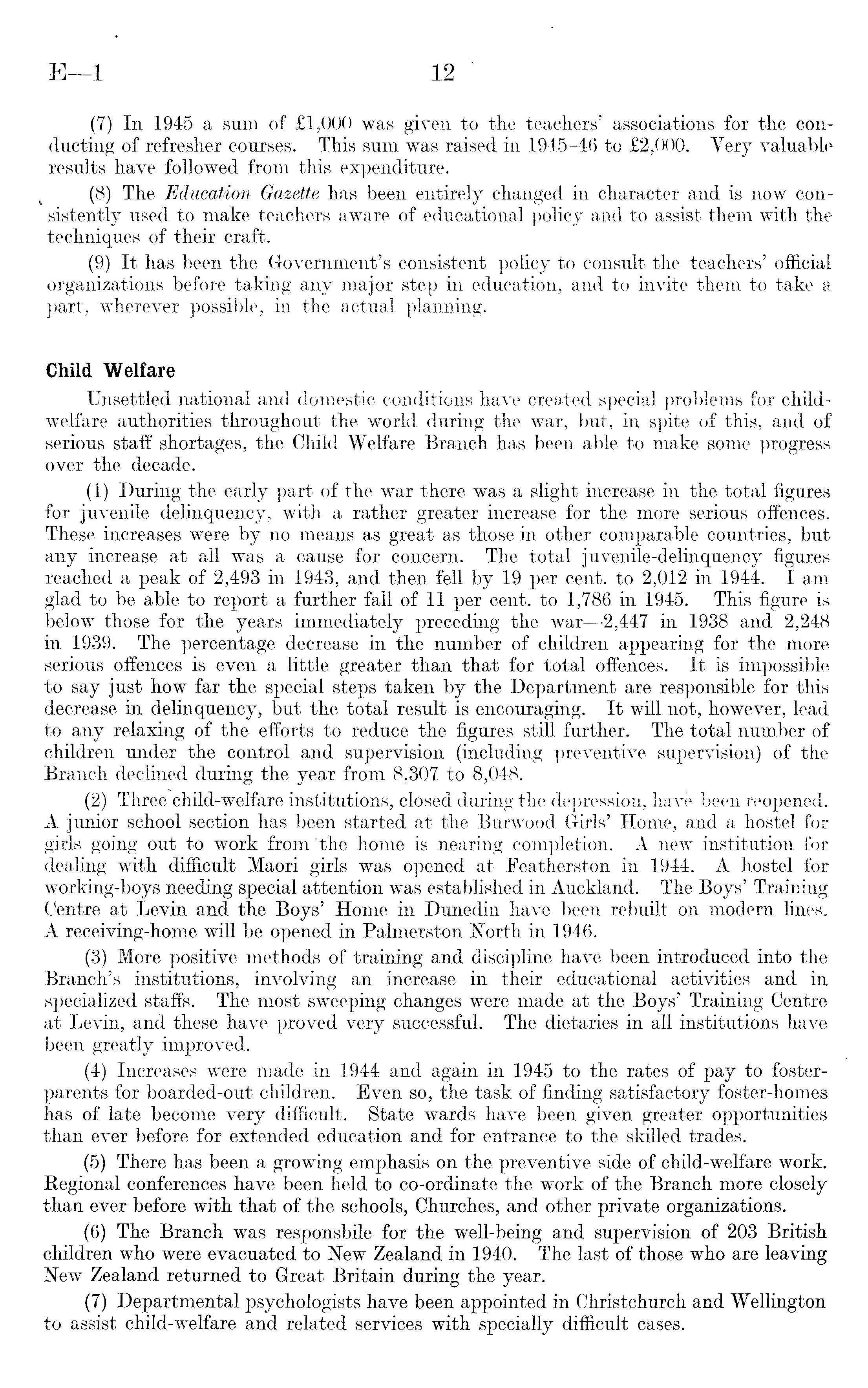 (7) In 1945 a sum of £l,OOO was given to the teachers' associations for the conducting of refresher courses. This sum was raised in 1945-46 to £2,000. Very valuable results have followed from this expenditure. (8) The Education Gazette has been entirely changed in character and is now consistently used to make teachers aware of educational policy and to assist them with the techniques of their craft. (9) It has been the Government's consistent policy to consult the teachers' official organizations before taking any major step in education, and to invite them to take a part, wherever possible, in the actual planning. Child Welfare Unsettled national and domestic conditions have created special problems for childwelfare authorities throughout the world during the war, but, in spite of this, and of serious staff shortages, the Child Welfare Branch has been able to make some progress over the decade. (1) During the early part of the war there was a slight increase in the total figures for juvenile delinquency, with a rather greater increase for the more serious offences. These increases were by no means as great as those in other comparable countries, but any increase at all was a cause for concern. The total juvenile-delinquency figures reached a peak of 2,493 in 1943, and then fell by 19 per cent, to 2,012 in 1944. lam glad to be able to report a further fall of 11 per cent, to 1,786 in 1945. This figure is below those for the years immediately preceding the war —2,447 in 1938 and 2,248 in 1939. The percentage decrease in the number of children appearing for the more serious offences is even a little greater than that for total offences. It is impossible to say just how far the special steps taken by the Department are responsible for this decrease in delinquency, but the total result is encouraging. It will not, however, lead to any relaxing of the efforts to reduce the figures still further. The total number of children under the control and supervision (including preventive supervision) of the Branch declined during the year from 8,307 to 8,048. (2) Three child-welfare institutions, closed during the depression, have been reopened. A junior school section has been started at the Burwood Girls' Home, and a hostel for girls going out to work from the home is nearing completion. A new institution for dealing with difficult Maori girls was opened at Featherston in 1944. A hostel for working-boys needing special attention was established in Auckland. The Boys' Training Centre at Levin and the Boys' Home in Dunedin have been rebuilt on modern lines. A receiving-home will be opened in Palmerston North in 1946. (3) More positive methods of training and discipline have been introduced into the Branch's institutions, involving an increase in their educational activities and in specialized staffs. The most sweeping changes were made at the Boys' Training Centre at Levin, and these have proved very successful. The dietaries in all institutions have been greatly improved. (4) Increases were made in 1944 and again in 1945 to the rates of pay to fosterparents for boarded-out children. Even so, the task of finding satisfactory foster-homes has of late become very difficult. State wards have been given greater opportunities than ever before for extended education and for entrance to the skilled trades. (5) There has been a growing emphasis on the preventive side of child-welfare work. Regional conferences have been held to co-ordinate the work of the Branch more closely than ever before with that of the schools, Churches, and other private organizations. (6) The Branch was responsbile for the well-being and supervision of 203 British children who were evacuated to New Zealand in 1940. The last of those who are leaving New Zealand returned to Great Britain during the year. (7) Departmental psychologists have been appointed in Christchurch and Wellington to assist child-welfare and related services with specially difficult cases.