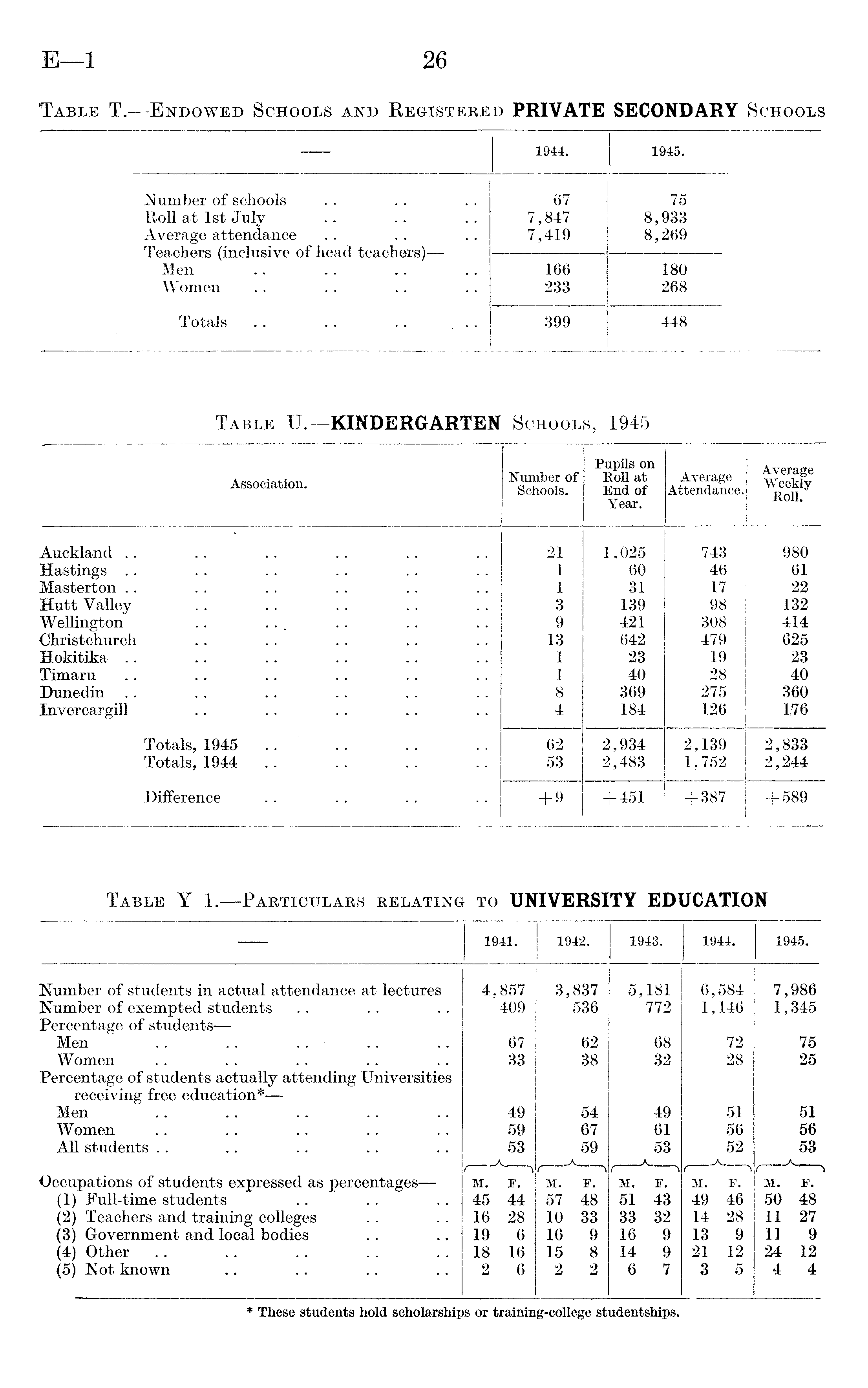 — 1941. 1942. 1943. 1944. 1945. Number of students in actual attendance at lectures 4.857 3,837 5,181 6,584 7,986 Number of exempted students 409 536 772 1,146 1,345 Percentage of students— Men .. ' .. 67 62 68 72 75 Women .. .. .. .. 33 38 32 28 25 Percentage of students actually attending Universities receiving free education* — Men 49 54 49 51 51 Women 59 67 61 56 56 All students 53 59 53 52 53 Occupations of students expressed as percentages — M. F. M. F. m. f. M. F. M. F. (1) Full-time students 45 44 57 48 51 43 49 46 50 48 (2) Teachers and training colleges 16 28 10 33 33 32 14 28 11 27 (3) Government and local bodies 19 6 16 9 16 9 13 9 11 9 (4) Other 18 16 15 8 14 9 21 12 24 12 (5) Not known 2 6 2 2 6 7 3 5 4 4 * These students hold scholarships or training-college studentships.
