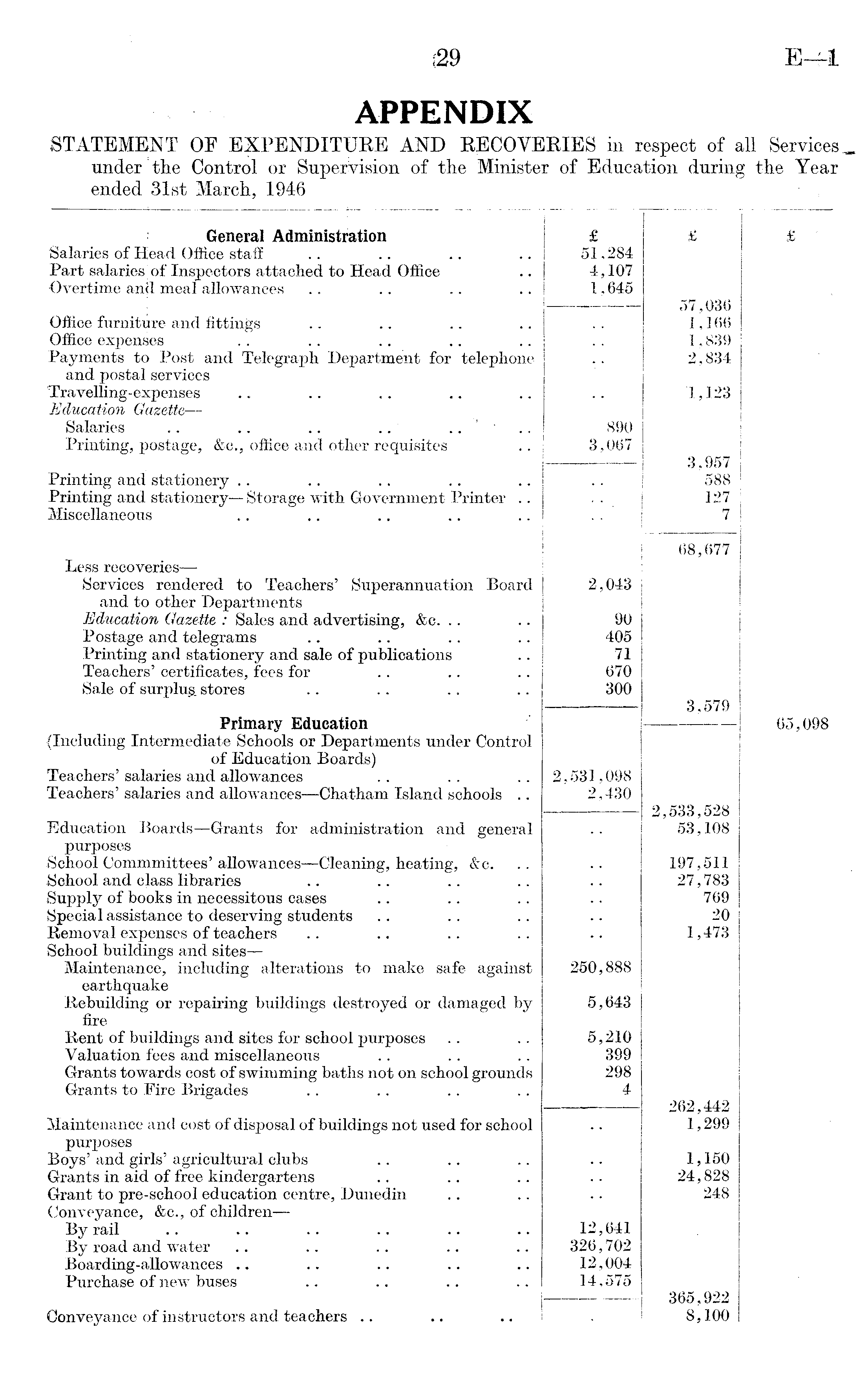APPENDIX STATEMENT OF EXPENDITURE AND RECOVERIES in respect of all Services under the Control or Supervision of the Minister of Education during the Year ended 31st March, 1946