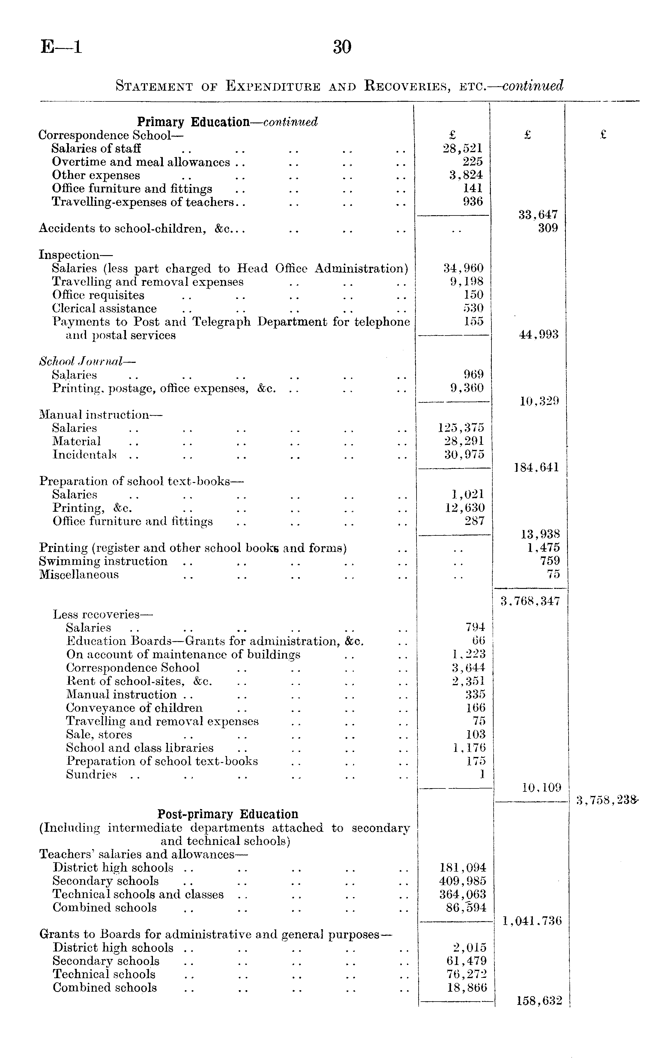 Primary Education —continued Correspondence School— Salaries of staff Overtime and meal allowances Other expenses Office furniture and fittings Travelling-expenses of teachers £ 28,521 225 3,824 141 936 £ 33,647 309 £ Accidents to school-children, &c. Inspection— Salaries (less part charged to Head Office Administration) Travelling and removal expenses Office requisites Clerical assistance Payments to Post and Telegraph Department for telephone and postal services 34,960 9,198 150 530 155 44,993 School Journal— Salaries Printing, postage, office expenses, &c. 969 9,360 10,329 184,641 13,938 1,475 759 75 Manual instruction— Salaries Material Incidentals 125,375 28,291 30,975 Preparation of school text-books— Salaries Printing, &c. .. .. .. .. Office furniture and fittings 1,021 12,630 ! 287 Printing (register and other school books and forms) Swimming instruction Miscellaneous Less recoveries— Salaries Education Boards —Grants for administration, &c. On account of maintenance of buildings Correspondence School Rent of school-sites, &c. Manual instruction Conveyance of children Travelling and removal expenses Sale, stores School and class libraries Preparation of school text-books Sundries 794 66 1,223 3,644 2,351 335 166 75 103 1,176 175 1 3,768,347 10,109 3,758,238-Post-primary Education (Including intermediate departments attached to secondary and technical schools) Teachers' salaries and allowances— District high schools Secondary schools Technical schools and classes Combined schools 181,094 409,985 364,063 86 ,"594 1,041,736 -1 158,632 Grants to Boards for administrative and general purposes — District high schools Secondary schools Technical schools Combined schools 2,015 61,479 76,272 18,866