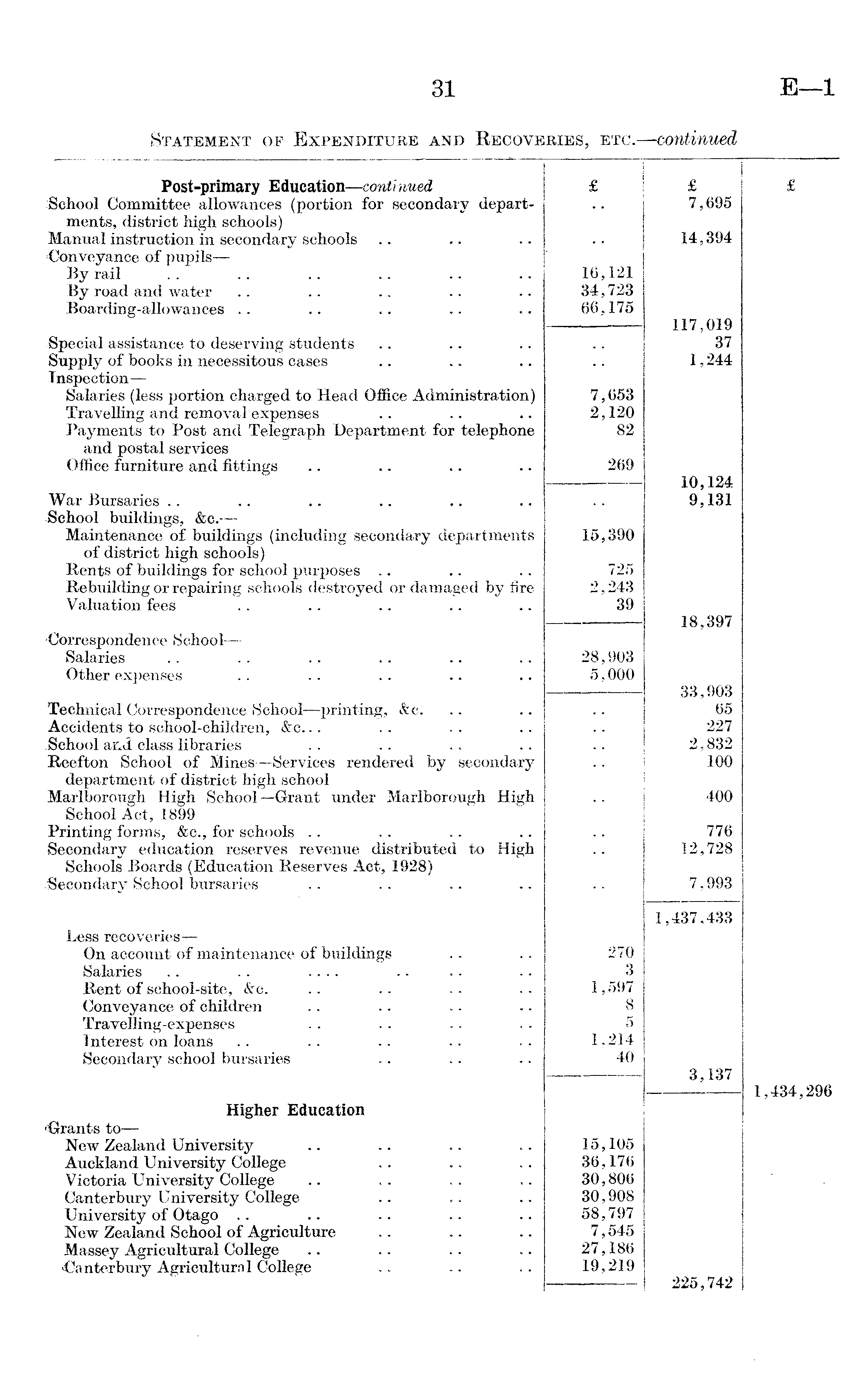 Post-primary Education —continued £ £ £ School Committee allowances (portion for secondary depart7,695 ments, district high schools) Manual instruction in secondary schools 14,394 •Conveyance of pupils— By rail 16,121 By road and water 34,723 Boarding-allowances 66,175 117,019 Special assistance to deserving students 37 Supply of books in necessitous cases 1,244 Inspection— Salaries (less portion charged to Head Office Administration) 7,653 Travelling and removal expenses 2,120 Payments to Post and Telegraph Department for telephone 82 and postal services Office furniture and fittings 269 10,124 War Bursaries 9,131 School buildings, &c. — Maintenance of buildings (including secondary departments 15,390 of district high schools) Rents of buildings for school purposes 725 Rebuilding or repairing schools destroyed or damaged by fire 2,243 Valuation fees 39 18,397 •Correspondence School — Salaries 28,903 Other expenses 5,000 33,903 Technical Correspondence School —printing, &c. 65 Accidents to school-children, &c. 227 JSchool ar*d class libraries 2,832 Reefton School of Mines —Services rendered by secondary 100 department of district high school Marlborough High School—Grant under Marlborough High 400 School Act, 1899 Printing forms, &c., for schools 776 Secondary education reserves revenue distributed to High 12,728 Schools Boards (Education Reserves Act, 1928) Secondary School bursaries 7,993 1,437,433 Less recoveries— On account of maintenance of buildings 270 Salaries .. .. .... 3 Rent of school-site, &c. 1,597 Conveyance of children 8 Travelling-expenses 5 Interest on loans 1,214 Secondary school bursaries 40 3,137 1,434,296 Higher Education •Grants to — New Zealand University 15,105 Auckland University College 36,176 Victoria University College 30,806 Canterbury University College 30,908 University of Otago 58,797 New Zealand School of Agriculture 7,545 Massey Agricultural College 27,186 •Canterbury Agricultural College 19,219 225,742