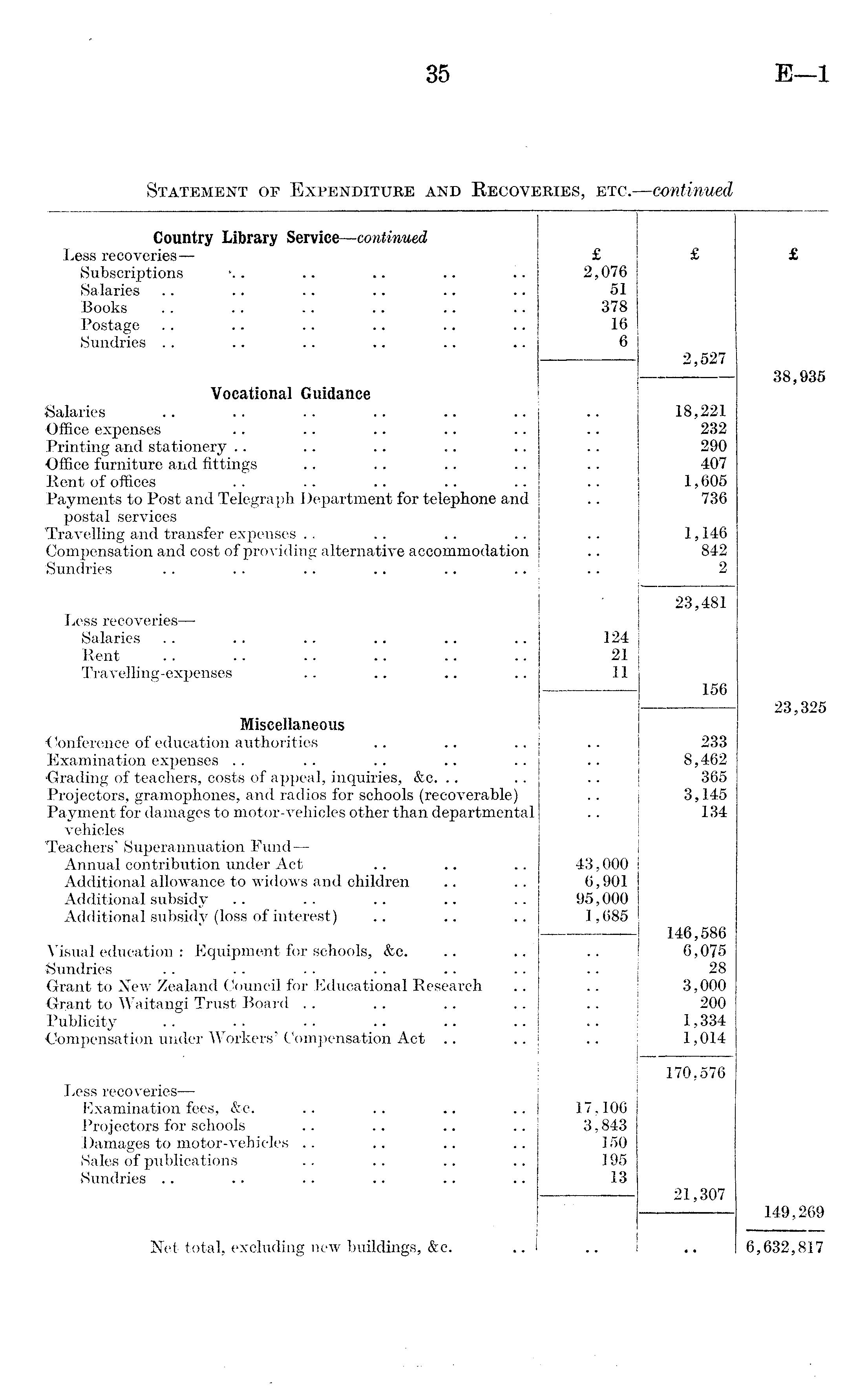 Country Library Service—continued Less recoveries— £ £ £ Subscriptions . .. ». .. !. 2,076 Salaries .. 51 Books Postage 378 16 Sundries 6 2,527 38,935 Vocational Guidance Salaries 18,221 Office expenses 232 Printing and stationery 290 Office furniture and fittings 407 Rent of offices 1,605 Payments to Post and Telegraph Department for telephone and 736 postal services Travelling and transfer expenses 1,146 Compensation and cost of providing alternative accommodation 842 Sundries 2 23,481 Less recoveries— Salaries 124 Rent 21 Travelling-expenses 11 156 23,325 Miscellaneous ■Conference of education authorities 233 Examination expenses 8,462 •Grading of teachers, costs of appeal, inquiries, &c. 365 Projectors, gramophones, and radios for schools (recoverable) 3,145 Payment for damages to motor-vehicles other than departmental 134 vehicles Teachers' Superannuation Fund— Annual contribution under Act 43,000 Additional allowance to widows and children 6,901 Additional subsidy 95,000 Additional subsidy (loss of interest) 1,685 146,586 Visual education : Equipment for schools, &c. 6,075 Sundries . . .. . . . . 28 Grant to New Zealand Council for Educational Research 3,000 Grant to Waitangi Trust Board 200 Publicity .. .. .. .. .. 1,334 Compensation under Workers' Compensation Act 1,014 170,576 Less recoveries— Examination fees, &c. 17,106 Projectors for schools 3,843 Damages to motor-vehicles 150 Sales of publications 195 Sundries 13 21,307 149,269 Net total, excluding new buildings, &c. 6,632,817