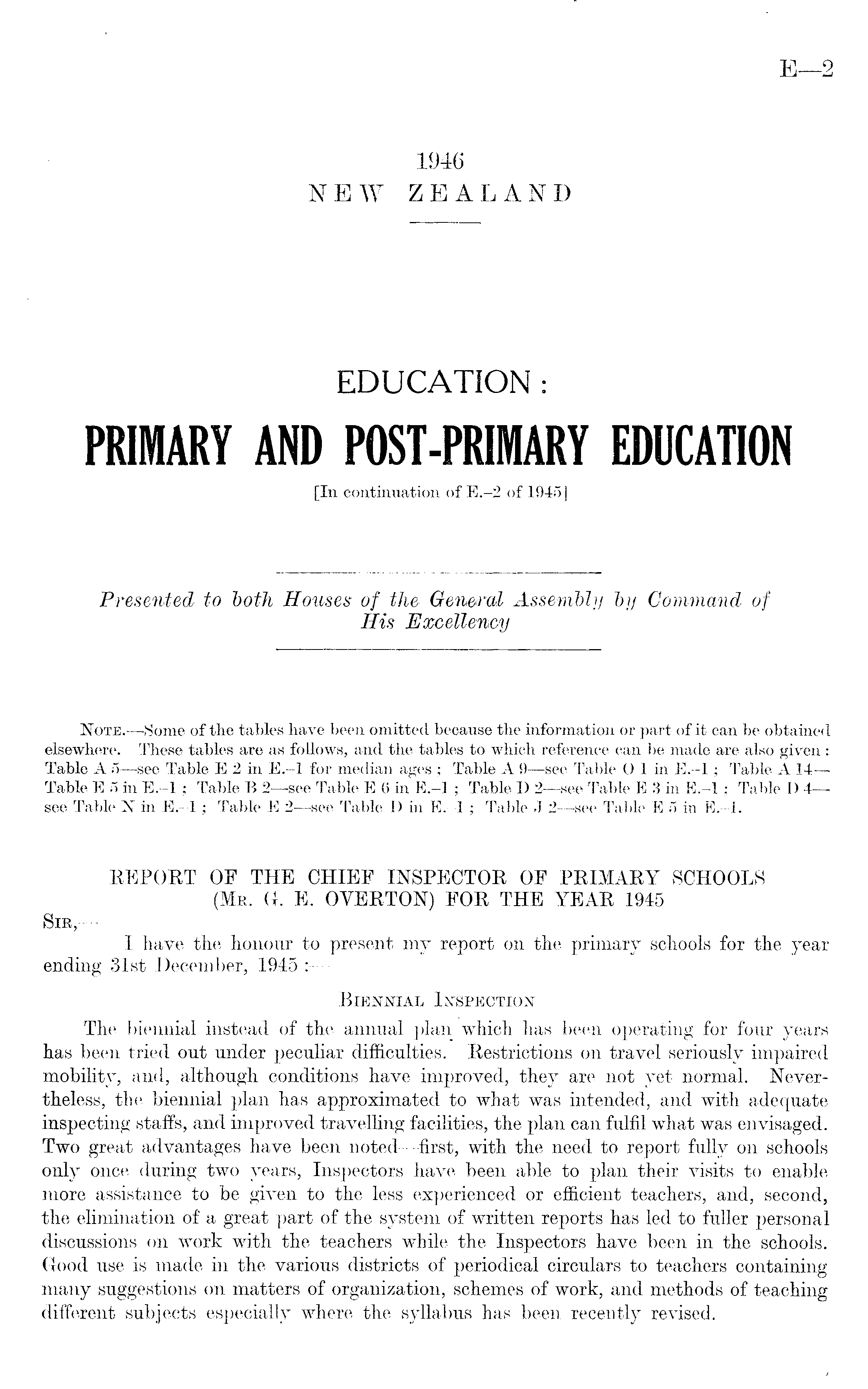 Note.—Some of the tables have been omitted because the information or part of it can be obtained elsewhere. These tables are as follows, and the tables to which reference can be made are also given: Table A s—see Table E 2 in E.-l for median ages ; Table A 9—see Table 0 1 in E.-l ; Table A 14— Table E sin E.-l ; Table B 2—see Table E 6 in E.-l ; Table D 2 —see Table E 3in E.-l ; Table D 4— see Table N in E.-l ; Table E 2—see Table D in E.-l ; Table J 2—see Table E 5 in E.-l. REPORT OF THE CHIEF INSPECTOR OF PRIMARY SCHOOLS (Me. G. E. OVERTON) FOR THE YEAR 1945 Sir, — I have the honour to present my report on the primary schools for the year ending 31st December, 1945 : Biennial Inspection The biennial instead of the annual plan which has been operating for four years has been tried out under peculiar difficulties. Restrictions on travel seriously impaired mobility, and, although conditions have improved, they are not yet normal. Nevertheless, the biennial plan has approximated to what was intended, and with adequate inspecting staffs, and improved travelling facilities, the plan can fulfil what was envisaged. Two great advantages have been noted—first, with the need to report fully on schools only once during two years, Inspectors have been able to plan their visits to enable more assistance to be given to the less experienced or efficient teachers, and, second, the elimination of a great part of the system of written reports has led to fuller personal discussions on work with the teachers while the Inspectors have been in the schools. Good use is made in the various districts of periodical circulars to teachers containing many suggestions on matters of organization, schemes of work, and methods of teaching different subjects especially where the syllabus has been recently revised.