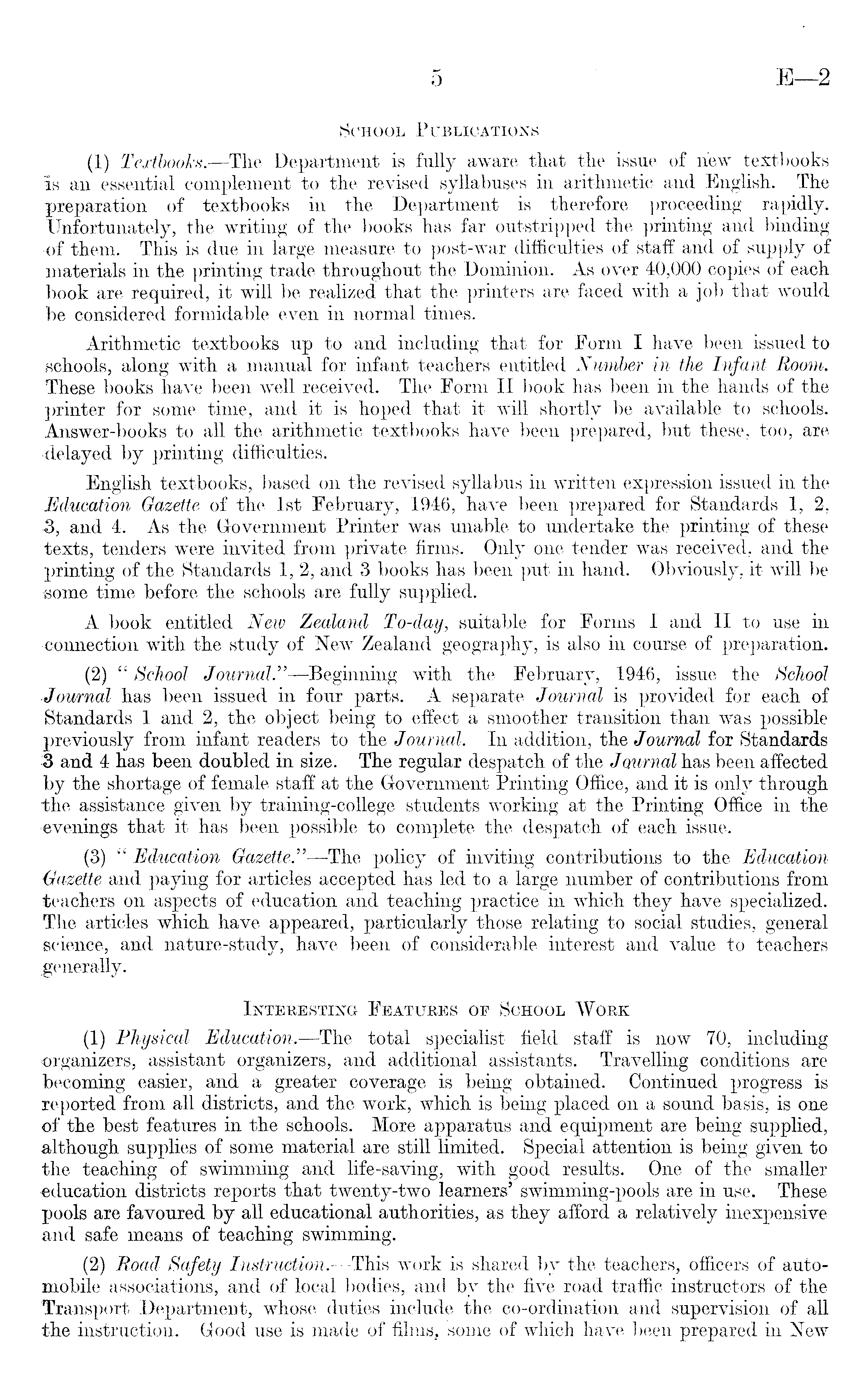 School Publications (1) Textbooks. —The Department is fully aware that the issue of hew textbooks Is an essential complement to the revised syllabuses in arithmetic and English. The preparation of textbooks in the Department is therefore proceeding rapidly. Unfortunately, the writing of the books has far outstripped the printing and binding •of them. This is due in large measure to post-war difficulties of staff and of supply of materials in the printing trade throughout the Dominion. As over 40,000 copies of each book are required, it will be realized that the printers are faced with a job that would be considered formidable even in normal times. Arithmetic textbooks up to and including that for Form I have been issued to .schools, along with a manual for infant teachers entitled Number in the Infant Room. These books have been well received. The Form II book has been in the hands of the printer for some time, and it is hoped that it will shortly be available to schools. Answer-books to all the arithmetic textbooks have been prepared, but these, too, are delayed by printing difficulties. English textbooks, based on the revised syllabus in written expression issued in the Education Gazette of the Ist February, 1946, have been prepared for Standards 1, 2, 3, and 4. As the Government Printer was unable to undertake the printing of these texts, tenders were invited from private firms. Only one tender was received, and the printing of the Standards 1, 2, and 3 books has been put in hand. Obviously, it will be •some time before the schools are fully supplied. A book entitled New Zealand To-day, suitable for Forms I and II to use in ■connection with the study of New Zealand geography, is also in course of preparation. (2) " School Journal." —Beginning with the February, 1946, issue the School ■Journal has been issued in four parts. A separate Journal is provided for each of Standards 1 and 2, the object being to effect a smoother transition than was possible previously from infant readers to the Journal. In addition, the Journal for Standards ■3 and 4 has been doubled in size. The regular despatch of the Journal has been affected by the shortage of female staff at the Government Printing Office, and it is only through the assistance given by training-college students working at the Printing Office in the -evenings that it has been possible to complete the despatch of each issue. (3) " Education Gazette—The policy of inviting contributions to the Education Gazette and paying for articles accepted has led to a large number of contributions from teachers on aspects of education and teaching practice in which they have specialized. The articles which have appeared, particularly those relating to social studies, general science, and nature-study, have been of considerable interest and value to teachers generally. Interesting Features of School Work (1) Physical Education. —The total specialist field staff is now 70, including organizers, assistant organizers, and additional assistants. Travelling conditions are becoming easier,, and a greater coverage is being obtained. Continued progress is reported from all districts, and the work, which is being placed on a sound basis, is one of the best features in the schools. More apparatus and equipment are being supplied, although supplies of some material are still limited. Special attention is being given to the teaching of swimming and life-saving, with good results. One of the smaller ■education districts reports that twenty-two learners' swimming-pools are in use. These pools are favoured by all educational authorities, as they afford a relatively inexpensive and safe means of teaching swimming. (2) Road Safety Instruction. —This work is shared by the teachers, officers of automobile associations, and of local bodies, and by the five road traffic instructors of the Transport Department, whose duties include the co-ordination and supervision of all the instruction. Good use is made of films., some of which have been prepared in New