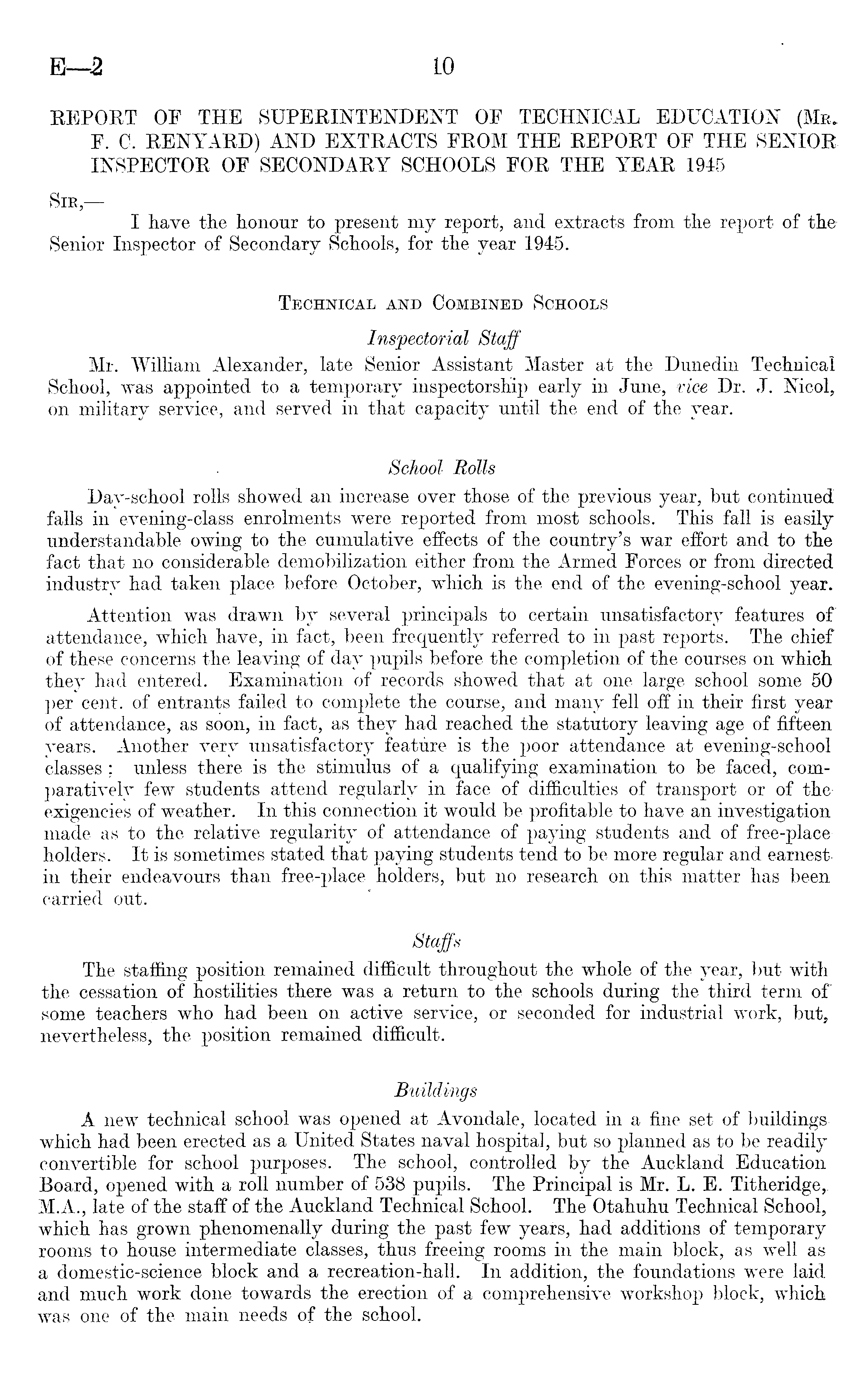 REPORT OF THE SUPERINTENDENT OF TECHNICAL EDUCATION (Mb, F. C. RENYARD) AND EXTRACTS FROM THE REPORT OF THE SENIOR. INSPECTOR OF SECONDARY SCHOOLS FOR THE YEAR 1945 Sir, — I have the honour to present my report, and extracts from the report of the Senior Inspector of Secondary Schools, for the year 1945. Technical and Combined Schools Inspectorial Staff Mr. William Alexander, late Senior Assistant Master at the Dunedin Technical School, was appointed to a temporary inspectorship early in June, vice Dr. J. Nicol, on military service, and served in that capacity until the end of the year. School Rolls Day-school rolls showed an increase over those of the previous year, but continued falls in evening-class enrolments were reported from most schools. This fall is easily understandable owing to the cumulative effects of the country's war effort and to the fact that no considerable demobilization either from the Armed Forces or from directed industry had taken place before October, which is the end of the evening-school year. Attention was drawn by several principals to certain unsatisfactory features of attendance, which have, in fact,, been frequently referred to in past reports. The chief of these concerns the leaving of day pupils before the completion of the courses on which they had entered. Examination of records showed that at one large school some 50 per cent, of entrants failed to complete the course, and many fell off in their first year of attendance, as soon, in fact, as they had reached the statutory leaving age of fifteen years. Another very unsatisfactory feature is the poor attendance at evening-school classes ; unless there is the stimulus of a qualifying examination to be faced, comparatively few students attend regularly in face of difficulties of transport or of the exigencies of weather. In this connection it would be profitable to have an investigation made as to the relative regularity of attendance of paying students and of free-place holders. It is sometimes stated that paying students tend to be more regular and earnest, in their endeavours than free-place holders, but no research on this matter has been carried out. Staffs The staffing position remained difficult throughout the whole of the year, but with the cessation of hostilities there was a return to the schools during the third term of some teachers who had been on active service, or seconded for industrial work, but, nevertheless, the position remained difficult. Buildings A new technical school was opened at Avondale, located in a fine set of buildingswhich had been erected as a United States naval hospital, but so planned as to be readily convertible for school purposes. The school, controlled by the Auckland Education Board, opened with a roll number of 538 pupils. The Principal is Mr. L. E. Titheridge,. M.A., late of the staff of the Auckland Technical School. The Otahuhu Technical School, which has grown phenomenally during the past few years, had additions of temporary rooms to house intermediate classes, thus freeing rooms in the main block, as well as a domestic-science block and a recreation-hall. In addition, the foundations were laid and much work done towards the erection of a comprehensive workshop block, which was one of the main needs of the school.