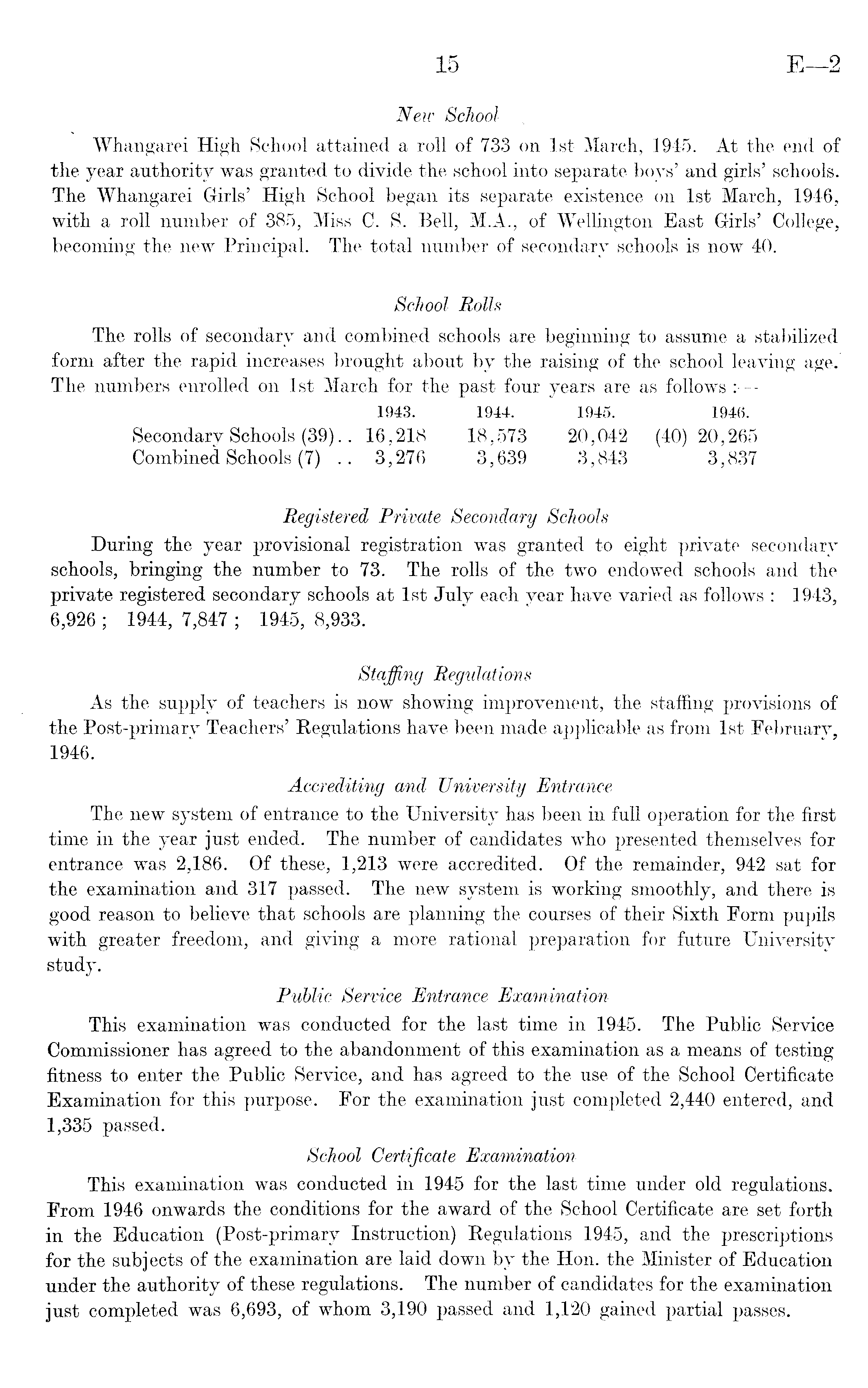 New School . Whangarei High School attained a roll of 733 on Ist March, 1945. At the end of the year authority was granted to divide the school into separate boys' and girls' schools. The Whangarei Girls' High School began its separate existence on Ist March, 1946, with a roll number of 385, Miss C. S. Bell, M.A., of Wellington East Girls' College, becoming the new Principal. The total number of secondary schools is now 40. School Rolls The rolls of secondary and combined schools are beginning to assume a stabilized form after the rapid increases brought about by the raising of the school leaving age. The numbers enrolled on Ist March for the past four years are as follows : 1943. 1944. 1945. 1946. Secondary Schools (39).. 16,218 18,573 20,042 (40) 20,265 Combined Schools (7) .. 3,276 3,639 3,843 3,837 Registered Private Secondary Schools During the year provisional registration was granted to eight private secondary schools, bringing the number to 73. The rolls of the two endowed schools and the private registered secondary schools at Ist July each year have varied as follows : 1943, 6,926 ; 1944, 7,847 ; 1945, 8,933. Staffing Regulations As the supply of teachers is now showing improvement, the staffing provisions of the Post-primary Teachers' Regulations have been made applicable as from Ist February, 1946. Accrediting and University Entrance The new system of entrance to the University has been in full operation for the first time in the year just ended. The number of candidates who presented themselves for entrance was 2,186. Of these, 1,213 were accredited. Of the remainder, 942 sat for the examination and 317 passed. The new system is working smoothly, and there is good reason to believe that schools are planning the courses of their Sixth Form pupils with greater freedom, and giving a more rational preparation for future University study. Public Service Entrance Examination This examination was conducted for the last time in 1945. The Public Service Commissioner has agreed to the abandonment of this examination as a means of testing fitness to enter the Public Service, and has agreed to the use of the School Certificate Examination for this purpose. For the examination just completed 2,440 entered, and 1,335 passed. School Certificate Examination This examination was conducted in 1945 for the last time under old regulations. From 1946 onwards the conditions for the award of the School Certificate are set forth in the Education (Post-primary Instruction) Regulations 1945, and the prescriptions for the subjects of the examination are laid down by the Hon. the Minister of Education under the authority of these regulations. The number of candidates for the examination just completed was 6,693, of whom 3,190 passed and 1,120 gained partial passes.