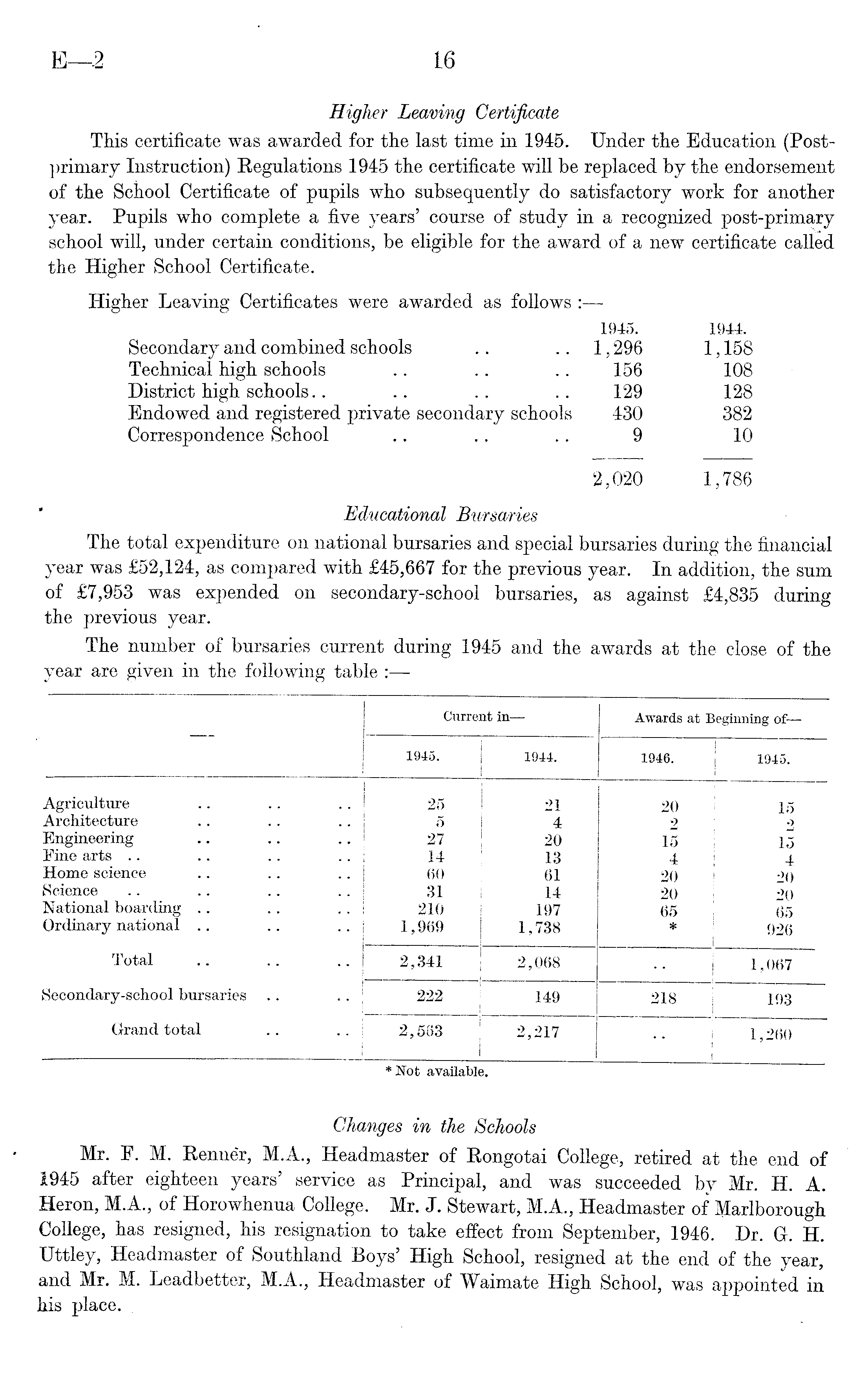 Higher Leaving Certificate This certificate was awarded for the last time in 1945. Under the Education (Postprimary Instruction) Regulations 1945 the certificate will be replaced by the endorsement of the School Certificate of pupils who subsequently do satisfactory work for another year. Pupils who complete a five years' course of study in a recognized post-primary school will, under certain conditions, be eligible for the award of a new certificate called the Higher School Certificate. Higher Leaving Certificates were awarded as follows : 1945. 1944. Secondary and combined schools .. .. 1,296 1,158 Technical high schools .. .. .. 156 108 District high schools.. .. .. .. 129 128 Endowed and registered private secondary schools 430 382 Correspondence School .. .. .. 9 10 2,020 1,786 Educational Bursaries The total expenditure on national bursaries and special bursaries during the financial year was £52,124, as compared with £45,667 for the previous year. In addition, the sum of £7,953 was expended on secondary-school bursaries, as against £4,835 during the previous year. The number of bursaries current during 1945 and the awards at the close of the year are given in the following table :